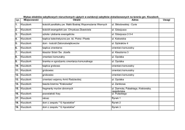 Lp. Wykaz obiektów zabytkowych nieruchomych ujętych w ewidencji zabytków zlokalizowanych na terenie gm. Kluczbork. Miejscowość Obiekt Adres 1. Kluczbork kościół parafialny pw. Matki Boskiej Wspomożenia Wiernych ul. Skłodowskiej - Curie 2. Kluczbork kościół ewangelicki pw. Chrystusa Zbawiciela ul. Gdacjusza 3. Kluczbork szkoła i plebania ewangelicka ul. Gdacjusza 2-3-4 4. Kluczbork kaplica katechetyczna pw. śś. Piotra i Pawła ul. Katowicka 5. Kluczbork dom - kościół Zielonoświątkowców ul. Sybiraków 4 6. Kluczbork kaplica cmentarna cmentarz komunalny 7. Kluczbork klasztor Sióstr Św. Józefa ul. Klasztorna 3 8. Kluczbork cmentarz komunalny ul. Opolska 9. Kluczbork bramka w ogrodzeniu cmentarza komunalnego ul. Opolska 10. Kluczbork kaplica grobowa cmentarz komunalny 11. Kluczbork grobowiec cmentarz komunalny 12. Kluczbork grobowiec cmentarz komunalny 13. Kluczbork cmentarz wojenny Armii Radzieckiej ul. Opolska 14. Kluczbork baszta bramna "Krakowska" ul. Zamkowa 15. Kluczbork fragmenty murów obronnych 16. Kluczbork pozostałość fosy ul. Damrota, Pułaskiego, Krakowska, Jagiellońska ul. Pułaskiego 17. Kluczbork ratusz Rynek 1 18. Kluczbork dom z zespołu "12 Apostołów" Rynek 2 19. Kluczbork dom z zespołu "12 Apostołów" Rynek 3 Uwagi 20. Kluczbork budynek starostwa ul. Katowicka 1 21. Kluczbork budynek administracyjny ul. Jagiellońska 3 22. Kluczbork Sąd Rejonowy ul. Katowicka 2 23. Kluczbork więzienie ul. Katowicka 4 24. Kluczbork ogrodzenie więzienia ul. Katowicka 4 25. Kluczbork willa ul. Chopina 1 26. Kluczbork szkoła ul. Ligonia 3 27. Kluczbork zakład dla ubogich ul. Zamkowa 8 28. Kluczbork 29. Kluczbork szpital ewangelicki szpital - budynek administracyjny ul. Skłodowskiej – Curie 23 ul. Skłodowskiej -Curie 30. Kluczbork ul. Skłodowskiej - Curie 31. Kluczbork szpital dla nerwowo chorych, Dom Macierzysty Diakonis "Betania" szpital - apteka i warsztat 32. Kluczbork szpital - budynek pralni ul. Skłodowskiej - Curie 33. Kluczbork budynek administracyjny ul. Moniuszki 2 34. Kluczbork dom ul. Byczyńska 1 35. Kluczbork dom ul. Byczyńska 2 36. Kluczbork dom ul. Byczyńska 3-5 37. Kluczbork dom ul. Byczyńska 4 38. Kluczbork dom ul. Byczyńska 6 39. Kluczbork szkoła ul. Byczyńska 7 40. Kluczbork budynek warsztatów szkolnych ul. Byczyńska 7 41. Kluczbork dom ul. Byczyńska 8 ul. Skłodowskiej - Curie 42. Kluczbork dom ul. Byczyńska 10-12 43. Kluczbork dom ul. Byczyńska 11 44. Kluczbork dom ul. Byczyńska 13 45. Kluczbork dom ul. Byczyńska 14 46. Kluczbork dom ul. Byczyńska 15 47. Kluczbork dom ul. Byczyńska 16 48. Kluczbork dom ul. Byczyńska 17 49. Kluczbork budynek gospodarczy ul. Byczyńska 15-17 50. Kluczbork dom ul. Byczyńska 21 51. Kluczbork dom ul. Byczyńska 22 52. Kluczbork budynek gospodarczy ul. Byczyńska 22-24 53. Kluczbork dom ul. Byczyńska 23-25 54. Kluczbork dom ul. Byczyńska 24 55. Kluczbork dom ul. Byczyńska 26 56. Kluczbork dom ul. Byczyńska 28 57. Kluczbork dom ul. Byczyńska 30 58. Kluczbork dom ul. Byczyńska 32 59. Kluczbork dom ul. Byczyńska 34 60. Kluczbork dom ul. Byczyńska 36 61. Kluczbork dom ul. Byczyńska 38 62. Kluczbork dom ul. Byczyńska 40 63. Kluczbork dom ul. Byczyńska 27 64. Kluczbork dom ul. Byczyńska 33-35 65. Kluczbork dom ul. Byczyńska 42 66. Kluczbork dom ul. Byczyńska 48 67. Kluczbork dom ul. Byczyńska 52 68. Kluczbork dom ul. Byczyńska 37-39 69. Kluczbork dom ul. Byczyńska 41 70. Kluczbork dom ul. Byczyńska 43-45 71. Kluczbork dom ul. Byczyńska 47-49 72. Kluczbork dom ul. Byczyńska 51-53 73. Kluczbork dom ul. Byczyńska 57 74. Kluczbork dom ul. Byczyńska 59-61 75. Kluczbork dom ul. Byczyńska 63 76. Kluczbork dom ul. Byczyńska 65-67 77. Kluczbork dom ul. Byczyńska 69-71 78. Kluczbork dom ul. Byczyńska 73-75 79. Kluczbork dom ul. Byczyńska 77 80. Kluczbork dom ul. Byczyńska 79-81 81. Kluczbork dom ul. Byczyńska 83 82. Kluczbork dom ul. Byczyńska 70 83. Kluczbork dom ul. Byczyńska 72-74 84. Kluczbork dom ul. Byczyńska 76-78 85. Kluczbork dom ul. Byczyńska 80-82 86. Kluczbork dom ul. Byczyńska 84 87. Kluczbork dom ul. Byczyńska 86 88. Kluczbork dom ul. Byczyńska 88-90 89. Kluczbork dom ul. Byczyńska 92 90. Kluczbork dom ul. Byczyńska 94-96 91. Kluczbork dom ul. Byczyńska 98-100 92. Kluczbork dom ul. Byczyńska 102-104 93. Kluczbork dom ul. Byczyńska 108-110 94. Bąków kościół p.w. Wniebowzięcia NMP ul. Braci Bassy 95. Bąków dom parafialny ul. Braci Bassy 96. Bąków pałac ul. Braci Bassy 18-20-22 97. Bąków park ul. Braci Bassy 98. Bąków dom i budynek gospodarczy ul. Braci Bassy 4 99. Bąków gorzelnia ul. Braci Bassy 23 100 . 101 . 102 . 103 . 104 . Bąków suszarnia lnu ul. Braci Bassy 24 Bąków dom robotników folwarcznych ul. Braci Bassy 28-30 Bąków rządcówka ul. Braci Bassy 32 Bąków dom dla służby sezonowej ul. Braci Bassy 34 Bąków obory w zespole folwarcznym ul. Braci Bassy 105 . 106 . 107 . 108 . 109 . 110 . 111 . 112 . 113 . 114 . 115 . 116 . 117 . 118 . 119 . 120 . 121 . 122 . 123 . 124 . 125 . Bąków stodoły w zespole folwarcznym ul. Braci Bassy Bąków spichlerz w zespole folwarcznym ul. Braci Bassy Bąków kuźnia i wozownia w zespole folwarcznym ul. Braci Bassy Bąków dom ul. Braci Bassy 47-49 Bąków dom i budynek gospodarczy ul. Kościuszki 31 Bąków dom ul. Leśna 3 Bąków dom ul. Leśna 5 Bąków dom i budynek gospodarczy ul. Leśna 16 Bąków dom ul. Szkolna 4-5 Bąków willa ul. Szkolna 2 Bąków dom ul. Wolności 1 Bąków dom wielorodzinny ul. Wolności 4 Bąków dom wielorodzinny i budynek gospodarczy ul. Wolności 6-8-10 Bąków dom ul. Wolności19 Bąków dom ul. Wolności 20 Bąków dom ul. Wolności 21 Bąków dom ul. Wolności 32-34 Bąków dom ul. Wolności 33 Bąków dom wielorodzinny z budynkami gospodarczymi ul. Wolności54-56 Bąków szkoła ewangelicka ul. Wolności Bąków dom ul. Wolności 72b 126 . 127 . 128 . 129 . Bąków owczarnia ul. Wolności72 Bąków budynek stacji PKP Bąków dom przy stacji PKP 
