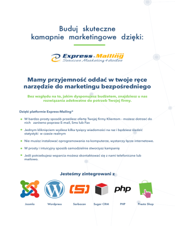 Buduj skuteczne kamapnie marketingowe dzięki: Mamy przyjemność oddać w twoje ręce narzędzie do marketingu bezpośredniego Bez względu na to, jakim dysponujesz budżetem, znajdziesz u nas rozwiązania adekwatne do potrzeb Twojej firmy. Dzięki platformie Express-Mailing® W bardzo prosty sposób prześlesz ofertę Twojej firmy Klientom - możesz dotrzeć do nich zarówno poprzez E-mail, Sms lub Fax Jednym kliknięciem wyślesz kilka tysięcy wiadomości na raz i będziesz śledzić statystyki w czasie realnym Nie musisz instalować oprogramowania na komputerze, wystarczy łącze internetowe. W prosty i intuicyjny sposób samodzielnie stworzysz kampanię Jeśli potrzebujesz wsparcia możesz skontaktować się z nami telefoniczne lub mailowo. Jesteśmy zintegrowani z Joomla Wordpress Sarbacan Sugar CRM PHP Presta Shop