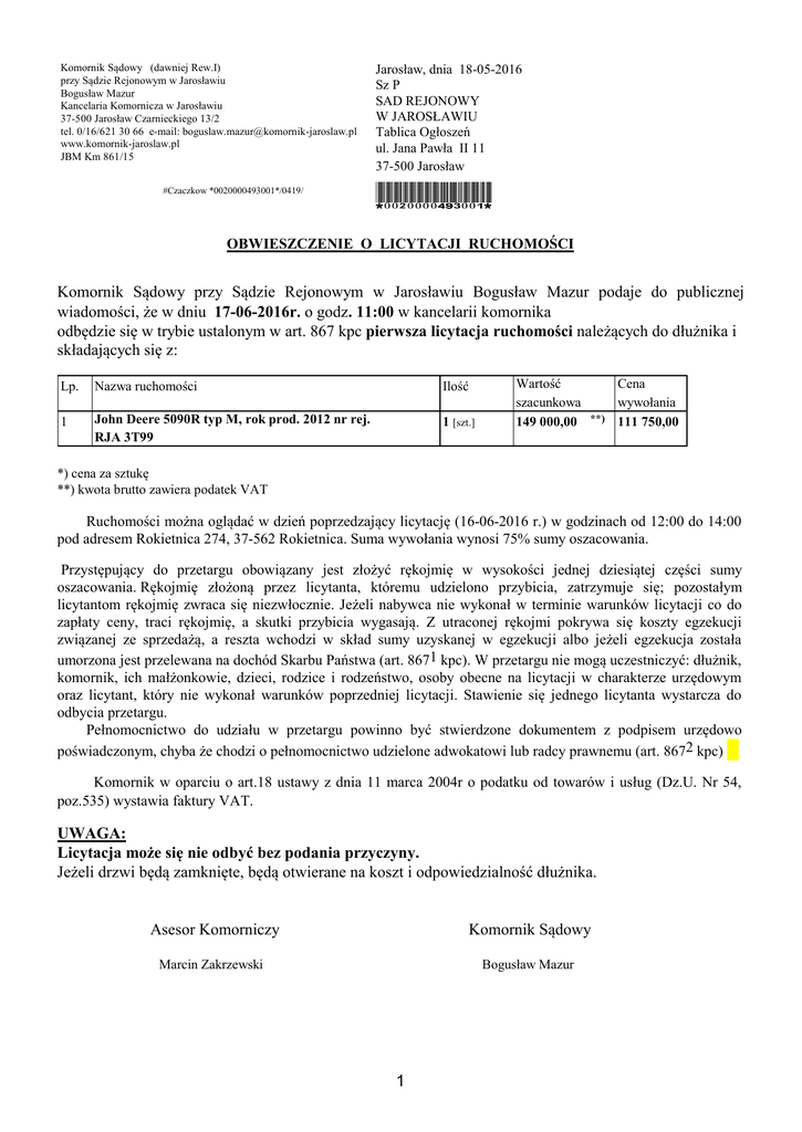 1 Komornik Sądowy przy Sądzie Rejonowym w Jarosławiu