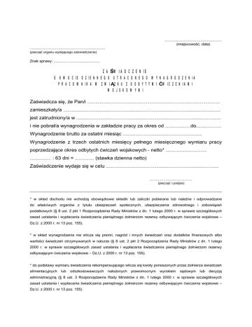 ...................................................... (miejscowo , data) ....................................................................... (piecz organu wydaj cego za wiadczenie) Znak sprawy: ............................................ ZA WIADCZENIE O KWOCIE DZIENNEGO UTRACONEGO WYNAGRODZENIA PRACOWNIKA W ZWI ZKU Z ODBYTYMI WICZENIAMI WOJSKOWYMI Za wiadcza si , e Pan/i .............................................................................................................................. zamieszka y/a ..................................................................................................................................................... jest zatrudniony/a w ......................................................................................................................................... i nie pobra /a wynagrodzenia w zak adzie pracy za okres od ........................do........................ Wynagrodzenie brutto za ostatni miesi c ........................................................................... Wynagrodzenie z trzech ostatnich miesi cy pe nego miesi cznego wymiaru pracy poprzedzaj ce okres odbytych wicze wojskowych - netto* ....................................... .................... : 63 dni = .................. (stawka dzienna netto) Za wiadczenie wydaje si w celu ........................................................................................................... ........................................ (piecz * w sk ad dochodu nie wchodz do w i podpis) obowi zkowe sk adki lub zaliczki pobierane lub nale ne i odprowadzane ciwych organów z tytu u ubezpiecze spo ecznych, ubezpieczenia zdrowotnego i zobowi za podatkowych (§ 8 ust. 2 pkt 1 Rozporz dzenia Rady Ministrów z dn. 1 lutego 2000 r. w sprawie szczegó owych zasad ustalania i wyp acania wiadczenia pieni nego nierzom rezerwy odbywaj cym wiczenia wojskowe – Dz.U. z 2000 r. nr 13 poz. 155). * w sk ad wynagrodzenia nie wlicza si premii, nagród i innych wiadcze oraz dodatków finansowych albo warto ci wiadcze otrzymywanych w naturze (§ 8 ust. 2 pkt 2 Rozporz dzenia Rady Ministrów z dn. 1 lutego 2000 r. w sprawie szczegó owych zasad ustalania i wyp acania wiadczenia pieni nego nierzom rezerwy odbywaj cym wiczenia wojskowe – Dz.U. z 2000 r. nr 13 poz. 155). * do podstawy wymiaru wiadczenia rekompensuj cego wlicza si kwoty ponoszonych przez alimentacyjnych lub odszkodowawczych na onych prawomocnym wyrokiem nierza wiadcze s dowym lub decyzj administracyjn (§ 8 ust. 3 Rozporz dzenia Rady Ministrów z dn. 1 lutego 2000 r. w sprawie szczegó owych zasad ustalania i wyp acania wiadczenia pieni Dz.U. z 2000 r. nr 13 poz. 155) nego nierzom rezerwy odbywaj cym wiczenia wojskowe –