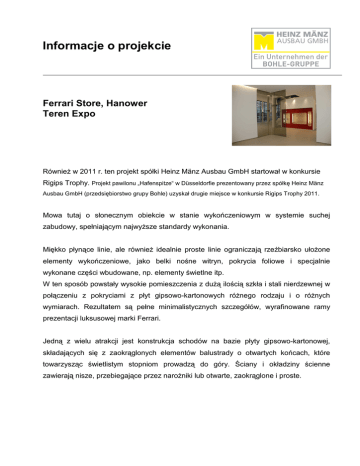 Informacje o projekcie Ferrari Store, Hanower Teren Expo Również w 2011 r. ten projekt spółki Heinz Mänz Ausbau GmbH startował w konkursie Rigips Trophy. Projekt pawilonu „Hafenspitze“ w Düsseldorfie prezentowany przez spółkę Heinz Mänz Ausbau GmbH (przedsiębiorstwo grupy Bohle) uzyskał drugie miejsce w konkursie Rigips Trophy 2011. Mowa tutaj o słonecznym obiekcie w stanie wykończeniowym w systemie suchej zabudowy, spełniającym najwyższe standardy wykonania. Miękko płynące linie, ale również idealnie proste linie ograniczają rzeźbiarsko ułożone elementy wykończeniowe, jako belki nośne witryn, pokrycia foliowe i specjalnie wykonane części wbudowane, np. elementy świetlne itp. W ten sposób powstały wysokie pomieszczenia z dużą ilością szkła i stali nierdzewnej w połączeniu z pokryciami z płyt gipsowo-kartonowych różnego rodzaju i o różnych wymiarach. Rezultatem są pełne minimalistycznych szczegółów, wyrafinowane ramy prezentacji luksusowej marki Ferrari. Jedną z wielu atrakcji jest konstrukcja schodów na bazie płyty gipsowo-kartonowej, składających się z zaokrąglonych elementów balustrady o otwartych końcach, które towarzysząc świetlistym stopniom prowadzą do góry. Ściany i okładziny ścienne zawierają nisze, przebiegające przez narożniki lub otwarte, zaokrąglone i proste. Ogólnie rzecz biorąc, powstał atrakcyjny obiekt w stanie wykończeniowym, przy czym we wszystkich szczegółach i widokach zachowano konieczną powściągliwość, aby uwypuklić produkt „Ferrari“.