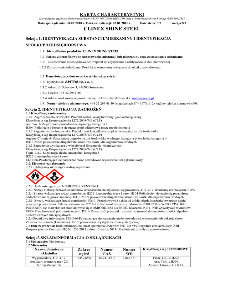 KARTA CHARAKTERYSTYKI Sporządzona zgodnie z Rozporządzeniem WE Nr 1907/2006 (REACH) oraz z Rozporządzeniem Komisji (UE) 2015/830 Data sporządzenia: 08.03.2010 r. Data aktualizacji: 03.01.2016 r. Ilość stron: 1/6 wersja:3.0 CLINEX SHINE STEEL Sekcja 1. IDENTYFIKACJA SUBSTANCJI/MIESZANINY I IDENTYFIKACJA SPÓŁKI/PRZEDSIĘBIORSTWA 1.1 Identyfikator produktu: CLINEX SHINE STEEL 1.2 Istotne zidentyfikowane zastosowania substancji lub mieszaniny oraz zastosowania odradzane: 1.2.1 Zastosowania zidentyfikowane: Preparat do czyszczenia i nabłyszczania stali nierdzewnej 1.2.2 Zastosowania odradzane: Produkt przeznaczony wyłącznie do użytku zawodowego. 1.3 Dane dotyczące dostawcy karty charakterystyki: 1.3.1Dystrybutor: AMTRA Sp. z o. o. 1.3.2 Adres: ul. Schonów 3, 41-200 Sosnowiec 1.3.3 Telefon +48 32 2944100 1.3.4 Adres email osoby odpowiedzialnej za kartę charakterystyki: [email protected] 1.4 Numer telefonu alarmowego: +48 32 294 41 30 (w godzinach 800- 1600), 112 ( ogólny telefon alarmowy),998 Sekcja 2. IDENTYFIKACJA ZAGROŻEŃ 2.1 Klasyfikacja mieszaniny: 2.1.1. Zagrożenia dla człowieka: Produkt został sklasyfikowany jako niebezpieczny Klasyfikacja wg Rozporządzenia 1272/2008/WE (CLP) Asp.Tox.1- Zagrożenie spowodowane aspiracją, kategoria 1 H304-Połknięcie i dostanie się przez drogi oddechowe może grozić śmiercią 2.1.2 Zagrożenie dla środowiska: Produkt jest klasyfikowany jako niebezpieczny dla środowiska. Klasyfikacja wg Rozporządzenia 1272/2008/WE (CLP) Aquatic Chronic 4- Stwarzające zagrożenie dla środowiska wodnego, kategoria przewlekła, kategoria 4 H413-Może powodować długotrwałe szkodliwe skutki dla organizmów wodnych 2.1.3 Zagrożenia wynikające z właściwości fizycznych i chemicznych: Klasyfikacja wg Rozporządzenia 1272/2008/WE (CLP) Flam. Liq.3-Substancja ciekła łatwopalna, kategoria 3 H226- Łatwopalna ciecz i pary EUH066-Powtarzające się narażenie może powodować wysuszanie lub pękanie skóry 2.2. Elementy oznakowania: 2.2.1 Piktogramy określające rodzaj zagrożenia: 2.2.2 Hasła ostrzegawcze: NIEBEZPIECZEŃSTWO 2.2.3 Nazwy niebezpiecznych składników umieszczone na etykiecie: węglowodory, C11-C12, izoalkany aromatyczne < 2% 2.2.4 Zwroty wskazujące rodzaj zagrożenia: H226- Łatwopalna ciecz i pary. H304-Połknięcie i dostanie się przez drogi oddechowe może grozić śmiercią. H413-Może powodować długotrwałe szkodliwe skutki dla organizmów wodnych. 2.2.5 Zwroty wskazujące środki ostrożności: P210- Przechowywać z dala od źródeł ciepła/iskrzenia/otwartego ognia/ gorących powierzchni. Palenie wzbronione. P273- Unikać uwolnienia do środowiska. P301+P310- W PRZYPADKU POŁKNIĘCIA: Natychmiast skontaktować się z OŚRODKIEM ZATRUĆ/ lekarzem. P331- NIE wywoływać wymiotów. P405- Przechowywać pod zamknięciem. P501- Zawartość/ pojemnik usuwać do usuwać do punktów zbiórki odpadów niebezpiecznych lub specjalnych. 2.2.4Dodatkowe informacje: EUH066-Powtarzające się narażenie może powodować wysuszanie lub pękanie skóry Zawiera d-Limonen (Limonene). Może powodować wystąpienie reakcji alergicznej. 2.3 Inne zagrożenia: Brak informacji na temat spełniania kryteriów PBT lub vPvB zgodnie z załącznikiem XIII Rozporządzenia Komisji (UE) Nr 253/2011 z dnia 15 marca 2011r. Badania nie zostały przeprowadzone. Sekcja3.SKŁAD/INFORMACJA O SKŁĄDNIKACH 3.1 Substancje: Nie dotyczy 3.2 Mieszaniny: Nazwa chemiczna składnika Zakres stężeń Numer CAS Numer WE Klasyfikacja wg 1272/2008/WE Węglowodory, C11-C12, izoalkany aromatyczne <2% Nr rejestracji: 01- 64%-65% 64741-65-7 918-167-1 Flam. Liq..3; H226 Asp. Tox.1; H304 Aquatic Chronic.4; H413, KARTA CHARAKTERYSTYKI Sporządzona zgodnie z Rozporządzeniem WE Nr 1907/2006 (REACH) oraz z Rozporządzeniem Komisji (UE) 2015/830 Data sporządzenia: 08.03.2010 r. Data aktualizacji: 03.01.2016 r. Ilość stron: 2/6 wersja:3.0 CLINEX SHINE STEEL 21194472146-39-0001 EUH 066 SEKCJA 4. ŚRODKI PIERWSZEJ POMOCY 4.1 Opis środków pierwszej pomocy: 4.1.1 Połknięcie: W razie połknięcia przepłukać jamę ustną, wyjąć protezy dentystyczne jeśli są. Przetransportować do najbliższej placówki medycznej celem podjęcia leczenia. Pokazać opakowanie lub etykietę. Jeśli wystąpią spontanicznie wymioty, trzymać głowę poniżej bioder. Nie wywoływać wymiotów. 4.1.2. Zatrucie inhalacyjne: Wynieść poszkodowanego z miejsca narażenia i zapewnić dostęp świeżego powietrza oraz spokój i odpoczynek. W przypadku dolegliwości (kaszel, wymioty, zawroty głowy, świszczący oddech) zapewnić pomoc lekarską. Nieprzytomnego ułożyć w pozycji bocznej. 4.1.3. Skażenie skóry: Zdjąć skażoną odzież. Skórę zmyć ciepłą wodą z mydłem. W razie wystąpienia podrażnienia skóry skontaktować się z lekarzem. 4.1.4.Skażenie oczu: Jeżeli poszkodowany nosi szkła kontaktowe niezwłocznie je wyjąć. Dokładnie przemyć oczy dużą ilością wody, wywijając powieki. Zapewnić pomoc okulisty. Uwaga: osoby narażone na skażenie oczu powinny być pouczone o konieczności i sposobie natychmiastowego płukania oczu 4.2 Najważniejsze ostre i opóźnione objawy oraz skutki narażenia: Zapalenie skóry może obejmować wrażenie pieczenia lub suchy/popękany wygląd skóry. Podrażnienie skóry może wrażenie pieczenia, zaczerwienienia, obrzęk lub pęcherze. Inne objawy centralnego układu nerwowego mogą obejmować ból głowy, nudności i brak koordynacji. Jeśli materiał przedostanie się do płuc, mogą się pojawić takie objawy jak kaszel, duszenie się, świszczący oddech, trudności z oddychaniem, przekrwienie klatki piersiowej, duszności lub gorączka. 4.3 Wskazania dotyczące wszelkiej natychmiastowej pomocy lekarskiej i szczególnego postępowania z poszkodowanym: Leczenie objawowe. Podstawowy składnik wywołuje depresję centralnego układu nerwowego. Stany zapalne skóry mogą być rezultatem długotrwałego lub powtarzającego się narażenia n