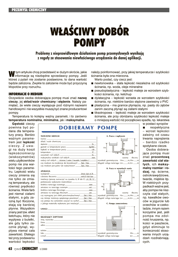 PRZEMYS£ CHEMICZNY W£AŒCIWY DOBÓR POMPY Problemy z nieprawid³owym dzia³aniem pomp przemys³owych wynikaj¹ z regu³y ze stosowania niew³aœciwego urz¹dzenia do danej aplikacji. W tym artykule chcę przedstawić w dużym skrócie, jakie informacje są niezbędne sprzedawcy pompy. Jeśli któreś z pytań nie zostanie postawione, to dana wartość będzie założona. Zwykle to założenie może być przyczyną kłopotów przy rozruchu. INFORMACJE O MEDIUM Oczywiście osoba dobierająca pompę musi znać nazwę cieczy, jej skład/wzór chemiczny i stężenie. Należy pamiętać, że wiele cieczy występuje pod różnymi nazwami handlowymi i nie wszystkie muszą być znane producentowi pompy. Temperatura to kolejny ważny parametr, i to zarówno temperatura nominalna, minimalna, jak i maksymalna. Gęstość cieczy powinna być podana dla temperatury pracy. Bardzo ważnym parametrem jest lepkość c i e c z y. Z u w a gi na duży koszt lepkościomierzy (wiskozymetrów) wielu użytkowników pomp nie zna wartości tego parametru. Lepkość wielu cieczy zmienia się nie tylko ze zmianą temperatury, ale również prędkości ścinania. Wiele farb jest niemal ciałami stałymi, a gdy zaczną być tłoczone, stają się bardziej płynne. Wszystkim znany jest tzw. efekt ketchupu, który nie wypływa z butelki, ale gdy tylko zacznie płynąć, wypływa niemal cała zawartość. Dlatego też przy podawaniu wartości lepkości 62 rynek CHEMICZNY 1/2000 należy poinformować, przy jakiej temperaturze i szybkości ścinania była ona mierzona. Warto podać, czy ciecz jest: newtonowska – stała lepkość niezależna od szybkości ścinania, np. woda, oleje mineralne pseudoplastyczna – lepkość maleje ze wzrostem szybkości ścinania, np. ketchup dylatacyjna – lepkość wzrasta ze wzrostem szybkości ścinania, np. niektóre bardzo stężone zawiesiny z PVC plastyczna – ma granice płynięcia, np. pasty do zębów zanim zaczną płynąć są ciałami stałymi tiksotropowa – lepkość maleje ze wzrostem szybkości ścinania, ale przy obniżaniu szybkości lepkość maleje o mniejszą wartość niż początkowo spadła, np. lekarstwa w postaci syropów reopektyczna – wzrost lepkości zależny od czasu trwania naprężenia – bardzo rzadko spotykane ciecze. Osoba dobierająca pompę musi znać procentową zawartość ciał stałych, ich maksymalny rozmiar i rodzaj, np. ścierne, ostrokrawędziowe, twarde, miękkie itp. W niektórych przypadkach ważne jest, aby pompa nie niszczyła ciał stałych, np. kawałków owoców w jogurcie lub orzechów w czekoladzie, innym razem korzystne jest, jeśli pompa ma zdolność kruszenia, np. kości w pasztecie, gdyż eliminuje to konieczność stosowania innych urządzeń rozdrabniających. PRZEMYS£ CHEMICZNY Niezwykle ważne dla doboru właściwego uszczelnienia jest odpowiedź na pytanie, czy medium ma tendencje do krystalizacji, a np. w produkcji szamponu, czy medium pieni się. Na koniec opisu medium trzeba podać, czy jest ono palne lub wybuchowe. INSTALACJA Podstawowa informacja, to wymagana wydajność (natężenie przepływu), czyli objętość cieczy w jednostce czasu. Ciśnienie tłoczenia można podać w jednostkach ciśnienia. Straty ciśnienia można obliczyć znając różnicę poziomów między zbiornikiem docelowym i pompą. Średnicę rurociągu, jego długość oraz rodzaj i liczbę armatury (kolanka, zawory, filtry, itp.) zawiera schemat instalacji. Przy liczeniu strat ciśnienia ważny jest rodzaj materiału (chropowatość), z jakiego wykonano instalację. Jedną z najważniejszych jest informacja o warunkach ssania pompy. Bardzo mylące jest określenie pompa samozasysająca. Przy określeniu wymagania ssania pompy należy podać, czy ma ona zasysać na sucho, czy też będzie każdorazowo zalewana i wyposażona w zawór stopowy. DOZOWANIE – DAWKOWANIE Często pompy stosowane są w instalacjach dozowania. Możliwe jest dozowanie stałe (pompa z regulowaną wydajnością) lub dozowanie wsadowe (dawkowanie) z możliwością zaprogramowania, np. dana dawka co jedną minutę. W aplikacjach dawkowania należy dodatkowo podać wielkość minimalnej i maksymalnej dawki oraz minimalną i maksymalną liczbę dawek w jednostce czasu. W wielu przypadkach klient ma wymaganą dokładność dozowania, która zdecydowanie wpływa na typ i cenę proponowanego urządzenia. Sterowanie pompy może być ręczne lub automatyczne. INFORMACJE DODATKOWE Jako informacje dodatkowe należy traktować wymagania dotyczące napędu (silnik elektryczny, elektryczny przeciwwybuchowy, napęd hydrauliczny, sprężone powietrze itd.). Klient musi poinformować dostawcę pomp o wszelkich innych wymaganiach, jak np. pompy o specjalnych konstrukcjach (np. wg standardu API, z certyfikatem farmaceutycznym 3-A itp.), brak pulsacji, konieczność tłoczenia delikatnego, mycie pompy w układzie automatycznym (tzw. CIP i SIP) itp. W wielu instalacjach zachodzi konieczność regularnego mycia zarówno rurociągów, jak i pomp. Dostawca urządzeń musi wiedzieć, jaką cieczą i w jakiej temperaturze będą myte pompy. Ważne jest także, czy klient chce pompę stacjonarną, przenośną lub przewoźną na kółkach. Niewątpliwą pomocą przy doborze pompy będą informacje o aktualnie używanej pompie i rodzaju występujących z nią problemów. ANDRZEJ G. BACIÑSKI PRZEMYS£ CHEMICZNY