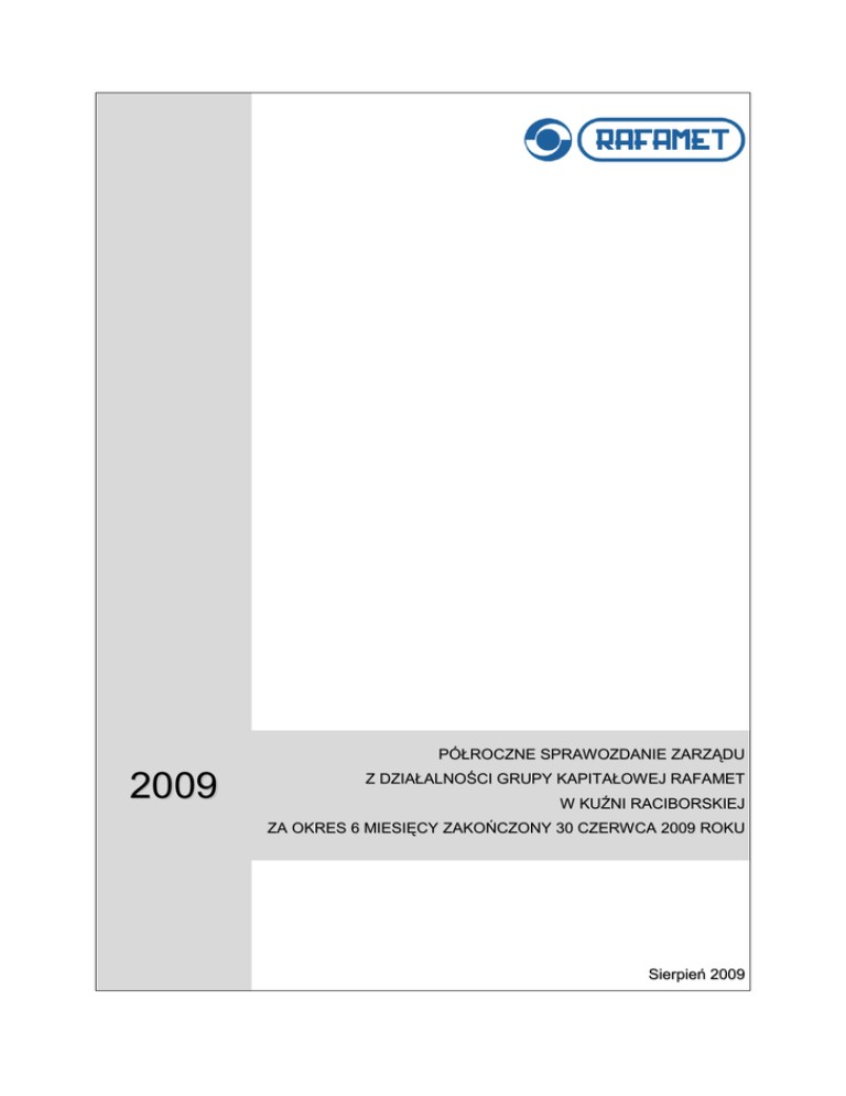 PÓŁROCZNE SPRAWOZDANIE ZARZĄDU 2009 Z DZIAŁALNOŚCI GRUPY KAPITAŁOW EJ RAFAMET W KUŹNI RACIBORSKIEJ ZA OKRES 6 MIESIĘCY ZAKOŃCZONY 30 CZERW CA 2009 ROKU Sierpień 2009 Półroczne sprawozdanie Zarządu z działalności Grupy Kapitałowej RAFAMET WSTĘP .............................................................................................................................................................................................. 3 1. STAN PRAWNY I CHARAKTERYSTYKA PODMIOTÓW GRUPY KAPITAŁOWEJ. ................................................................ 3 2. ORGANY PODMIOTÓW GRUPY KAPITAŁOWEJ. .................................................................................................................. 5 3. INFORMACJA O AKCJACH EMITENTA.................................................................................................................................. 6 4. INFORMACJA O POWIĄZANIACH ORGANIZACYJNYCH I KAPITAŁOWYCH. ..................................................................... 8 5. WSKAZANIE SKUTKÓW ZMIAN W STRUKTURZE JEDNOSTKI GOSPODARCZEJ, W TYM W WYNIKU POŁĄCZENIA JEDNOSTEK GOSPODARCZYCH, PRZEJĘCIA LUB SPRZEDAŻY GRUPY KAPITAŁOWEJ, INWESTYCJI DŁUGOTERMINOWYCH, PODZIAŁU, RESTRUKTURYZACJI I ZANIECHANIA. ................................................................... 9 6. ZASADY ZARZĄDZANIA PRZEDSIĘBIORSTWEM EMITENTA I JEGO GRUPĄ KAPITAŁOWĄ. .......................................... 9 7. SYTUACJA FINANSOWA. ....................................................................................................................................................... 9 7.1 7.2 7.3 7.4 7.5 7.6 7.7 7.8 7.9 7.10 Omówienie podstawowych wielkości ekonomiczno – finansowych.................................................................................... 9 Wskaźniki finansowe i niefinansowe. .............................................................................................................................. 14 Nietypowe zdarzenia mające wpływ na wynik finansowy Grupy Kapitałowej. .................................................................. 16 Aktualna i przewidywana sytuacja finansowa. ................................................................................................................. 17 Zarządzanie ryzykami finansowymi................................................................................................................................. 17 Ocena zarządzania zasobami finansowymi. ................................................................................................................... 18 Informacja o zaciągniętych i wypowiedzianych umowach dotyczących kredytów i pożyczek. .......................................... 19 Informacja o udzielonych pożyczkach. ............................................................................................................................ 20 Informacja o udzielonych i otrzymanych poręczeniach i gwarancjach. ............................................................................ 20 Realizacja prognoz wyników finansowych....................................................................................................................... 21 8. OPIS ISTOTNYCH CZYNNIKÓW RYZYKA I ZAGROŻEŃ. .................................................................................................... 21 9. INNE INFORMACJE ISTOTNE DLA OCENY SYTUACJI KADROWEJ, MAJĄTKOWEJ, FINANSOWEJ, WYNIKU FINANSOWEGO GRUPY KAPITAŁOWEJ RAFAMET I ICH ZMIAN ORAZ INFORMACJE, KTÓRE SĄ ISTOTNE DLA OCENY MOŻLIWOŚCI REALIZACJI ZOBOWIĄZAŃ PRZEZ GRUPĘ. .................................................................................. 24 10. CZYNNIKI, KTÓRE W OCENIE EMITENTA BĘDĄ MIAŁY WPŁYW NA OSIĄGNIĘTE PRZEZ GRUPĘ KAPITAŁOWĄ WYNIKI W PERSPEKTYWIE CO NAJMNIEJ KOLEJNEGO KWARTAŁU. ............................................................................ 25 11. OFEROWANE PRODUKTY, SPRZEDAŻ I RYNKI ZBYTU. ................................................................................................... 26 11.1 Produkty i usługi. ............................................................................................................................................................ 26 11.2 Struktura asortymentowa sprzedaży. .............................................................................................................................. 31 11.3 Informacje o rynkach zbytu z uwzględnieniem podziału na rynki krajowe i zagraniczne. ................................................. 32 12. INWESTYCJE. ........................................................................................................................................................................ 34 13. ZAOPATRZENIE. ................................................................................................................................................................... 35 14. ZATRUDNIENIE I WYNAGRODZENIA. .................................................................................................................................. 36 15. WYNAGRODZENIA OSÓB ZARZĄDZAJĄCYCH I NADZORUJĄCYCH. .............................................................................. 37 16. INFORMACJA O WSZELKICH UMOWACH ZAWARTYCH Z OSOBAMI ZARZĄDZAJĄCYMI. ............................................ 38 17. INFORMACJA O ŁĄCZNEJ LICZBIE I WARTOŚCI NOMINALNEJ AKCJI EMITENTA, BĘDĄCYCH W POSIADANIU OSÓB ZARZĄDZAJĄCYCH I NADZORUJĄCYCH. .......................................................................................................................... 38 18. TRANSAKCJE ZAWARTE PRZEZ EMITENTA Z PODMIOTAMI POWIĄZANYMI NA INNYCH WARUNKACH NIŻ RYNKOWE. ............................................................................................................................................................................ 39 19. INFORMACJE O POSTĘPOWANIACH SĄDOWY