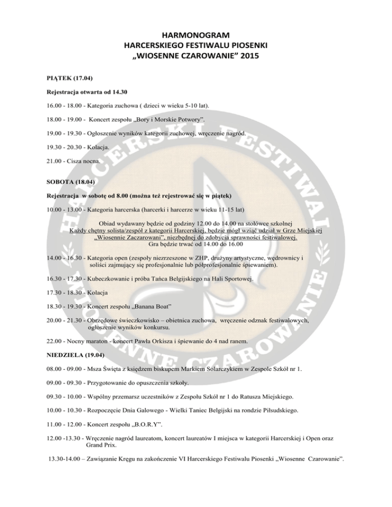 HARMONOGRAM HARCERSKIEGO FESTIWALU PIOSENKI „WIOSENNE CZAROWANIE” 2015 PIĄTEK (17.04) Rejestracja otwarta od 14.30 16.00 - 18.00 - Kategoria zuchowa ( dzieci w wieku 5-10 lat). 18.00 - 19.00 - Koncert zespołu „Bory i Morskie Potwory”. 19.00 - 19.30 - Ogłoszenie wyników kategorii zuchowej, wręczenie nagród. 19.30 - 20.30 - Kolacja. 21.00 - Cisza nocna. SOBOTA (18.04) Rejestracja w sobotę od 8.00 (można też rejestrować się w piątek) 10.00 - 13.00 - Kategoria harcerska (harcerki i harcerze w wieku 11-15 lat) Obiad wydawany będzie od godziny 12.00 do 14.00 na stołówce szkolnej Każdy chętny solista/zespół z kategorii Harcerskiej, będzie mógł wziąć udział w Grze Miejskiej „Wiosennie Zaczarowani”, niezbędnej do zdobycia sprawności festiwalowej. Gra będzie trwać od 14.00 do 16.00 14.00 - 16.30 - Kategoria open (zespoły niezrzeszone w ZHP, drużyny artystyczne, wędrownicy i soliści zajmujący się profesjonalnie lub półprofesjonalnie śpiewaniem). 16.30 - 17.30 - Kubeczkowanie i próba Tańca Belgijskiego na Hali Sportowej. 17.30 - 18.30 - Kolacja 18.30 - 19.30 - Koncert zespołu „Banana Boat” 20.00 - 21.30 - Obrzędowe świeczkowisko – obietnica zuchowa, wręczenie odznak festiwalowych, ogłoszenie wyników konkursu. 22.00 - Nocny maraton - koncert Pawła Orkisza i śpiewanie do 4 nad ranem. NIEDZIELA (19.04) 08.00 - 09.00 - Msza Święta z księdzem biskupem Markiem Solarczykiem w Zespole Szkół nr 1. 09.00 - 09.30 - Przygotowanie do opuszczenia szkoły. 09.30 - 10.00 - Wspólny przemarsz uczestników z Zespołu Szkół nr 1 do Ratusza Miejskiego. 10.00 - 10.30 - Rozpoczęcie Dnia Galowego - Wielki Taniec Belgijski na rondzie Piłsudskiego. 11.00 - 12.00 - Koncert zespołu „B.O.R.Y”. 12.00 -13.30 - Wręczenie nagród laureatom, koncert laureatów I miejsca w kategorii Harcerskiej i Open oraz Grand Prix. 13.30-14.00 – Zawiązanie Kręgu na zakończenie VI Harcerskiego Festiwalu Piosenki „Wiosenne Czarowanie”.