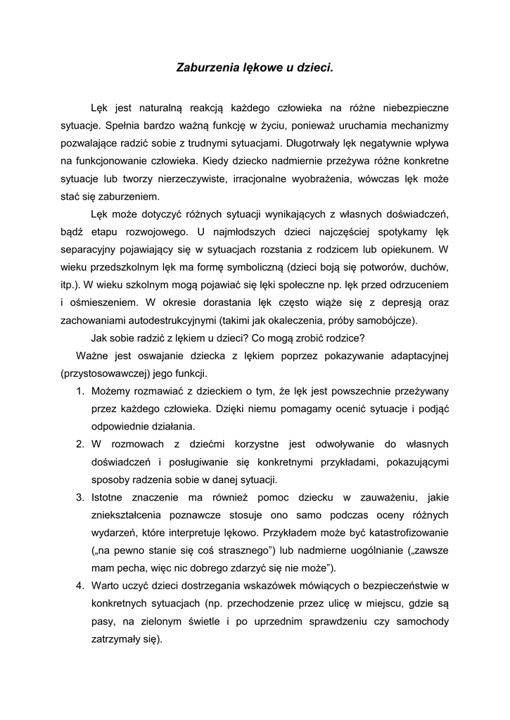 Zaburzenia lękowe u dzieci. Lęk jest naturalną reakcją każdego człowieka na różne niebezpieczne sytuacje. Spełnia bardzo ważną funkcję w życiu, ponieważ uruchamia mechanizmy pozwalające radzić sobie z trudnymi sytuacjami. Długotrwały lęk negatywnie wpływa na funkcjonowanie człowieka. Kiedy dziecko nadmiernie przeżywa różne konkretne sytuacje lub tworzy nierzeczywiste, irracjonalne wyobrażenia, wówczas lęk może stać się zaburzeniem. Lęk może dotyczyć różnych sytuacji wynikających z własnych doświadczeń, bądź etapu rozwojowego. U najmłodszych dzieci najczęściej spotykamy lęk separacyjny pojawiający się w sytuacjach rozstania z rodzicem lub opiekunem. W wieku przedszkolnym lęk ma formę symboliczną (dzieci boją się potworów, duchów, itp.). W wieku szkolnym mogą pojawiać się lęki społeczne np. lęk przed odrzuceniem i ośmieszeniem. W okresie dorastania lęk często wiąże się z depresją oraz zachowaniami autodestrukcyjnymi (takimi jak okaleczenia, próby samobójcze). Jak sobie radzić z lękiem u dzieci? Co mogą zrobić rodzice? Ważne jest oswajanie dziecka z lękiem poprzez pokazywanie adaptacyjnej (przystosowawczej) jego funkcji. 1. Możemy rozmawiać z dzieckiem o tym, że lęk jest powszechnie przeżywany przez każdego człowieka. Dzięki niemu pomagamy ocenić sytuacje i podjąć odpowiednie działania. 2. W rozmowach z dziećmi korzystne jest odwoływanie do własnych doświadczeń i posługiwanie się konkretnymi przykładami, pokazującymi sposoby radzenia sobie w danej sytuacji. 3. Istotne znaczenie ma również pomoc dziecku w zauważeniu, jakie zniekształcenia poznawcze stosuje ono samo podczas oceny różnych wydarzeń, które interpretuje lękowo. Przykładem może być katastrofizowanie („na pewno stanie się coś strasznego”) lub nadmierne uogólnianie („zawsze mam pecha, więc nic dobrego zdarzyć się nie może”). 4. Warto uczyć dzieci dostrzegania wskazówek mówiących o bezpieczeństwie w konkretnych sytuacjach (np. przechodzenie przez ulicę w miejscu, gdzie są pasy, na zielonym świetle i po uprzednim sprawdzeniu czy samochody zatrzymały się). 5. Możemy systematycznie konfrontować dziecko z sytuacjami, których dotąd unikało z powodu lęku (zaczynamy zawsze od tych łatwiejszych, a na trudniejszych kończymy). Tego typu konfrontacje nigdy nie mogą dotyczyć sytuacji niebezpiecznych, a jedynie takich, które realnie są bezpieczne, a lęk im towarzyszący wynika tylko z nieprawidłowej ich interpretacji przez dziecko. 6. Należy pamiętać, aby właściwie różnicować lęki i obawy charakterystyczne dla prawidłowego rozwoju dziecka, od tych, które są nadmiernie nasilone. Ważna jest także rola środowiska szkolnego, a szczególnie nauczycieli i opiekunów. Szkoła jest miejscem o ściśle określonych zasadach, wymaganiach i oczekiwaniach. W momencie rozpoczęcia przez dziecko nauki, szkoła może wzbudzać wiele obaw i lęków. Należy wówczas pomóc dziecku sprostać wymaganiom edukacyjnym i rówieśniczym, a tym samym ułatwić jego funkcjonowanie i zapobiec rozwinięciu się u niego w przyszłości zaburzeń lekowych. Zaburzenia lękowe są jednym z częstszych powodów zgłaszania dzieci do leczenia specjalistycznego. Bardzo ważne jest wczesne rozpoznawanie problemów i szybkie na nie reagowanie (na przykład zgłaszanie się po pomoc do psychologa). Wcześnie podejmowane interwencje, będą miały znaczenie profilaktyczne i oszczędzą wielu dzieciom i dorosłym niepotrzebnych cierpień. Psycholog Dorota Marut