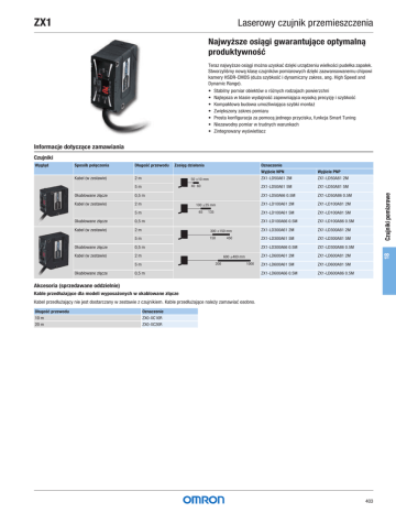 ZX1 Laserowy czujnik przemieszczenia Najwyższe osiągi gwarantujące optymalną produktywność Teraz najwyższe osiągi można uzyskać dzięki urządzeniu wielkości pudełka zapałek. Stworzyliśmy nową klasę czujników pomiarowych dzięki zaawansowanemu chipowi kamery HSDR-CMOS (duża szybkość i dynamiczny zakres, ang. High Speed and Dynamic Range). • • • • • • • Stabilny pomiar obiektów o różnych rodzajach powierzchni Najlepsza w klasie wydajność zapewniająca wysoką precyzję i szybkość Kompaktowa budowa umożliwiająca szybki montaż Zwiększony zakres pomiaru Prosta konfiguracja za pomocą jednego przycisku, funkcja Smart Tuning Niezawodny pomiar w trudnych warunkach Zintegrowany wyświetlacz Informacje dotyczące zamawiania Czujniki Długość przewodu Wyjście NPN Wyjście PNP Kabel (w zestawie) 2m 50 ±10 mm ZX1-LD50A61 2M ZX1-LD50A81 2M 5m 40 60 ZX1-LD50A61 5M ZX1-LD50A81 5M ZX1-LD50A66 0.5M ZX1-LD50A86 0.5M ZX1-LD100A61 2M ZX1-LD100A81 2M ZX1-LD100A61 5M ZX1-LD100A81 5M Okablowane złącze 0,5 m Kabel (w zestawie) 2m Zasięg działania Oznaczenie 100 ±35 mm 65 5m 135 Okablowane złącze 0,5 m ZX1-LD100A66 0.5M ZX1-LD100A86 0.5M Kabel (w zestawie) 2m 300 ±150 mm ZX1-LD300A61 2M ZX1-LD300A81 2M 5m 150 ZX1-LD300A61 5M ZX1-LD300A81 5M ZX1-LD300A66 0.5M ZX1-LD300A86 0.5M ZX1-LD600A61 2M ZX1-LD600A81 2M ZX1-LD600A61 5M ZX1-LD600A81 5M ZX1-LD600A66 0.5M ZX1-LD600A86 0.5M Okablowane złącze 0,5 m Kabel (w zestawie) 2m 600 ±400 mm 200 5m Okablowane złącze 450 1000 0,5 m Czujniki pomiarowe Sposób połączenia 18 Wygląd Akcesoria (sprzedawane oddzielnie) Kable przedłużające dla modeli wyposażonych w okablowane złącze Kabel przedłużający nie jest dostarczany w zestawie z czujnikiem. Kable przedłużające należy zamawiać osobno. Długość przewodu Oznaczenie 10 m ZX0-XC10R 20 m ZX0-XC20R 403 ZX1 Laserowy czujnik przemieszczenia Dane techniczne Model Wyjście NPN ZX1-LD50A61 ZX1-LD50A66 ZX1-LD100A61 ZX1-LD100A66 ZX1-LD300A61 ZX1-LD300A66 ZX1-LD600A61 ZX1-LD600A66 Wyjście PNP Model ZX1-LD50A81 ZX1-LD50A86 ZX1-LD100A81 ZX1-LD100A86 ZX1-LD300A81 ZX1-LD300A86 ZX1-LD600A81 ZX1-LD600A86 Zakres pomiaru 50±10 mm 10±35 mm 300±150 mm 600±400 mm Źródło światła (długość fali) Laser półprzewodnikowy światła widzialnego (długość fali: 660 nm, maks. 1 mW, IEC/EN klasa 2, FDA klasa II, *1) Średnica plamki (typowa) (Zmierzona w odległości do środka pomiaru *2) Ø 0,17 mm Napięcie zasilania 10–30 VDC, w tym 10% pulsacja (p-p) Pobór prądu 250 mA maks. (przy napięciu zasilania 10 VDC) Wyjście sterujące Napięcie zasilania obciążenia: maks. 30 VDC, prąd obciążenia: maks. 100 mA (Napięcie szczątkowe: maks. 1 V (dla prądu obciążenia 10 mA lub mniej), maks. 2 V (dla prądu obciążenia mniejszego od 10 do 100 mA)) Wyjście analogowe Wyjście prądowe: od 4 do 20 mA, maksymalna rezystancja obciążenia: 300 Wskaźniki Wyświetlacz cyfrowy (czerwony), wskaźnik wyjścia (OUT1, OUT2) (pomarańczowy), wskaźnik resetowania zera (pomarańczowy), wskaźnik menu (pomarańczowy), wskaźnik włączenia lasera (zielony) i wskaźnik opcji Smart Tuning (niebieski) Czas odpowiedzi Ø 0,33 mm Wyjście progowe Tryb bardzo wysokiej szybkości (SHS): 1 ms Tryb wysokiej szybkości (HS): 10 ms Tryb standardowy (Stnd): 100 ms Wejście Laser OFF maks. 200 ms wejście resetowania zera maks. 200 ms Ø 0,52 mm Charakterystyka temperaturowa *3 0,03% pełnej skali/°C Liniowość *4 ±0,15% pełnej skali Rozdzielczość *5 2 μm Oświetlenie zewnętrzne Oświetlenie powierzchni odbierającej światło: 7500 lx lub mniej (światło sztuczne) Temperatura otoczenia Eksploatacja: od -10 do 55°C, składowanie: -15 do 70°C (bez oblodzenia i kondensacji) Wilgotność otoczenia Praca i składowanie: 35%–85% (bez kondensacji) Wytrzymałość dielektryczna 1000 VAC, 50/60 Hz, 1 min3 Odporność na wibracje (zniszczenie) 10–55 Hz, podwójna amplituda 1,5 mm przez 2 godz., każdorazowo w kierunkach X, Y i Z Odporność na uderzenie (zniszczenie) 500 m/s2 3 razy, każdorazowo w kierunkach X, Y i Z Stopień ochrony *6 IEC 60529, IP67 Sposób połączenia Model okablowany (standardowa długość kabla: 2 m, 5 m) Model z okablowanym złączem (standardowa długość kabla: 0,5 m) Ciężar (w opakowaniu/ tylko czujnik) Ø 0,56 mm 0,04% pełnej skali/°C 7 μm ±0,25% pełnej skali ±0,25% pełnej skali (200–600 mm) ±0,5% pełnej skali (cały zakres) 30 μm 80 μm Oświetlenie powierzchni odbierającej światło: 5000 lx lub mniej (światło sztuczne) Modele okablowane (2 m) ok. 240 g/ok. 180 g ok. 270 g/ok. 210 g Modele okablowane (5 m) ok. 450 g/ok. 330 g kk. 480 g/ok. 360 g Modele z okablowanymi złączami (0,5 m) ok. 170 g/ok. 110 g ok. 200 g/ok. 140 g Materiały Obudowa i osłona: PBT (Poli(tereftalan butylenu)), okno optyczne: szkło, kabel: PVC, Elementy otworu montażowego: SUS303 Akcesoria Instrukcja i tabliczka ostrzegawcza lasera (w języku angielskim) *1 *2 *3 *4 *5 *6 Zgodnie z przepisami Laser Notice No. 50 Amerykańskiej Agencji ds. Żywności i Leków, urządzenie spełnia kryteria normy EN60825-1 dla urządzeń 2 klasy. W planach zawiadomienie CDRH. (Center for Devices and Radiological Health) Średnica plamki: Zdefiniowana jako 1/e² (13,5%) centralnej intensywności w odległości środka pomiaru. W przypadku wycieku światła poza zdefiniowany obszar i dużego współczynnika odbicia otoczenia w stosunku do obiektu pomiarowego może wystąpić błędne wykrywanie. W przypadku obiektów o rozmiarach mniejszych niż średnica plamki prawidłowy pomiar może nie być możliwy. Charakterystyka temperaturowa: Wartość w przypadku ustalenia odległości między czujnikiem a standardowym obiektem pomiarowym Omron za pomocą aluminiowego uchwytu. (Zmierzona w odległości środka pomiaru) Liniowość: Wskazuje błąd odstępstwa od idealnie prostej linii przy pomiarze przemieszczenia standardowego obiektu pomiarowego Omron (białego, ceramiczneg