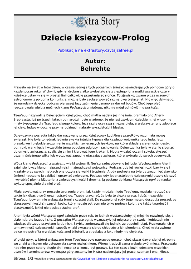 Dziecie ksiezycow-Prolog Publikacja na extrastory.czytajzafree.pl Autor: Behrehte Przyszła na świat w letni dzień, w czasie jednej z tych potężnych śnieżyc nawiedzających północne góry o każdej porze roku. W chwili, gdy jej drobne ciałko wydostało się z ciepłego łona matki wszystkie cztery księżyce ustawiły się w prostej linii całkowicie przesłaniając słońce. To zjawisko, zwane przez uczonych astronomów z południa koniunkcją, można było zaobserwować raz na dwa tysiące lat. Nic więc dziwnego, że narodziny dziecka podczas pierwszej fazy zaćmienia uznano za dar od bogów. Choć jego płeć rozczarowała wielu z możnych klanu Pędzących z wiatrem, nikt nie mógł odmówić mu boskości. Tseu’euu nazywali ją Dziecięciem Księżyców, choć matka nadała jej inne imię; brzmiało ono AheriiSrebrzysta. Już po trzech latach od narodzin było wiadomo, że nie jest zwykłym dzieckiem. Jej włosy nie miały typowego dla Tseu’euu siwego koloru, lecz raziły oczy swą śnieżną bielą, a srebrzyste runy zdobiące jej ciało, ledwo widoczne przy narodzinach nabrały wyrazistości i blasku. Dziewczynka posiadła także dar nazywany przez Księżycowy Lud Mową przodków; rozumiała mowę zwierząt. Nie była to jednak jedynie zwykła intuicja typowa dla każdego wojownika tego ludu, lecz prawdziwe i głębokie zrozumienie wszelkich zwierzęcych języków, na które składają się emocje, gesty, pomruki, warknięcia i wszystkie temu podobne odgłosy i zachowania. Dziewczynka była w stanie sięgnąć do umysłu zwierzęcia, scalić się z nim i kierować jego krokami. Mogła widzieć oczami sokoła, słyszeć uszami śnieżnego wilka lub wyczuwać zapachy otaczające zwierzę, które wybrała do swych obserwacji. Wódz klanu Pędzących z wiatrem, wielki wojownik Ner’su zadecydował o jej losie. Wychowaniem Aherii zajęli się łowcy klanu, najprzedniejsi i najmądrzejsi wojownicy. Podczas gdy jej rówieśniczki bawiły się i krzątały przy swych matkach ona uczyła się walki i tropienia. A gdy podrosła na tyle by zrozumieć zjawisko śmierci nauczono ją zabijać i oprawiać zwierzynę. Podczas gdy jedenastoletnie dziewczynki uczyły się szyć i wyrabiać piękną biżuterię, z zwierzęcych kości i drewna, ją posłano do klanu Płonących ogni po naukę i wykuty specjalnie dla niej oręż. Miała asystować przy procesie tworzenia broni, jak każdy młodzian ludu Tseu‘euu, musiała nauczyć się także jak dbać o swój oręż i ostrzyć go. Trzeba przyznać, że była to ciężka praca. I dość niezwykła. Tseu’euu, bowiem nie wykuwają broni z czystej stali. Do roztopionej rudy tego metalu dosypują proszek ze skruszonych kości śnieżnych kozic, który nadaje ostrzom nie tylko perłowy kolor, ale także twardość i elastyczność, jakiej nie posiada żadna broń. Aherii była wśród Płonących ogni zaledwie przez rok, to jednak wystarczyłoby jej mięśnie rozwinęły się, a ciało nabrało krzepy i siły. Z początku Płonące ognie wyznaczyły jej miejsce przy swoich kobietach nie wiedząc dlaczego przysłano ją do nich. Szybko zorientowali się jednak, że popełnili błąd. Przekonała ich o tym zwinność dziewczynki i sposób w jaki zwracała się do chłopców z ich plemienia. Choć miała zwinne palce nie potrafiła wyrabiać kościanej biżuterii, a strzelając z łuku nigdy nie chybiała. W głębi góry, w której wykuwano broń Tseu’euu było naprawdę gorąco i choć skwar dawał się jej okropnie we znaki w niczym nie ustępowała swym rówieśnikom. Wbrew tradycji sama wykuła swój miecz. Pracowała nad nim przez cztery długie dni i noce aż w końcu był gotowy. Na ten czas z kuźni odesłano wszelkich uczniów i terminatorów; wewnątrz góry został tylko Mistrz nadzorujący jej pracę, szaman i ona. Miecz, Strona: 1/3 Wszelkie prawa zastrzeżone dla CzytajZaFree | Zobacz opowiadanie na extrastory.czytajzafree.pl który wykuła był bronią dziwaczną i nietypową nikt jednak nie wątpił w jej skuteczność i przydatność. Choć miecze wykuwane przez Mistrzów z klanu Płonących ogni były bronią wspaniałą i niezawodną wielu z młodych Łowców grymasiło odbierając od nich swój własny oręż. Ich nie dopuszczono bowiem do paleniska; nie wykuli swej broni, jedynie pomagali przy jej tworzeniu; najczęściej pilnując odpowiedniej temperatury ognia. Co nie było zresztą trudne; kowalskie piece zasilała podziemna rzeka gęstej wulkanicznej lawy. Nie skarżyli się jednak głośno; Aherii była przecież boskim dzieckiem, miała swoje przywileje. Ojciec Dziecięcia Księżyców, szaman klanu, zwany przez wszystkich Dziki Wiatr nie przeciwstawiał się woli wodza, wręcz przeciwnie. Wielokrotnie mówił, iż jej przyszłość naznaczona jest krwią, a któżby inny mógł pozostawić za sobą krwawy ślad, jeśli nie wojownik i Łowca? Aherii była bardzo pracowitym dzieckiem i bardzo zdolną uczennicą. W wieku trzynastu lat była gotowa do Atsu’e, rytuału Wielkiego Polowania. Niestety wielki wódz Ner’su uznał, że nie jest jeszcze gotowa i musi poczekać… przynajmniej rok. Wielu wojowników, którzy szkolili Dziecię Księżyców wzburzyła ta decyzja. Wiedzieli, że jest gotowa, choć ma zaledwie trzynaście lat, a Atsu’e przechodzili dopiero chłopcy siedemnastoletni. Wódz pozostał niewzruszony nadal nie wierząc w jej umiejętności. Zmienił zdanie jakieś cztery miesiące później, gdy Aherii uratowała Pędzących z wiatrem od ataku Lazii- śnieżnych, mitycznych stworów. Każdy Tseu’euu wie, że Lazii istnieją, nikt jednak nigdy ich nie widział. Aż do dnia, w którym sfora śnieżnych potworów postanowiła zapolować na ludzi z klanu Dziecięcia Księżyców. Aherii wracała do osady po dwutygodniowym odosobnieniu, tak zwanym rytuale Oczyszczenia, które co jakiś czas przechodził każdy młody chłopiec będący już po zakończeniu nauki jednak przed Wielkim polowaniem. B