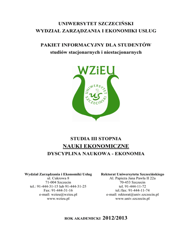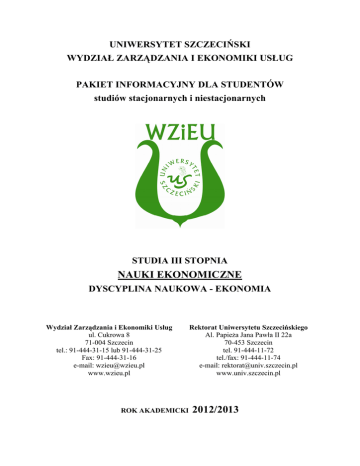 UNIWERSYTET SZCZECIŃSKI WYDZIAŁ ZARZĄDZANIA I EKONOMIKI USŁUG PAKIET INFORMACYJNY DLA STUDENTÓW studiów stacjonarnych i niestacjonarnych STUDIA III STOPNIA NAUKI EKONOMICZNE DYSCYPLINA NAUKOWA - EKONOMIA Wydział Zarządzania i Ekonomiki Usług ul. Cukrowa 8 71-004 Szczecin tel.: 91-444-31-15 lub 91-444-31-25 Fax: 91-444-31-16 e-mail: [email protected] www.wzieu.pl ROK AKADEMICKI Rektorat Uniwersytetu Szczecińskiego Al. Papieża Jana Pawła II 22a 70-453 Szczecin tel. 91-444-11-72 tel./fax: 91-444-11-74 e-mail: [email protected] www.univ.szczecin.pl 2012/2013 Spis treści EKONOMIA .............................................................................................................................. 3 EKONOMIA MATEMATYCZNA ........................................................................................... 5 EKONOMIA ZAAWANSOWANA .......................................................................................... 7 EMISJA GŁOSU........................................................................................................................ 9 ETYKA .................................................................................................................................... 12 FINANSE ................................................................................................................................. 14 FINANSE BEHAWIORALNE ................................................................................................ 17 FINANSE SEKTORA PUBLICZNEGO ................................................................................. 19 GOSPODARKA TURYSTYCZNA ........................................................................................ 21 INFORMATYKA W BADANIACH NAUKOWYH.............................................................. 23 INNOWACJE W SEKTORZE USŁUG .................................................................................. 26 JĘZYK OBCY.......................................................................................................................... 29 KOMUNIKACJA INTERPERSONALNA ............................................................................. 36 METODOLOGIA NAUK EKONOMICZNYCH ................................................................... 38 METODYKA PRACY NAUKOWEJ ..................................................................................... 40 NOWE TECHNOLOGIE WYKORZYSTYWANE W KSZTAŁCENIU .............................. 42 PEDAGOGIKA Z ELEMENTAMI PSYCHOLOGII ............................................................. 45 PODSTAWY DYDAKTYKI OGÓLNEJ ................................................................................ 46 POLITYKA GOSPODARCZA ............................................................................................... 47 POLITYKA ROZWOJU TRANSPORTU............................................................................... 49 PRAKTYKI ZAWODOWE ..................................................................................................... 51 PROBLEMY EKONOMII SPOŁECZNEJ .............................................................................. 53 SEMINARIUM DOKTORSKIE.............................................................................................. 55 SOCJOLOGIA ......................................................................................................................... 57 STATYSTYCZNA ANALIZA ZJAWISK GOSPODARCZYCH I SPOŁECZNYCH.......... 59 STRATEGIE SIECI DOSTAW ............................................................................................... 61 WARSZTATY EKONOMICZNE ........................................................................................... 63 WSPÓŁCZESNA GOSPODARKA ŚWIATOWA ................................................................. 64 WSPÓŁCZESNE KONCEPCJE I SYSTEMY MARKETINGU ............................................ 66 WSPÓŁCZESNE TEORIE EKONOMICZNE ........................................................................ 68 WSPÓŁCZESNE TEORIE PRZEDSIĘBIORSTWA ............................................................. 70 2 EKONOMIA i Programów Kształcenia Wypełnia Zespół ds. Jakości Nazwa przedmiotu: Ekonomia Kod przedmiotu: 14.3VI_III03_03 Nazwa jednostki prowadzącej przedmiot / moduł: Wydział Zarządzania i Ekonomiki Usług, Katedra Ekonomii Forma studiów: Studia III stopnia Dziedzina nauki/ dziedzina sztuki: stacjonarne i niestacjonarne Nauki ekonomiczne Dyscyplina naukowa/ dyscyplina artystyczna: Ekonomia Rok / semestr: Status przedmiotu /modułu: Język przedmiotu / modułu: rok 1 i 2, semestr 2 i 3 obowiązkowy polski Forma zajęć wykład Wymiar zajęć ćwiczenia ćwiczenia laboratoryjne konwersatorium seminarium 30 Koordynator przedmiotu / modułu Dr hab. prof. US Grażyna Wolska Wykłady: dr hab. prof. US Grażyna Wolska, [email protected] Prowadzący zajęcia Cel przedmiotu / modułu Przedstawienie w sposób wyczerpujący i przejrzysty podstawowych zagadnień z zakresu tzw. głównego nurtu współczesnych teorii mikro- i makroekonomii oraz jej praktycznego zastosowania w gospodarce. Wymagania wstępne Wiedza z zakresu podstaw ekonomii Odniesienie do efektów dla programu EFEKTY KSZTAŁCENIA Wiedza 01Doktorant umie prawidłowo objaśniać takie pojęcia jak: przedmiot badań ekonomii, jej główne narzędzia analizy oraz podstawowe kategorie ekonomiczne. 02 Nazywa i prawidłowo interpretuje zagadnienia z zakresu mikro- i makroekonomii, mezoekonomii i ekonomii globalnej. Umiejętności Kompetencje społeczne inne (wpisać jakie) 03 Doktorant gospodarczej. potrafi wiedzę teoretyczną odnieść do E3_W01 E3_W02 praktyki 04 Jest zdolny do zbierania i opracowywania materiałów potrzebnych do prowadzenia analiz ekonomicznych. E3_U02 05 Doktorant umie zainicjować i poprowadzić dyskusję na temat ekonomii jako nauki i jej relacjach: z decyzjami gospodarczymi podmiotów rynkowych, zmianami społecznymi, kulturowymi, politycznymi, techniczn