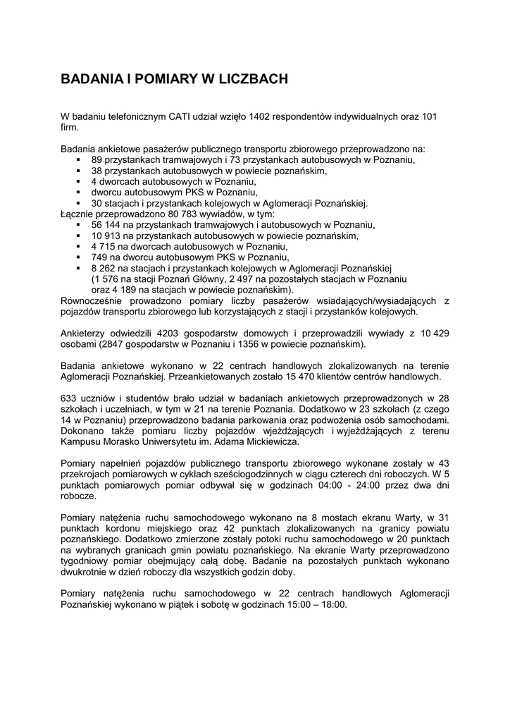 BADANIA I POMIARY W LICZBACH W badaniu telefonicznym CATI udział wzięło 1402 respondentów indywidualnych oraz 101 firm. Badania ankietowe pasażerów publicznego transportu zbiorowego przeprowadzono na: 89 przystankach tramwajowych i 73 przystankach autobusowych w Poznaniu, 38 przystankach autobusowych w powiecie poznańskim, 4 dworcach autobusowych w Poznaniu, dworcu autobusowym PKS w Poznaniu, 30 stacjach i przystankach kolejowych w Aglomeracji Poznańskiej. Łącznie przeprowadzono 80 783 wywiadów, w tym: 56 144 na przystankach tramwajowych i autobusowych w Poznaniu, 10 913 na przystankach autobusowych w powiecie poznańskim, 4 715 na dworcach autobusowych w Poznaniu, 749 na dworcu autobusowym PKS w Poznaniu, 8 262 na stacjach i przystankach kolejowych w Aglomeracji Poznańskiej (1 576 na stacji Poznań Główny, 2 497 na pozostałych stacjach w Poznaniu oraz 4 189 na stacjach w powiecie poznańskim). Równocześnie prowadzono pomiary liczby pasażerów wsiadających/wysiadających z pojazdów transportu zbiorowego lub korzystających z stacji i przystanków kolejowych. Ankieterzy odwiedzili 4203 gospodarstw domowych i przeprowadzili wywiady z 10 429 osobami (2847 gospodarstw w Poznaniu i 1356 w powiecie poznańskim). Badania ankietowe wykonano w 22 centrach handlowych zlokalizowanych na terenie Aglomeracji Poznańskiej. Przeankietowanych zostało 15 470 klientów centrów handlowych. 633 uczniów i studentów brało udział w badaniach ankietowych przeprowadzonych w 28 szkołach i uczelniach, w tym w 21 na terenie Poznania. Dodatkowo w 23 szkołach (z czego 14 w Poznaniu) przeprowadzono badania parkowania oraz podwożenia osób samochodami. Dokonano także pomiaru liczby pojazdów wjeżdżających i wyjeżdżających z terenu Kampusu Morasko Uniwersytetu im. Adama Mickiewicza. Pomiary napełnień pojazdów publicznego transportu zbiorowego wykonane zostały w 43 przekrojach pomiarowych w cyklach sześciogodzinnych w ciągu czterech dni roboczych. W 5 punktach pomiarowych pomiar odbywał się w godzinach 04:00 - 24:00 przez dwa dni robocze. Pomiary natężenia ruchu samochodowego wykonano na 8 mostach ekranu Warty, w 31 punktach kordonu miejskiego oraz 42 punktach zlokalizowanych na granicy powiatu poznańskiego. Dodatkowo zmierzone zostały potoki ruchu samochodowego w 20 punktach na wybranych granicach gmin powiatu poznańskiego. Na ekranie Warty przeprowadzono tygodniowy pomiar obejmujący całą dobę. Badanie na pozostałych punktach wykonano dwukrotnie w dzień roboczy dla wszystkich godzin doby. Pomiary natężenia ruchu samochodowego w 22 centrach handlowych Aglomeracji Poznańskiej wykonano w piątek i sobotę w godzinach 15:00 – 18:00.
