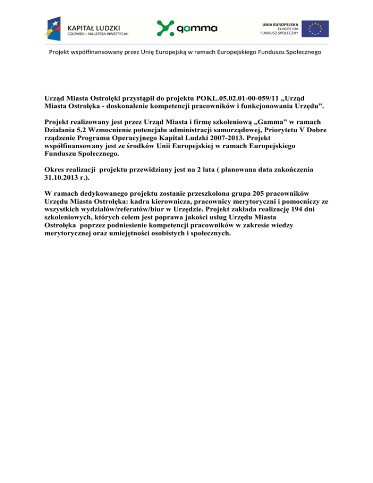 Projekt współfinansowany przez Unię Europejską w ramach Europejskiego Funduszu Społecznego Urząd Miasta Ostrołęki przystąpił do projektu POKL.05.02.01-00-059/11 „Urząd Miasta Ostrołęka - doskonalenie kompetencji pracowników i funkcjonowania Urzędu”. Projekt realizowany jest przez Urząd Miasta i firmę szkoleniową „Gamma” w ramach Działania 5.2 Wzmocnienie potencjału administracji samorządowej, Priorytetu V Dobre rządzenie Programu Operacyjnego Kapitał Ludzki 2007-2013. Projekt współfinansowany jest ze środków Unii Europejskiej w ramach Europejskiego Funduszu Społecznego. Okres realizacji projektu przewidziany jest na 2 lata ( planowana data zakończenia 31.10.2013 r.). W ramach dedykowanego projektu zostanie przeszkolona grupa 205 pracowników Urzędu Miasta Ostrołęka: kadra kierownicza, pracownicy merytoryczni i pomocniczy ze wszystkich wydziałów/referatów/biur w Urzędzie. Projekt zakłada realizację 194 dni szkoleniowych, których celem jest poprawa jakości usług Urzędu Miasta Ostrołęka poprzez podniesienie kompetencji pracowników w zakresie wiedzy merytorycznej oraz umiejętności osobistych i społecznych.