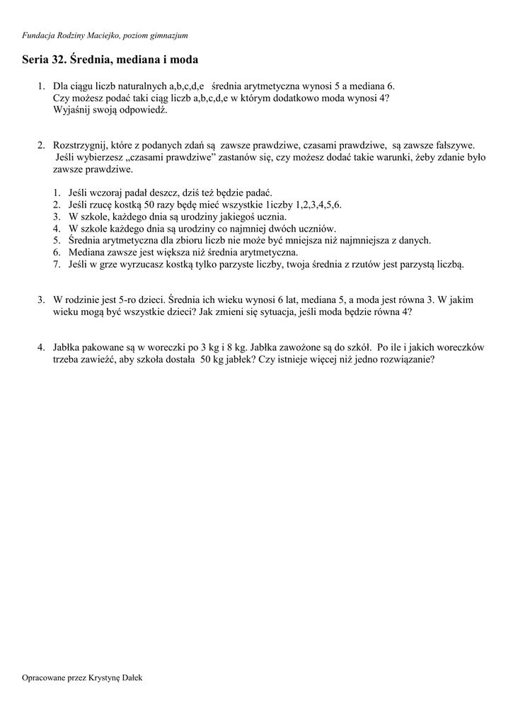 Fundacja Rodziny Maciejko, poziom gimnazjum Seria 32. Średnia, mediana i moda 1. Dla ciągu liczb naturalnych a,b,c,d,e średnia arytmetyczna wynosi 5 a mediana 6. Czy możesz podać taki ciąg liczb a,b,c,d,e w którym dodatkowo moda wynosi 4? Wyjaśnij swoją odpowiedź. 2. Rozstrzygnij, które z podanych zdań są zawsze prawdziwe, czasami prawdziwe, są zawsze fałszywe. Jeśli wybierzesz „czasami prawdziwe” zastanów się, czy możesz dodać takie warunki, żeby zdanie było zawsze prawdziwe. 1. 2. 3. 4. 5. 6. 7. Jeśli wczoraj padał deszcz, dziś też będzie padać. Jeśli rzucę kostką 50 razy będę mieć wszystkie 1iczby 1,2,3,4,5,6. W szkole, każdego dnia są urodziny jakiegoś ucznia. W szkole każdego dnia są urodziny co najmniej dwóch uczniów. Średnia arytmetyczna dla zbioru liczb nie może być mniejsza niż najmniejsza z danych. Mediana zawsze jest większa niż średnia arytmetyczna. Jeśli w grze wyrzucasz kostką tylko parzyste liczby, twoja średnia z rzutów jest parzystą liczbą. 3. W rodzinie jest 5-ro dzieci. Średnia ich wieku wynosi 6 lat, mediana 5, a moda jest równa 3. W jakim wieku mogą być wszystkie dzieci? Jak zmieni się sytuacja, jeśli moda będzie równa 4? 4. Jabłka pakowane są w woreczki po 3 kg i 8 kg. Jabłka zawożone są do szkół. Po ile i jakich woreczków trzeba zawieźć, aby szkoła dostała 50 kg jabłek? Czy istnieje więcej niż jedno rozwiązanie? Opracowane przez Krystynę Dałek