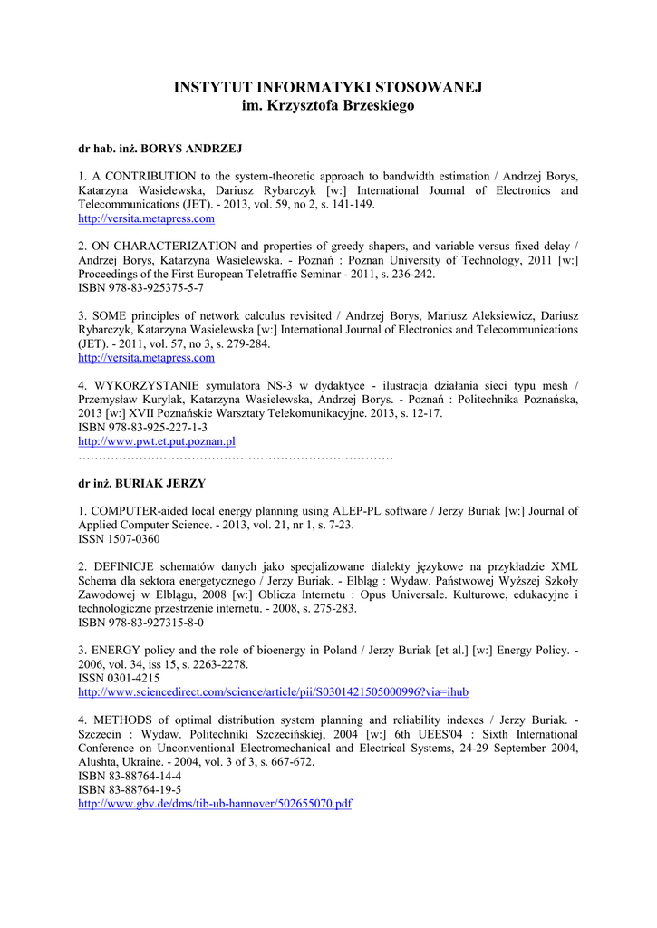 INSTYTUT INFORMATYKI STOSOWANEJ im. Krzysztofa Brzeskiego dr hab. inż. BORYS ANDRZEJ 1. A CONTRIBUTION to the system-theoretic approach to bandwidth estimation / Andrzej Borys, Katarzyna Wasielewska, Dariusz Rybarczyk [w:] International Journal of Electronics and Telecommunications (JET). - 2013, vol. 59, no 2, s. 141-149. http://versita.metapress.com 2. ON CHARACTERIZATION and properties of greedy shapers, and variable versus fixed delay / Andrzej Borys, Katarzyna Wasielewska. - Poznań : Poznan University of Technology, 2011 [w:] Proceedings of the First European Teletraffic Seminar - 2011, s. 236-242. ISBN 978-83-925375-5-7 3. SOME principles of network calculus revisited / Andrzej Borys, Mariusz Aleksiewicz, Dariusz Rybarczyk, Katarzyna Wasielewska [w:] International Journal of Electronics and Telecommunications (JET). - 2011, vol. 57, no 3, s. 279-284. http://versita.metapress.com 4. WYKORZYSTANIE symulatora NS-3 w dydaktyce - ilustracja działania sieci typu mesh / Przemysław Kurylak, Katarzyna Wasielewska, Andrzej Borys. - Poznań : Politechnika Poznańska, 2013 [w:] XVII Poznańskie Warsztaty Telekomunikacyjne. 2013, s. 12-17. ISBN 978-83-925-227-1-3 http://www.pwt.et.put.poznan.pl …………………………………………………………………… dr inż. BURIAK JERZY 1. COMPUTER-aided local energy planning using ALEP-PL software / Jerzy Buriak [w:] Journal of Applied Computer Science. - 2013, vol. 21, nr 1, s. 7-23. ISSN 1507-0360 2. DEFINICJE schematów danych jako specjalizowane dialekty językowe na przykładzie XML Schema dla sektora energetycznego / Jerzy Buriak. - Elbląg : Wydaw. Państwowej Wyższej Szkoły Zawodowej w Elblągu, 2008 [w:] Oblicza Internetu : Opus Universale. Kulturowe, edukacyjne i technologiczne przestrzenie internetu. - 2008, s. 275-283. ISBN 978-83-927315-8-0 3. ENERGY policy and the role of bioenergy in Poland / Jerzy Buriak [et al.] [w:] Energy Policy. 2006, vol. 34, iss 15, s. 2263-2278. ISSN 0301-4215 http://www.sciencedirect.com/science/article/pii/S0301421505000996?via=ihub 4. METHODS of optimal distribution system planning and reliability indexes / Jerzy Buriak. Szczecin : Wydaw. Politechniki Szczecińskiej, 2004 [w:] 6th UEES'04 : Sixth International Conference on Unconventional Electromechanical and Electrical Systems, 24-29 September 2004, Alushta, Ukraine. - 2004, vol. 3 of 3, s. 667-672. ISBN 83-88764-14-4 ISBN 83-88764-19-5 http://www.gbv.de/dms/tib-ub-hannover/502655070.pdf 5. MODELE semantyczne wymiany informacji o stanie systemu elektroenergetycznego / Jerzy Buriak [w:] Studia Informatica. - 2012, vol. 33, nr 2B(106), s. 243-254. ISSN 0208-7286 6. PROBLEMY nauczania metodami e-learningu na przykładzie przedmiotu Administracja i Zarządzanie Bazami Danych Oracle / Jerzy Buriak. - Elbląg : Wydaw. Państwowej Wyższej Szkoły Zawodowej w Elblągu, 2014 [w:] Oblicza Internetu : Sieciowe dyskursy (Roz)poznawanie cyfrowego świata / red. nauk. Marek Sokołowski. - 2014, s. [259]-270. ISBN 978-83-62336-37-1 …………………………………………………………………………………………………….. dr hab. inż. DOMSTA JOACHIM 1. TWO examples of quantum dynamical semigroups / Joachim Domsta, Małgorzta Bodzioch [w:] Open Systems & Information Dynamics. - 2011, vol. 18, nr 2, s. 143-155. ISSN 1230-1612 http://www.worldscientific.com/toc/osid/18/02 ……………………………………………………………………………………………. dr FIDYTEK ROBERT 1. ALGORITHMS counting monotone Boolean functions / R. Fidytek, A. W. Mostowski, R. Somla, A. Szepietowski [w:] Information Processing Letters. 2001, nr 79, iss 5, s. 203-209. 2. EQUITABLE coloring of Kneser graphs / R. Fidytek, H. Furmańczyk, P. Żyliński [w:] Discussiones Mathematicae Graph Theory. 2009, vol. 29, nr 1, s. 119-142. ISSN 1234-3099 3. ON SOME three color Ramsey numbers for path and cycles / T. Dzido, R. Fidytek [w:] Discrete Mathematics. 2009, nr 309, iss 15, s. 4955-4958. ISSN 0012-365X 4. THE number of critical colorings for some Ramsey numbers / T. Dzido, R. Fidytek [w:] International Journal of Pure and Applied Mathematics. 2007, vol. 38, no. 3, s. 433-444. 5. TWO examples of quantum dynamical semigroups / Joachim Domsta, Małgorzta Bodzioch [w:] Open Systems & Information Dynamics. - 2011, vol. 18, nr 2, s. 143-155. ISSN 1230-1612 http://www.worldscientific.com/toc/osid/18/02 …………………………………………………………………………….. dr JÓŁKOWSKA JOANNA 1. ON ETHICS of Mazurkiewicz Traces / Edward Ochmański, Joanna Pieckowska. - (Annales Societatis Mathematicae Polonae. Series 4: Fundamenta Informaticae, ISSN 0169-2968 ; vol. 80, nr 1-3) [w:] Annales Societatis Mathematicae Polonae. Series 4 : Fundamenta Informaticae. - 2007, vol. 80, nr 1-3, s. 259-272. 2. ON TRACE-Expressible Behaviour of Petri Nets / Edward Ochmański, Joanna Jółkowska. (Annales Societatis Mathematicae Polonae. Series 4 : Fundamenta Informaticae, ISSN 0169-2968 ; vol. 85, nr 1-4) [w:] Annales Societatis Mathematicae Polonae. Series 4 : Fundamenta Informaticae. 2008, vol. 85, nr 1-4, s. 281-295. 3. TRACE Nets and Conflict - free Computations / Edward Ochmański, Joanna Pieckowska. (Annales Societatis Mathematicae Polonae. Series 4, Fundamenta Informaticae, ISSN 0169-2968 ; vol. 72, nr 1-3) [w:] Annales Societatis Mathematicae Polonae. Series 4, Fundamenta Informaticae. 2006, vol. 72, nr 1-3, s. 311-321. 4. WYKORZYSTANIE wielowymiarowych struktur danych i technik OLAP w czasoprzestrzennych systemach wspomagania podejmowania decyzji / Joanna Jółkowska [w:] Rozprawy Naukowe i Zawodowe PWSZ w Elblągu. - 2013, z. 16, s. [153]-183. ISSN 1895-8117 ……………………………………………………………………………………………………….. dr inż. KAHSIN MACIEJ 1. ACTIVE Sound Quality Control of Engine Noise / M. Kahsin. - Gottingen : Associaç_U00E3_o Portuguesa de Mecânica Teôrica, Ap