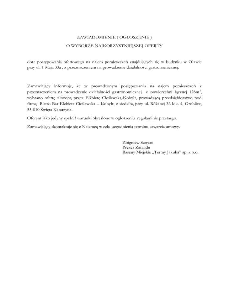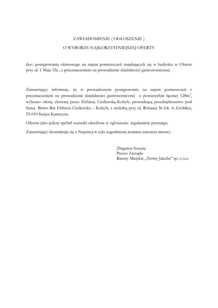 ZAWIADOMIENIE ( OGŁOSZENIE ) O WYBORZE NAJKORZYSTNIEJSZEJ OFERTY dot.: postępowania ofertowego na najem pomieszczeń znajdujących się w budynku w Oławie przy ul. 1 Maja 33a , z przeznaczeniem na prowadzenie działalności gastronomicznej. Zamawiający informuje, że w prowadzonym postępowaniu na najem pomieszczeń z przeznaczeniem na prowadzenie działalności gastronomicznej o powierzchni łącznej 128m 2, wybrano ofertę złożoną przez Elżbietę Cieślewską-Kobyłt, prowadzącą przedsiębiorstwo pod firmą Bistro Bar Elżbieta Cieślewska – Kobyłt, z siedzibą przy ul. Różanej 36 lok. 4, Groblice, 55-010 Święta Katarzyna. Oferent jako jedyny spełnił warunki określone w ogłoszeniu regulaminie przetargu. Zamawiający skontaktuje się z Najemcą w celu uzgodnienia terminu zawarcia umowy. Zbigniew Szwarc Prezes Zarządu Baseny Miejskie „Termy Jakuba” sp. z o.o.