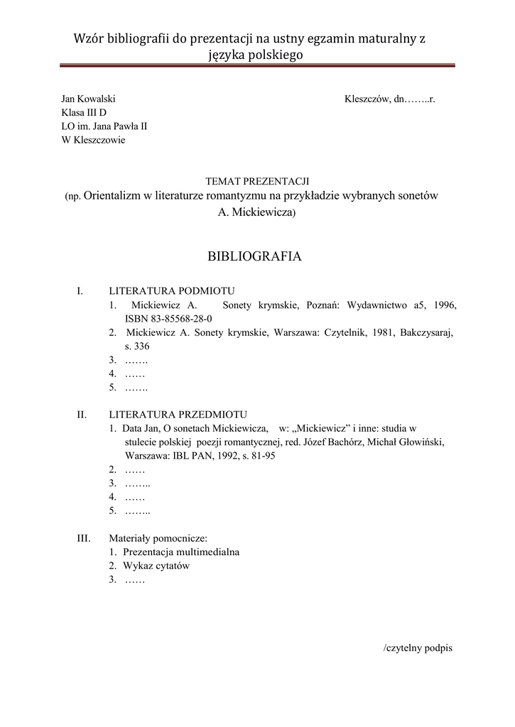 Wzór bibliografii do prezentacji na ustny egzamin maturalny z języka polskiego Kleszczów, dn……..r. Jan Kowalski Klasa III D LO im. Jana Pawła II W Kleszczowie TEMAT PREZENTACJI (np. Orientalizm w literaturze romantyzmu na przykładzie wybranych sonetów A. Mickiewicza) BIBLIOGRAFIA I. LITERATURA PODMIOTU 1. Mickiewicz A. Sonety krymskie, Poznań: Wydawnictwo a5, 1996, ISBN 83-85568-28-0 2. Mickiewicz A. Sonety krymskie, Warszawa: Czytelnik, 1981, Bakczysaraj, s. 336 3. ……. 4. …… 5. ……. II. LITERATURA PRZEDMIOTU 1. Data Jan, O sonetach Mickiewicza, w: „Mickiewicz” i inne: studia w stulecie polskiej poezji romantycznej, red. Józef Bachórz, Michał Głowiński, Warszawa: IBL PAN, 1992, s. 81-95 2. …… 3. …….. 4. …… 5. …….. III. Materiały pomocnicze: 1. Prezentacja multimedialna 2. Wykaz cytatów 3. …… /czytelny podpis