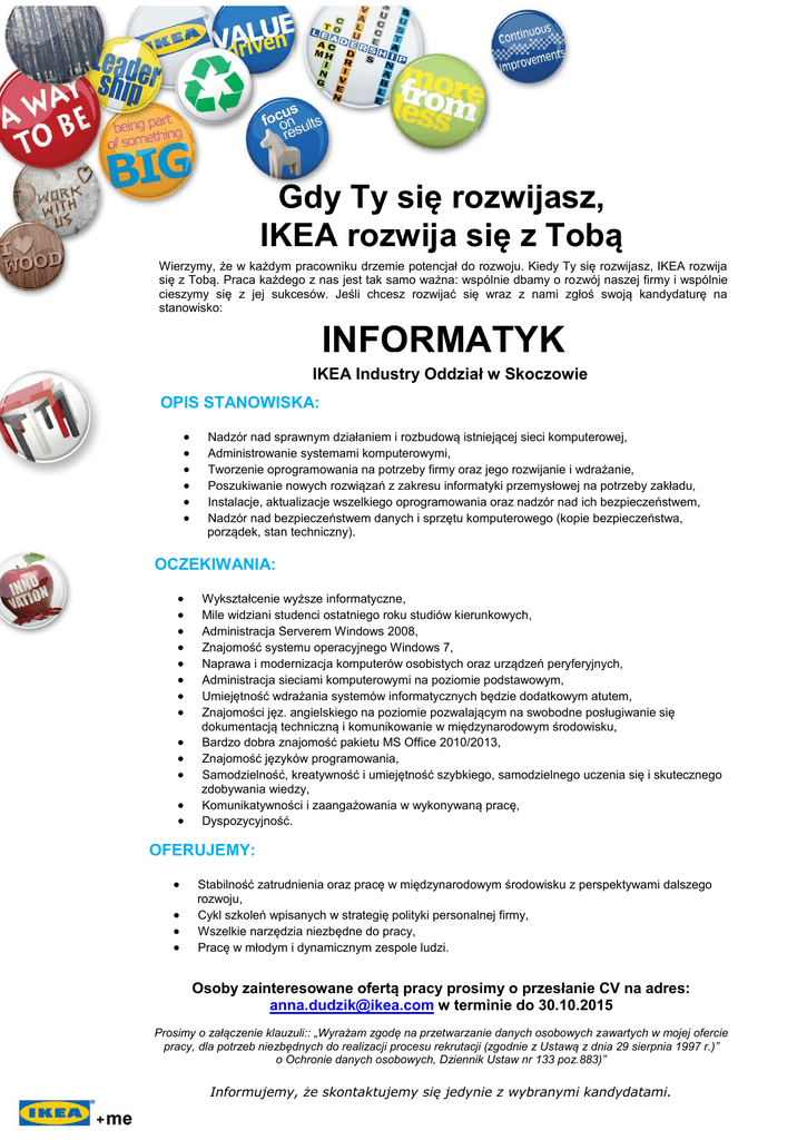 Gdy Ty się rozwijasz, IKEA rozwija się z Tobą Wierzymy, że w każdym pracowniku drzemie potencjał do rozwoju. Kiedy Ty się rozwijasz, IKEA rozwija się z Tobą. Praca każdego z nas jest tak samo ważna: wspólnie dbamy o rozwój naszej firmy i wspólnie cieszymy się z jej sukcesów. Jeśli chcesz rozwijać się wraz z nami zgłoś swoją kandydaturę na stanowisko: INFORMATYK IKEA Industry Oddział w Skoczowie OPIS STANOWISKA: Nadzór nad sprawnym działaniem i rozbudową istniejącej sieci komputerowej, Administrowanie systemami komputerowymi, Tworzenie oprogramowania na potrzeby firmy oraz jego rozwijanie i wdrażanie, Poszukiwanie nowych rozwiązań z zakresu informatyki przemysłowej na potrzeby zakładu, Instalacje, aktualizacje wszelkiego oprogramowania oraz nadzór nad ich bezpieczeństwem, Nadzór nad bezpieczeństwem danych i sprzętu komputerowego (kopie bezpieczeństwa, porządek, stan techniczny). OCZEKIWANIA: Wykształcenie wyższe informatyczne, Mile widziani studenci ostatniego roku studiów kierunkowych, Administracja Serverem Windows 2008, Znajomość systemu operacyjnego Windows 7, Naprawa i modernizacja komputerów osobistych oraz urządzeń peryferyjnych, Administracja sieciami komputerowymi na poziomie podstawowym, Umiejętność wdrażania systemów informatycznych będzie dodatkowym atutem, Znajomości jęz. angielskiego na poziomie pozwalającym na swobodne posługiwanie się dokumentacją techniczną i komunikowanie w międzynarodowym środowisku, Bardzo dobra znajomość pakietu MS Office 2010/2013, Znajomość języków programowania, Samodzielność, kreatywność i umiejętność szybkiego, samodzielnego uczenia się i skutecznego zdobywania wiedzy, Komunikatywności i zaangażowania w wykonywaną pracę, Dyspozycyjność. OFERUJEMY: Stabilność zatrudnienia oraz pracę w międzynarodowym środowisku z perspektywami dalszego rozwoju, Cykl szkoleń wpisanych w strategię polityki personalnej firmy, Wszelkie narzędzia niezbędne do pracy, Pracę w młodym i dynamicznym zespole ludzi. Osoby zainteresowane ofertą pracy prosimy o przesłanie CV na adres: [email protected] w terminie do 30.10.2015 Prosimy o załączenie klauzuli:: „Wyrażam zgodę na przetwarzanie danych osobowych zawartych w mojej ofercie pracy, dla potrzeb niezbędnych do realizacji procesu rekrutacji (zgodnie z Ustawą z dnia 29 sierpnia 1997 r.)” o Ochronie danych osobowych, Dziennik Ustaw nr 133 poz.883)” Informujemy, że skontaktujemy się jedynie z wybranymi kandydatami.