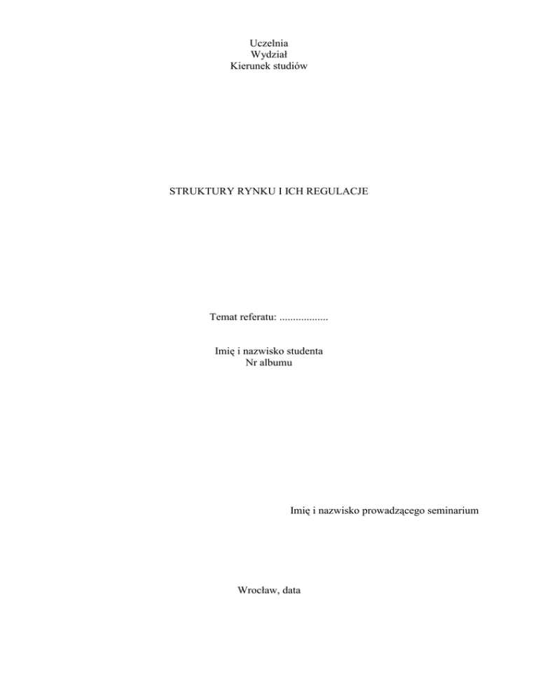 Uczelnia Wydział Kierunek studiów STRUKTURY RYNKU I ICH REGULACJE Temat referatu: .................. Imię i nazwisko studenta Nr albumu Imię i nazwisko prowadzącego seminarium Wrocław, data Wymagania dotyczące wersji pisemnej referatu Struktura pracy: 1. Spis treści 2. Wstęp 3. Część zasadnicza referatu 4. Podsumowanie, wnioski 5. Literatura W treści referatu mają być zaznaczone cytaty i powołania na literaturę. W literaturze w przypadku wykorzystania publikacji internetowych ma być podane źródło (adres internetowy i termin pobrania publikacji). Podsumowanie ma stanowić wkład własny autorów. Wymagania dotyczące wygłaszania referatu 1. 2. 3. 4. Temat referatu Plan prezentacji Prezentacja Podsumowanie i wnioski Oprócz treści wygłoszonej oceniane będzie: 1. zachowanie podczas wygłaszania referatu (kultura osobista, np. słownictwo) 2. referat ma być wygłoszony a nie czytany (kontakt wzrokowy ze słuchaczami) 3. materiały dodatkowe: np. folie, konspekty, streszczenie, plakat. Prezentacja dwuosobowa ma trwać ok. 20 minut i musi być wygłaszana przez obie osoby. Liczba slajdów ok. 20. Prezentacja jednoosobowa ma trwać ok. 15 minut.