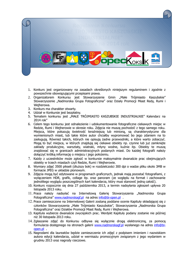 Regulamin Konkursu „MAŁE TRÓJMIASTO KASZUBSKIE INDUSTRIALNIE” Kalendarz na 2014 rok 1. Konkurs jest organizowany na zasadach określonych niniejszym regulaminem i zgodnie z powszechnie obowiązującymi przepisami prawa. 2. Organizatorem Konkursu jest Stowarzyszenie Gmin „Małe Trójmiasto Kaszubskie” Stowarzyszenie „Nadmorska Grupa Fotograficzna” oraz Działy Promocji Miast Redy, Rumi i Wejherowa. 3. Konkurs ma charakter otwarty. 4. Udział w Konkursie jest bezpłatny. 5. Tematem konkursu jest „MAŁE TRÓJMIASTO KASZUBSKIE INDUSTRIALNIE” Kalendarz na 2014 rok” 6. Celem tego konkursu jest odnalezienie i udokumentowanie fotograficzne ciekawych miejsc w Redzie, Rumi i Wejherowie w okresie roku. Zdjęcia nie muszą pochodzić z tego samego roku. Miejsca, które pokazują świetność teraźniejszą lub minioną, są charakterystyczne dla wymienionych miast, lub takie które autor chciałby wypromować bo jego zdaniem na to zasługują. Również takich, których nie opisują żadne przewodniki, a które warto zobaczyć. Mogą to być miejsca, w których znajdują się ciekawe obiekty np. czynne lub już zamknięte zakłady produkcyjne, warsztaty, wiatraki, młyny wodne, kuźnie itp. Obiekty te muszą znajdować się w granicach administracyjnych podanych miast. Do każdej fotografii należy dołączyć krótką informację o miejscu i jego położeniu. 7. Każdy z uczestników może zgłosić w konkursie maksymalnie dwanaście prac obejmujących obiekty w trzech miastach czyli Redzie, Rumi i Wejherowie. 8. Wymiary zdjęć 3500 pikseli (dłuższy bok) w rozdzielczości 300 dpi o wadze pliku około 3MB w formacie JPEG w układzie pionowym. 9. Zdjęcia mogą być edytowane w programach graficznych, jednak mają pozostać fotografiami, z wyłączeniem HDR, grafik, collage itp. oraz panoram (ze względu na format i zachowanie jednolitego wyglądu poszczególnych kart kalendarza, który musi stanowić jedną całość). 10. Konkurs rozpocznie się dnia 27 października 2013, a termin nadsyłania zgłoszeń upływa 20 listopada 2013 roku. 11. Prace należy nadsyłać na Internetową Galerię Stowarzyszenia „Nadmorska Grupa Fotograficzna” www.nadmorskagf.pl na adres [email protected] . 12. Prace zamieszczone na Internetowej Galerii zostaną poddane ocenie Kapituły składającej się z członków Stowarzyszenia „Małe Trójmiasto Kaszubskie”, Stowarzyszenia „Nadmorska Grupa Fotograficzna” oraz Działów Promocji Miast Redy, Rumi i Wejherowa. 13. Kapituła wybierze dwanaście zwycięskich prac. Werdykt Kapituły podany zostanie nie później niż 30 listopada 2013 roku. 14. Zgłaszanie zdjęć do Konkursu odbywa się wyłącznie drogą elektroniczną, za pomocą formularza dostępnego na stronach galerii www.nadmorskagf.pl wysłanego na adres [email protected] . 15. Nagrodami dla laureatów będzie zamieszczenie ich zdjęć z podpisem imieniem i nazwiskiem autora edycji kalendarza, udział w wernisażu promocyjnym związanym z jego wydaniem w grudniu 2013 oraz nagrody rzeczowe. 16. Zgłoszenie prac na Konkurs jest równoznaczne z oświadczeniem, iż osoba nadsyłająca: - jest autorem/autorką załączonych zdjęć i posiada wszelkie prawa autorskie i majątkowe oraz prawa do wizerunku (osób widocznych na zdjęciach jeżeli się tam znajdują) zostały wyjaśnione i osoby te wyrażają zgodę na wystawienie i ich publikowanie (autor posiada zgodę na piśmie do okazania w sytuacjach spornych) - autor/autorka udostępnia nieodpłatnie zdjęcia zgłoszone do konkursu (bez zbycia praw autorskich i majątkowych), również ich wykorzystywanie przez Organizatorów dla celów reklamowych Konkursu w dowolnym czasie i formie w celach informacyjnych związanych z konkursem oraz Kalendarzem „MAŁE TRÓJMIASTO KASZUBSKIE INDUSTRIALNIE” na rok 2014, strony internetowej Stowarzyszenia „Nadmorska Grupa Fotograficzna”, Stowarzyszenia „Małe Trójmiasto Kaszubskie”, stron promocyjnych miast Redy, Rumi i Wejherowa oraz Kalendarza „MAŁE TRÓJMIASTO KASZUBSKIE INDUSTRIALNIE” na rok 2014, a także wyraża zgodę na używanie na następujących polach eksploatacji: publikacje internetowe, audycje telewizyjne, podkasty, wydawnictwa drukowane związane z niekomercyjną promocją miast organizatorów oraz obu stowarzyszeń po rozstrzygnięciu konkursu i wydaniu kalendarza jako materiały archiwalne i promocyjne (w każdym przypadku z wyraźnym wskazaniem autora zdjęcia). Powyższa zgoda nie ogranicza autora w żaden sposób do dysponowania swoimi pracami poza i w trakcie trwania konkursu. -autor/autorka przyjmuje na siebie wszelkie roszczenia jakiejkolwiek natury, które osoby trzecie mogłyby kierować przeciwko organizatorom Konkursu w związku ze swoimi pracami. - przyjmuje warunki Regulaminu Konkursu, - wyraża zgodę na przetwarzanie swoich danych osobowych zgodnie z ustawą o Ochronie Danych Osobowych ( Dz.U.Nr.133 pozycja 883) 17. Organizatorzy zastrzegają sobie prawo do nie zamieszczania fotografii i tekstów o treści powszechnie uznawanej za obraźliwe, naruszające prawa osób trzecich lub prawo polskie, zawierających treści pornograficzne lub w sposób oczywisty godzące w uczucia religijne. Decyzja o usunięciu takich treści jest niepodważalna i ostateczna. 18. Organizator zastrzega sobie prawo do pozostawienia konkursu nierozstrzygniętego lub jego przerwania w szczególności w przypadku kiedy jakość prac nie pozwala na prawidłową edycję DTP. W takim przypadku Konkurs zostanie odwołany. 19. Organizatorzy zastrzegają sobie prawo zmiany postanowień niniejszego Regulaminu w przypadku zmian przepisów prawnych lub innych istotnych zdarzeń mających wpływ na organizowanie Konkursu. 20. W kwestiach nie uregulowanych niniejszym regulaminem mają zastosowanie przepisy Kodeksu Cywilnego RP. Adresy kontaktowe [email protected] Strona internetowa www.nadmorskagf.pl