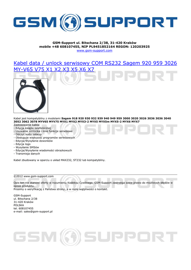 GSM-Support ul. Bitschana 2/38, 31-420 Kraków mobile +48 608107455, NIP PL9451852164 REGON: 120203925 www.gsm-support.com Kabel data / unlock serwisowy COM RS232 Sagem 920 959 3026 MY-V65 V75 X1 X2 X3 X5 X6 X7 Kabel jest kompatybilny z modelami Sagem 918 920 930 932 939 940 949 959 3000 3020 3026 3036 3036 3040 3052 3062 3078 MYV65 MYV75 MYX1 MYX2 MYX3-2 MYX5 MYX5m MYX5-2 MYX6 MYX7 Zastosowanie kabla: - Edycja książki telefonicznej - Usuwanie simlocka i inne funkcje serwisowe - Odczyt kodu zabezp. - Obsługuje większość programów serwisowych - Edycja/Wysyłanie dzwonków - Edycja logo - Wysyłanie SMSów - Edycja/Wysyłanie wiadomości obrazkowych - Transmisja danych Kabel zbudowany w oparciu o układ MAX232, ST232 lub kompatybilny. ©2012 www.gsm-support.com Opis ten nie stanowi oferty w rozumieniu Kodeksu Cywilnego. GSM-Support zastrzega sobie prawo do możliwych błędów w opisie produktu. Prosimy o weryfikację z Państwa strony, a w razie wątpliwości o kontakt. GSM-Support ul. Bitschana 2/38 31-420 Kraków POLSKA tel. 608107455 e-mail: [email protected] Powered by TCPDF (www.tcpdf.org)