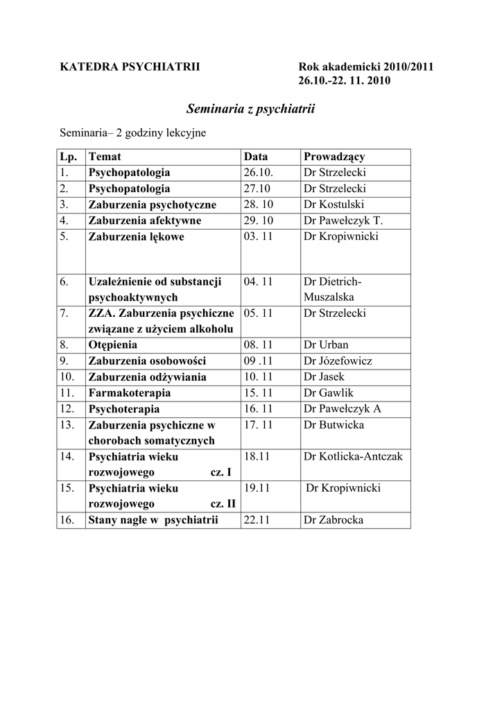 KATEDRA PSYCHIATRII Rok akademicki 2010/2011 26.10.-22. 11. 2010 Seminaria z psychiatrii Seminaria– 2 godziny lekcyjne Lp. 1. 2. 3. 4. 5. Temat Psychopatologia Psychopatologia Zaburzenia psychotyczne Zaburzenia afektywne Zaburzenia lękowe Data 26.10. 27.10 28. 10 29. 10 03. 11 Prowadzący Dr Strzelecki Dr Strzelecki Dr Kostulski Dr Pawełczyk T. Dr Kropiwnicki 6. Uzależnienie od substancji psychoaktywnych ZZA. Zaburzenia psychiczne związane z użyciem alkoholu Otępienia Zaburzenia osobowości Zaburzenia odżywiania Farmakoterapia Psychoterapia Zaburzenia psychiczne w chorobach somatycznych Psychiatria wieku rozwojowego cz. I Psychiatria wieku rozwojowego cz. II Stany nagłe w psychiatrii 04. 11 05. 11 Dr DietrichMuszalska Dr Strzelecki 08. 11 09 .11 10. 11 15. 11 16. 11 17. 11 Dr Urban Dr Józefowicz Dr Jasek Dr Gawlik Dr Pawełczyk A Dr Butwicka 18.11 Dr Kotlicka-Antczak 19.11 Dr Kropiwnicki 22.11 Dr Zabrocka 7. 8. 9. 10. 11. 12. 13. 14. 15. 16.