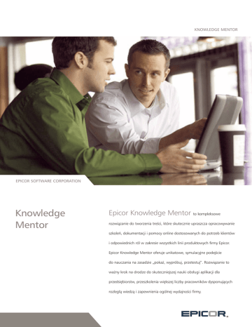 KNOWLEDGE MENTOR EPICOR SOFTWARE CORPORATION Knowledge Mentor Epicor Knowledge Mentor to kompleksowe rozwiàzanie do tworzenia treÊci, które skutecznie upraszcza opracowywanie szkoleƒ, dokumentacji i pomocy online dostosowanych do potrzeb klientów i odpowiednich ról w zakresie wszystkich linii produktowych firmy Epicor. Epicor Knowledge Mentor oferuje unikatowe, symulacyjne podejÊcie do nauczania na zasadzie „poka˝, wypróbuj, przetestuj”. Rozwiàzanie to wa˝ny krok na drodze do skuteczniejszej nauki obs∏ugi aplikacji dla przedsi´biorstw, przeszkolenia wi´kszej liczby pracowników dysponujàcych rozleg∏à wiedzà i zapewnienia ogólnej wydajnoÊci firmy. EPICOR SOFTWARE CORPORATION „Klienci firmy Epicor instalujà wi´cej oprogramowania i jego modu∏ów za cen´ ni˝szà Êrednio 4–6 razy w porównaniu do konkurencyjnych rozwiàzaƒ”. / Ca∏kowity koszt posiadania systemów ERP w firmach Êredniej wielkoÊci Cindy Jutras Aberdeen Group Wrzesieƒ 2007 r. System Epicor Knowledge Mentor mo˝e byç wykorzystywany bezpoÊrednio przez pracowników firmy klienta lub w jej imieniu przez wykwalifikowanych konsultantów firmy Epicor. System ten synchronizuje i przyspiesza tworzenie nast´pujàcych elementów treÊci: • skrypty testów umo˝liwiajàcych ocen´ znajomoÊci obs∏ugi systemu przez u˝ytkowników, • wskazówki dotyczàce realizacji zadaƒ oraz podr´czniki dla poszczególnych ról, • skrócone instrukcje typu „krok po kroku”, • demonstracje dzia∏ania systemu, • interaktywne samouczki i testy, • specyficzne dla klienta, transakcyjne samouczki z pomocà. Dlaczego warto zainwestowaç w system Epicor Knowledge Mentor? Badania wykaza∏y, ˝e najistotniejszym czynnikiem okreÊlajàcym wartoÊç zwrotu z inwestycji (ROI) uzyskiwanego przez przedsi´biorstwa, które wdro˝y∏y systemy ERP, CRM i inne korporacyjne oprogramowanie biznesowe, jest faktyczne wykorzystywanie tych systemów przez spo∏ecznoÊç u˝ytkowników. System Epicor Knowledge Mentor zosta∏ zaprojektowany z myÊlà o uproszczeniu opracowywania i udost´pniania kompleksowych rozwiàzaƒ edukacyjnych dla u˝ytkowników, aby zmniejszyç ryzyko braku znajomoÊci zasad obs∏ugi systemów wÊród u˝ytkowników. Firma Epicor rozumie, ˝e u˝ytkownicy mogà si´ zmieniaç w miar´ up∏ywu czasu. Wie równie˝, ˝e procesy i regu∏y stosowane w firmie mogà ewoluowaç w miar´ rozwoju dzia∏alnoÊci biznesowej. System Epicor Knowledge Mentor pozwala firmie Epicor Êwiadczyç klientom us∏ugi potrzebne do wyszkolenia zespo∏u projektowego, a tak˝e udost´pniaç przedsi´biorstwom rozwiàzanie, które pozwoli klientowi szybko przeszkoliç wszystkich u˝ytkowników aplikacji Epicor w firmie, dziÊ i w przysz∏oÊci. W rezultacie u˝ytkownicy szybciej nabierajà wprawy w korzystaniu z aplikacji Epicor i uczà si´ korzystania z niej w oparciu o najlepsze procedury. Zapewnia to szybszy zwrot z inwestycji i optymalne opanowanie zasad obs∏ugi aplikacji przez dzisiejszych i przysz∏ych u˝ytkowników. Skuteczne opanowania zasad obs∏ugi aplikacji przez u˝ytkowników Ludzie lubià uczyç si´ na ró˝ne sposoby, a u˝ytkownicy rozwiàzania Epicor wdro˝onego u klienta stanowià zró˝nicowanà grup´ odbiorców. Aby zapewniç zaanga˝owanie wszystkich u˝ytkowników, nale˝y im udost´pniç dokumentacj´ i przeprowadziç szkolenie w formie, która odpowiada ich indywidualnym preferencjom w zakresie nauczania. Prezentowanie System Epicor Knowledge Mentor mo˝e demonstrowaç najlepsze procedury wraz z komentarzem lektora, co pozwala pokazaç u˝ytkownikom, w jaki sposób realizowaç poszczególne procesy lub transakcje. Próbowanie U˝ytkownicy mogà równie˝ zdobyç doÊwiadczenie praktyczne w obs∏udze systemu dzi´ki interaktywnym symulacjom, które prowadzà u˝ytkownika przez kolejne kroki procesu w bezpiecznym i kontrolowanym Êrodowisku. EPICOR SOFTWARE CORPORATION Testowanie U˝ytkownicy mogà równie˝ sprawdziç swojà znajomoÊç systemu i poddaç ocenie swojà umiej´tnoÊç wykonywania transakcji, mogà te˝ zademonstrowaç swojà wiedz´ na temat danej regu∏y lub procedury. Wyniki te mo˝na ujednoliciç i w∏àczyç do systemu zarzàdzania nauczaniem (Learning Management System – LMS) z wykorzystaniem standardów SCORM lub AICC, dzi´ki czemu kierownictwo firmy b´dzie mog∏o okreÊliç, którzy u˝ytkownicy sà ju˝ gotowi do korzystania z produkcyjnej wersji rozwiàzania Epicor. • POMOC TECHNICZNA: JeÊli u˝ytkownik nie wie, w jaki sposób wykonaç proces w systemie produkcyjnym, potrzebuje odpowiedzi, a nie samouczka. System Epicor Knowledge Mentor udost´pnia pliki pomocy kontekstowej, które sà zawsze pod r´kà i które mo˝na wykorzystywaç podczas u˝ytkowania systemu produkcyjnego. Pliki te prowadzà u˝ytkownika przez proces krok po kroku. Wszystko to bez telefonowania do stanowiska pomocy lub proszenia o pomoc wspó∏pracowników, co maksymalnie zwi´ksza produktywnoÊç. • DOKUMENTACJA: Udost´pnianie u˝ytkownikom adekwatnej dokumentacji w formie wskazówek dotyczàcych realizacji zadaƒ, skróconych instrukcji, podr´czników z çwiczeniami do realizacji podczas kursu oraz podr´czników u˝ytkownika stanowi podstaw´ wielu projektów szkoleƒ dla u˝ytkowników. Oprócz skryptów umo˝liwiajàcych testowanie znajomoÊci obs∏ugi systemu przez u˝ytkownika (user acceptance testing – UAT) oraz rejestrów procedur/transakcji umo˝liwiajàcych zachowanie zgodnoÊci z przepisami, system Epicor Knowledge Mentor generuje dokumentacj´ pomocniczà potrzebnà u˝ytkownikom. Wszystkie opisane powy˝ej treÊci sà opracowywane przez ten sam zespó∏, dzi´ki czemu system Epicor Knowledge Mentor jest w stanie skróciç czas i ograniczyç zasoby potrzebne zazwyczaj do opracowania dokumentacji nawet o 75%. Elementy systemu Epicor Knowledge Mentor W konfiguracji minimalnej system umo˝liwia wdro˝enie bogatych treÊci edukacyjnych na temat aplikacji E