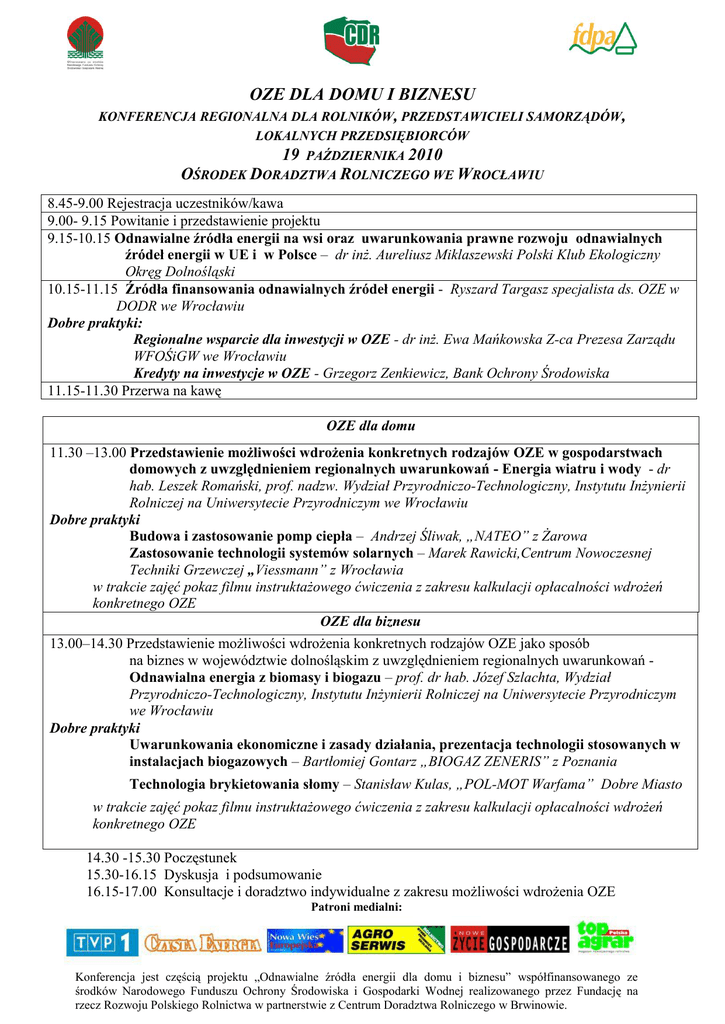 OZE DLA DOMU I BIZNESU KONFERENCJA REGIONALNA DLA ROLNIKÓW, PRZEDSTAWICIELI SAMORZĄDÓW, LOKALNYCH PRZEDSIĘBIORCÓW 19 PAŹDZIERNIKA 2010 OŚRODEK DORADZTWA ROLNICZEGO WE WROCŁAWIU 8.45-9.00 Rejestracja uczestników/kawa 9.00- 9.15 Powitanie i przedstawienie projektu 9.15-10.15 Odnawialne źródła energii na wsi oraz uwarunkowania prawne rozwoju odnawialnych źródeł energii w UE i w Polsce – dr inż. Aureliusz Miklaszewski Polski Klub Ekologiczny Okręg Dolnośląski 10.15-11.15 Źródła finansowania odnawialnych źródeł energii - Ryszard Targasz specjalista ds. OZE w DODR we Wrocławiu Dobre praktyki: Regionalne wsparcie dla inwestycji w OZE - dr inż. Ewa Mańkowska Z-ca Prezesa Zarządu WFOŚiGW we Wrocławiu Kredyty na inwestycje w OZE - Grzegorz Zenkiewicz, Bank Ochrony Środowiska 11.15-11.30 Przerwa na kawę OZE dla domu 11.30 –13.00 Przedstawienie możliwości wdrożenia konkretnych rodzajów OZE w gospodarstwach domowych z uwzględnieniem regionalnych uwarunkowań - Energia wiatru i wody - dr hab. Leszek Romański, prof. nadzw. Wydział Przyrodniczo-Technologiczny, Instytutu Inżynierii Rolniczej na Uniwersytecie Przyrodniczym we Wrocławiu Dobre praktyki Budowa i zastosowanie pomp ciepła – Andrzej Śliwak, „NATEO” z Żarowa Zastosowanie technologii systemów solarnych – Marek Rawicki,Centrum Nowoczesnej Techniki Grzewczej „Viessmann” z Wrocławia w trakcie zajęć pokaz filmu instruktażowego ćwiczenia z zakresu kalkulacji opłacalności wdrożeń konkretnego OZE OZE dla biznesu 13.00–14.30 Przedstawienie możliwości wdrożenia konkretnych rodzajów OZE jako sposób na biznes w województwie dolnośląskim z uwzględnieniem regionalnych uwarunkowań Odnawialna energia z biomasy i biogazu – prof. dr hab. Józef Szlachta, Wydział Przyrodniczo-Technologiczny, Instytutu Inżynierii Rolniczej na Uniwersytecie Przyrodniczym we Wrocławiu Dobre praktyki Uwarunkowania ekonomiczne i zasady działania, prezentacja technologii stosowanych w instalacjach biogazowych – Bartłomiej Gontarz „BIOGAZ ZENERIS” z Poznania Technologia brykietowania słomy – Stanisław Kulas, „POL-MOT Warfama” Dobre Miasto w trakcie zajęć pokaz filmu instruktażowego ćwiczenia z zakresu kalkulacji opłacalności wdrożeń konkretnego OZE 14.30 -15.30 Poczęstunek 15.30-16.15 Dyskusja i podsumowanie 16.15-17.00 Konsultacje i doradztwo indywidualne z zakresu możliwości wdrożenia OZE Patroni medialni: Konferencja jest częścią projektu „Odnawialne źródła energii dla domu i biznesu” współfinansowanego ze środków Narodowego Funduszu Ochrony Środowiska i Gospodarki Wodnej realizowanego przez Fundację na rzecz Rozwoju Polskiego Rolnictwa w partnerstwie z Centrum Doradztwa Rolniczego w Brwinowie.