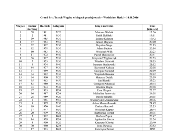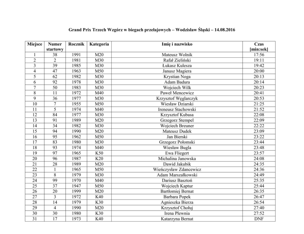 Grand Prix Trzech Wzgórz w biegach przełajowych – Wodzisław Śląski – 14.08.2016 Miejsce 1 2 3 4 5 6 7 8 9 10 11 12 13 14 15 16 17 18 19 20 21 22 23 24 25 26 27 28 29 30 31 Numer startowy 38 2 39 47 62 92 50 11 36 7 5 84 91 34 94 95 83 93 97 96 28 1 8 99 37 20 3 14 4 30 17 Rocznik Kategoria Imię i nazwisko 1991 1981 1985 1963 1982 1978 1983 1972 1977 1955 1974 1977 1989 1982 1990 1962 1980 1974 1965 1987 1989 1965 1979 1970 1947 1999 1972 1979 1990 1980 1973 M20 M30 M30 M50 M30 M30 M30 M40 M30 M50 M40 M30 M20 M30 M20 M50 M30 M40 K50 K20 M20 M50 M30 M40 M50 M20 K40 K30 M20 K30 K40 Mateusz Wolnik Rafał Zieliński Łukasz Kulesza Janusz Magiera Krystian Noga Adam Badura Wojciech Wilk Paweł Mencewicz Krzysztof Węglarczyk Wiesław Dziarski Ireneusz Stachowski Krzysztof Kubasa Grzegorz Stempel Wojciech Breuner Mateusz Dudek Jan Bierski Grzegorz Połomski Wiesław Bugla Ewa Fliegert Michalina Janowska Dawid Jakubik Wieńczysław Zdancewicz Adam Marszałkowski Dariusz Basztoń Wojciech Kaptur Bartłomiej Bernat Barbara Popek Agnieszka Bierza Krzysztof Chołuj Irena Plewnia Katarzyna Bernat Czas [min:sek] 17:56 19:11 19:42 20:00 20:13 20:14 20:23 20:41 20:53 21:25 21:52 22:08 22:09 22:22 23:09 23:22 23:44 23:48 23:57 24:08 24:35 24:36 24:49 25:35 25:44 26:35 26:47 26:54 27:40 27:52 DNF Miejsce 1 2 3 4 5 6 7 8 Miejsce 1 2 3 4 5 6 Numer Rocznik Kategoria startowy 57 2007 D2 73 2008 D1 4 2008 D1 6 2010 D0 52 2009 D1 33 2010 D0 100 2008 D1 9 2013 D0 Numer Rocznik Kategoria startowy 63 2000 D4 59 2001 D4 68 2000 D4 58 2003 D3 74 2005 D3 77 2005 D3 Imię i nazwisko Michał Skorupa Karolina Bierza Wiktoria Basztoń Oskar Kremski Zofia Paszkiewicz Bartosz Noga Zuzanna Koszak Alicja Marszałkowska Czas [min:sek] 1:01,50 1:05,24 1:05,64 1:07,43 1:09,80 1:30,65 1:38,98 3:59,22 Imię i nazwisko Czas [min:sek] Robert Paszkiewicz Sebastian Mrozek Natalia Olczyk Kamil Kremski Jakub Bierza Dorota Marszałkowska 2:11,79 2:16,04 2:40,30 2:52,88 3:07,29 3:09,63