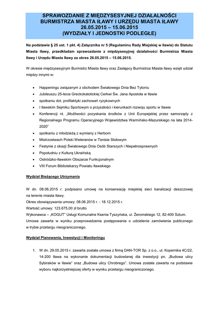 SPRAWOZDANIE Z MIĘDZYSESYJNEJ DZIAŁALNOŚCI BURMISTRZA MIASTA IŁAWY I URZĘDU MIASTA IŁAWY 26.05.2015 – 15.06.2015 (WYDZIAŁY I JEDNOSTKI PODLEGŁE) Na podstawie § 25 ust. 1 pkt. 4) Załącznika nr 5 (Regulaminu Rady Miejskiej w Iławie) do Statutu Miasta Iławy, przedkładam sprawozdanie z międzysesyjnej działalności Burmistrza Miasta Iławy i Urzędu Miasta Iławy za okres 26.05.2015 – 15.06.2015. W okresie międzysesyjnym Burmistrz Miasta Iławy oraz Zastępcy Burmistrza Miasta Iławy wzięli udział między innymi w: Happeningu związanym z obchodem Światowego Dnia Bez Tytoniu Jubileuszu 25-lecia Greckokatolickiej Cerkwi Św. Jana Apostoła w Iławie spotkaniu dot. profilaktyki zachowań ryzykownych I Iławskim Sejmiku Sportowym o przyszłości i kierunkach rozwoju sportu w Iławie Konferencji nt. „Możliwości pozyskania środków z Unii Europejskiej przez samorządy z Regionalnego Programu Operacyjnego Województwa Warmińsko-Mazurskiego na lata 20142020” spotkaniu z młodzieżą z wymiany z Herborn Mistrzostwach Polski Weteranów w Tenisie Stołowym Festynie z okazji Światowego Dnia Osób Starszych i Niepełnosprawnych Popołudniu z Kulturą Ukraińską Ostródzko-Iławskim Obszarze Funkcjonalnym VIII Forum Bibliotekarzy Powiatu Iławskiego Wydział Bieżącego Utrzymania W dn. 08.06.2015 r. podpisano umowę na konserwację miejskiej sieci kanalizacji deszczowej na terenie miasta Iławy. Okres obowiązywania umowy: 08.06.2015 r. - 18.12.2015 r. Wartość umowy: 123.675,00 zł brutto Wykonawca – „KOGUT” Usługi Komunalne Ksenia Tyszyńska, ul. Żeromskiego 12, 82-400 Sztum. Umowa zawarta w wyniku przeprowadzenia postępowania o udzielenie zamówienia publicznego w trybie przetargu nieograniczonego. Wydział Planowania, Inwestycji i Monitoringu 1. W dn. 29.05.2015 r. zawarta została umowa z firmą DAN-TOR Sp. z o.o., ul. Kopernika 4C/22, 14-200 Iława na wykonanie dokumentacji budowlanej dla inwestycji pn. „Budowa ulicy Sybiraków w Iławie” oraz „Budowa ulicy Chrobrego”. Umowa została zawarta na podstawie wyboru najkorzystniejszej oferty w wyniku przetargu nieograniczonego. Wartość umowy opiewa na kwotę ryczałtową brutto 28.659,00 zł. Termin zakończenia realizacji przedmiotu zamówienia przewidziany jest na 30 listopada 2015 r. 2. W dn. 28.05.2015 r. odbył się odbiór końcowy przebudowy ulicy Bydgoskiej. Zadanie wykonywało W.Z.U-P i H „SPOMER” Sp. z o.o. Iława za kwotę 261.858,17 zł. 3. W dn. 01.06.2015 r. odbyły się ostatnie czynności odbiorowe Portu Śródlądowego w Iławie. Miasto Iława, jako partner Projektu finansował zakres związany z komunikacją Portu (ul. Chodkiewicza, połączenie z ul. Mazurską, chodniki, parkingi, zieleńce, infrastruktura techniczna związana z drogą, tj. oświetlenie, kanalizacja deszczowa). 4. W dn. 03.06.2015 r. podpisano umowę z Przedsiębiorstwem Remontowo-Budowlanym „REMBUD-PBK” Sp. z o.o. Iława na budowę ulicy Lipowej etap I na kwotę 647.761,00 zł. Termin realizacji do 30.09.2016 r. 5. W dn. 08.06.2015r. odbył się odbiór końcowy prac budowlanych związanych z rozbiórką starego pomostu i budową nowego pomostu, wygrodzeniem i urządzeniem wodnego placu zabaw na plaży przy ul. Kajki. Aktualnie oczekujemy na decyzję pozwolenia na użytkowanie. 6. W dn. 08.06.2015 r. odbył się odbiór końcowy rozbudowy cmentarza komunalnego przy ul. Piaskowej. Zadanie wykonywało przedsiębiorstwo Usług komunalnych „EKO” Sp. z o.o. za kwotę 116.128, 14 zł. Ochrona Środowiska W dn. 09.06.2015 r. w Samorządowej Szkole Podstawowej Nr 4 im. Polskich Podróżników w Iławie odbyła się Jubileuszowa XV Miejsko-Gminna Olimpiada Ekologiczna klas I-III pod hasłem "Swój region znamy i o niego dbamy". Patronat nad Olimpiadą objęli Burmistrz Miasta oraz Nadleśnictwo Iława. Zwycięzcą tegorocznej Olimpiady są uczniowie ze Szkoły Podstawowej Nr 3 w Iławie. Wydział Promocji i Współpracy z Zagranicą 1. W dn. 26.09.2015 r. w Iławie odbędzie się pierwsza edycja Pikniku Inspiracji Nad Małym Jeziorakiem. Jest to wydarzenie skierowane głównie do najmłodszych mieszkańców naszego regionu, mające na celu przybliżenie zagadnień naukowo-technicznych w atrakcyjnej formie. Wydział Promocji i Współpracy z Zagranicą jest odpowiedzialny za sferę informacyjną (strona internetowa, facebook) oraz organizacyjną Pikniku Inspiracji. 09.06.2015 r., na potrzeby kampanii promocyjnej imprezy odbyła się sesja zdjęciowa w Szkole Podstawowej Nr 3 w Iławie. Wzięło w niej udział dwoje uczniów pierwszej klasy – Lidka i Michaś. Efekty będzie można zobaczyć niebawem. W ramach działań promocyjnych planowana jest aktywizacja każdej z iławskich szkół. 2. W dn. 12.06.2015 r. o godz. 18:00 w Galerii Jeziorak odbył się wernisaż wystawy zdjęć iławskiego fotografika - Andrzeja Świdzińskiego. We współczesny krajobraz Iławy autor dbale wkomponował wizerunki przedwojennych budowli i budynków. To pierwsza w historii wystawa tego typu zdjęć w Iławie, a zarazem okazja do zobaczenia, jak architektonicznie na przestrzeni kilkudziesięciu lat zmieniło się nasze miasto. 17 prac zostało okraszonych komentarzem miejskiego przewodnika, Dariusza Paczkowskiego. Wstęp był nieodpłatny, a wystawa trwa do 28 czerwca. Głównym organizatorem wystawy był Wydział Promocji i Współpracy z Zagranicą. 3. Czerwiec to miesiąc, w którym oficjalnie rozpoczęto wycieczki na wieżę ratuszową. Piękna Iława i okolice z nieznanej dotąd perspektywy będą dostępne na wyciągnięcie ręki mieszkańca i turysty. W czerwcu w każdą środę i piątek od godz. 12:00 do 12:45 będzie możliwość wejścia na wieżę iławskiego ratusza z licencjonowanym przewodnikiem miejskim, Dariuszem Paczkowskim. Pomysł na atrakcje dla turystów i mieszkańców wypłynął z Wydziału Promocji i Współpracy z Zagranicą. 4. Już w drugiej połowie czerwca światło dziennie ujrzy Iławski Niezbęd