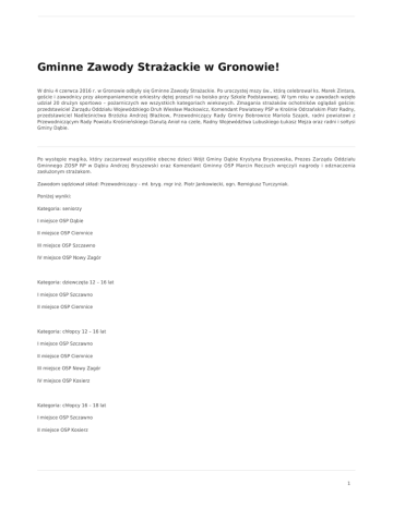 Gminne Zawody Strażackie w Gronowie! W dniu 4 czerwca 2016 r. w Gronowie odbyły się Gminne Zawody Strażackie. Po uroczystej mszy św., którą celebrował ks. Marek Zintara, goście i zawodnicy przy akompaniamencie orkiestry dętej przeszli na boisko przy Szkole Podstawowej. W tym roku w zawodach wzięło udział 20 drużyn sportowo – pożarniczych we wszystkich kategoriach wiekowych. Zmagania strażaków ochotników oglądali goście: przedstawiciel Zarządu Oddziału Wojewódzkiego Druh Wiesław Mackowicz, Komendant Powiatowy PSP w Krośnie Odrzańskim Piotr Radny, przedstawiciel Nadleśnictwa Brzózka Andrzej Błażkow, Przewodniczący Rady Gminy Bobrowice Mariola Szajek, radni powiatowi z Przewodniczącym Rady Powiatu Krośnieńskiego Danutą Anioł na czele, Radny Województwa Lubuskiego Łukasz Mejza oraz radni i sołtysi Gminy Dąbie. Po występie magika, który zaczarował wszystkie obecne dzieci Wójt Gminy Dąbie Krystyna Bryszewska, Prezes Zarządu Oddziału Gminnego ZOSP RP w Dąbiu Andrzej Bryszewski oraz Komendant Gminny OSP Marcin Reczuch wręczyli nagrody i odznaczenia zasłużonym strażakom. Zawodom sędziował skład: Przewodniczący - mł. bryg. mgr inż. Piotr Jankowiecki, ogn. Remigiusz Turczyniak. Poniżej wyniki: Kategoria: seniorzy I miejsce OSP Dąbie II miejsce OSP Ciemnice III miejsce OSP Szczawno IV miejsce OSP Nowy Zagór Kategoria: dziewczęta 12 – 16 lat I miejsce OSP Szczawno II miejsce OSP Ciemnice Kategoria: chłopcy 12 – 16 lat I miejsce OSP Szczawno II miejsce OSP Ciemnice III miejsce OSP Nowy Zagór IV miejsce OSP Kosierz Kategoria: chłopcy 16 – 18 lat I miejsce OSP Szczawno II miejsce OSP Kosierz 1 Kategoria: do 12 lat 2 drużyny OSP Dąbie, 2 drużyny OSP Kosierz, 2 drużyny OSP Nowy Zagór, 2 drużyny OSP Szczawno W kategorii do 12 lat nie prowadzono klasyfikacji, wszystkie drużyny zaliczyły ćwiczenie bojowe i sztafetę. Imprezę uświetnił pokaz tańca zumba w wykonaniu grup tanecznych z Ciemnic i Gronowa pod kierownictwem Emilii Myśliwiec, który porywał do tańca w swoich latynoskich rytmach. Wystąpił także WASYL - Dominik Złotniak – nasz raper z Ciemnic. Goście oraz mieszkańcy bawili się do późna przy muzyce zespołu Kaśka Band. Serdeczne podziękowania dla Sołtys wsi Gronów Renaty Stelmach. Do zobaczenia za rok! 2