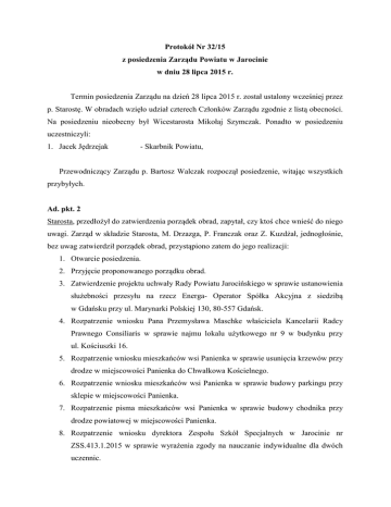Protokół Nr 32/15 z posiedzenia Zarządu Powiatu w Jarocinie w dniu 28 lipca 2015 r. Termin posiedzenia Zarządu na dzień 28 lipca 2015 r. został ustalony wcześniej przez p. Starostę. W obradach wzięło udział czterech Członków Zarządu zgodnie z listą obecności. Na posiedzeniu nieobecny był Wicestarosta Mikołaj Szymczak. Ponadto w posiedzeniu uczestniczyli: 1. Jacek Jędrzejak - Skarbnik Powiatu, Przewodniczący Zarządu p. Bartosz Walczak rozpoczął posiedzenie, witając wszystkich przybyłych. Ad. pkt. 2 Starosta, przedłożył do zatwierdzenia porządek obrad, zapytał, czy ktoś chce wnieść do niego uwagi. Zarząd w składzie Starosta, M. Drzazga, P. Franczak oraz Z. Kuzdżał, jednogłośnie, bez uwag zatwierdził porządek obrad, przystąpiono zatem do jego realizacji: 1. Otwarcie posiedzenia. 2. Przyjęcie proponowanego porządku obrad. 3. Zatwierdzenie projektu uchwały Rady Powiatu Jarocińskiego w sprawie ustanowienia służebności przesyłu na rzecz Energa- Operator Spółka Akcyjna z siedzibą w Gdańsku przy ul. Marynarki Polskiej 130, 80-557 Gdańsk. 4. Rozpatrzenie wniosku Pana Przemysława Maschke właściciela Kancelarii Radcy Prawnego Consiliaris w sprawie najmu lokalu użytkowego nr 9 w budynku przy ul. Kościuszki 16. 5. Rozpatrzenie wniosku mieszkańców wsi Panienka w sprawie usunięcia krzewów przy drodze w miejscowości Panienka do Chwałkowa Kościelnego. 6. Rozpatrzenie wniosku mieszkańców wsi Panienka w sprawie budowy parkingu przy sklepie w miejscowości Panienka. 7. Rozpatrzenie pisma mieszkańców wsi Panienka w sprawie budowy chodnika przy drodze powiatowej w miejscowości Panienka. 8. Rozpatrzenie wniosku dyrektora Zespołu Szkół Specjalnych w Jarocinie nr ZSS.413.1.2015 w sprawie wyrażenia zgody na nauczanie indywidualne dla dwóch uczennic. 9. Rozpatrzenie wniosku Dyrektora Zespołu Szkół Ponadgimnazjalnych nr 2 w Jarocinie nr ZSP072/18/2015 w sprawie zaopiniowania wysokości stawek za wynajem sali gimnastycznej, sal lekcyjnych, pracowni szkolnych oraz powierzchni użytkowej i reklamowej w budynkach ZSP nr 2 w Jarocinie. 10. Rozpatrzenie pisma Dyrektora Zespołu Szkół Przyrodniczo- Biznesowych w Tarcach z prośbą o wyrażenie zgody na zatrudnienie osób nie będących nauczycielami do prowadzenia specjalistycznych zajęć dydaktycznych z przedmiotów zawodowych. 11. Rozpatrzenie pisma Dyrektora Zespołu Szkół Przyrodniczo- Biznesowych w Tarcach nr ZSP-B.302.14.2015.KD w sprawie zmian w planie finansowym na 2015 r. 12. Rozpatrzenie pisma Dyrektora Domu Pomocy Społecznej w Zakrzewie nr DPSIII/0303/28/15 w sprawie zmian w planie finansowym na 2015 r. 13. Rozpatrzenie pisma Dyrektora Powiatowego Urzędu Pracy w Jarocinie nr FK.0320. 24.2015.ZT w sprawie zmian w planie finansowym na 2015 r. 14. Przyjęcie do wiadomości odpowiedzi Prezesa Szpitala Powiatowego w Jarocinie Spółka z o.o. na wniosek L. Mazurka w sprawie środków na budowę lądowiska. 15. Rozpatrzenie pisma Komisji Rolnictwa i Ochrony Środowiska nr A-OB.BR.0014.14.2015.PA w sprawie zwrócenia się do Ministra Środowiska w Warszawie o uznanie norki amerykańskiej jako gatunku inwazyjnego. 16. Rozpatrzenie projektu uchwały Zarządu Powiatu Jarocińskiego w sprawie podania do publicznej wiadomości kwartalnej informacji o wykonaniu budżetu jednostki samorządu terytorialnego. 17. Zatwierdzenie projektu uchwały Rady Powiatu Jarocińskiego w sprawie emisji obligacji komunalnych. 18. Zatwierdzenie projektu uchwały Rady Powiatu Jarocińskiego zmieniającego uchwałę w sprawie Wieloletniej Prognozy Finansowej Powiatu Jarocińskiego na lata 20152024. 19. Zatwierdzenie projektu uchwały Rady Powiatu Jarocińskiego w sprawie zmian budżetu powiatu na 2015 r. 20. Sprawy bieżące. Ad. pkt 3. Starosta przedłożył do zatwierdzenia projekt uchwały Rady Powiatu Jarocińskiego w sprawie ustanowienia służebności przesyłu na rzecz Energa- Operator Spółka Akcyjna z siedzibą w Gdańsku przy ul. Marynarki Polskiej 130, 80-557 Gdańsk. Projekt uchwały stanowi załącznik nr1 do protokołu. Przedmiotem uchwały jest ustanowienie nieodpłatnej służebności przesyłu na nieruchomości stanowiącej własność Powiatu Jarocińskiego, zapisanej w ewidencji wsi Bachorzew dz.nr 316/5, na rzecz ENERGA- OPERATOR Spółka Akcyjna. Spółka uzasadnia potrzebę ustanowienia służebności przesyłu koniecznością posadowienia urządzeń elektroenergetycznych w postaci przyłącza kablowego niskiego napięcia do zasilania działki nr 316/2, na której budowana jest siedziba Komendy Powiatowej Policji w Jarocinie. Zarząd nie miał uwag. Jednogłośnie w składzie Starosta, M. Drzazga, P. Franczak oraz Z. Kuzdżał zatwierdził projekt uchwały. Ad. pkt 4. Zarząd zapoznał się z pismem Pana Przemysława Maschke właściciela Kancelarii Radcy Prawnego Consiliaris w sprawie najmu lokalu użytkowego nr 9 w budynku przy ul. Kościuszki 16. Pismo stanowi załącznik nr 2 do protokołu. Zarząd, po zapoznaniu się z pismem, zdecydował, aby Referat Geodezji i Gospodarki Nieruchomościami przygotował informację, czy jest możliwość wyjęcia tego lokalu, na jaki okres, jaka jest proponowana stawka czynszu. W głosowaniu wzięło udział czterech Członków Zarządu (Starosta, M. Drzazga, P. Franczak oraz Z. Kuzdżał). Ad. pkt 5. Starosta przedłożył do rozpatrzenia pismo Mieszkańców Wsi Panienka w sprawie usunięcia krzewów przy drodze w miejscowości Panienka do Chwałkowa Kościelnego. Pismo stanowi załącznik nr 3 do protokołu. Mieszkańcy wsi Panienka zwrócili się z prośbą o usunięcie krzewów przy drodze z miejscowości Panienka do Chwałkowa Kościelnego, celem poprawy bezpieczeństwa uczestników drogi. Zarząd w składzie Starosta, M. Drzazga, P. Franczak oraz Z. Kuzdżał, jednogłośnie zdecydował o przekazaniu wniosku do Referatu Dróg Powiatowych celem przeanalizowania sprawy. Ad. pkt 6. Członkowie Zarządu w składzie Starosta, M. Drzazga, P. Franczak