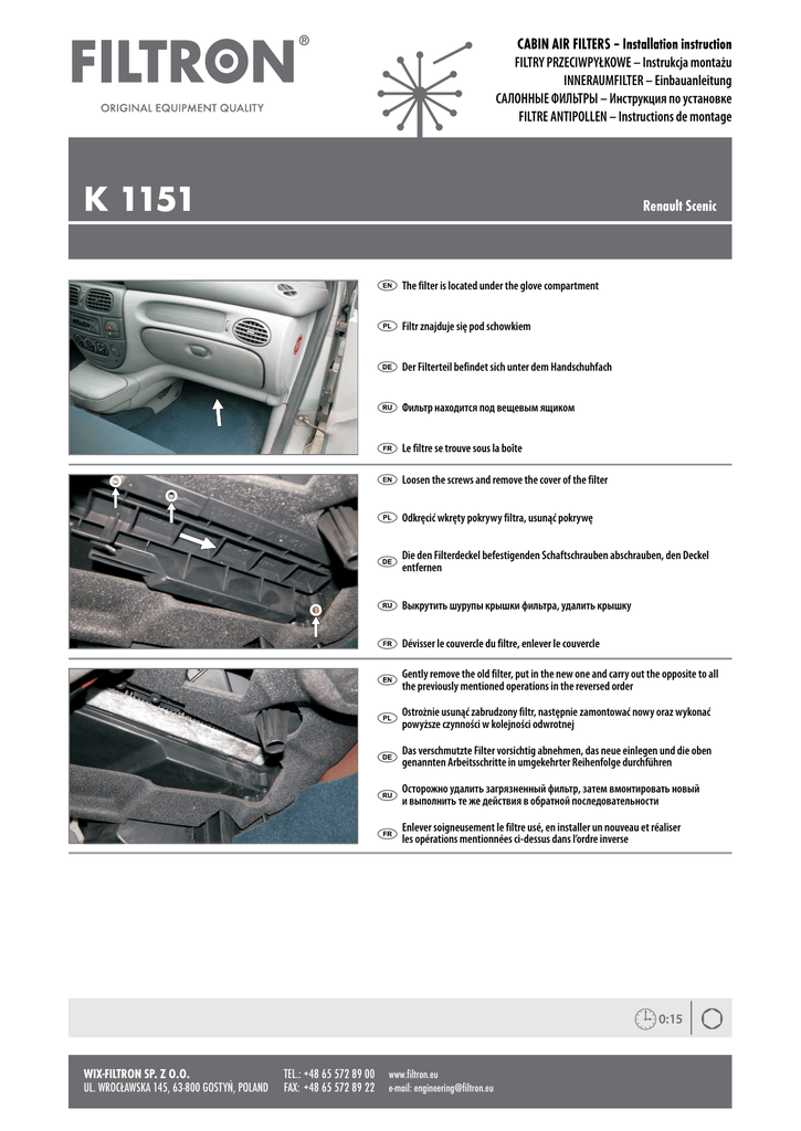 CABIN AIR FILTERS – Installation instruction FILTRY PRZECIWPYŁKOWE – Instrukcja montażu INNERAUMFILTER – Einbauanleitung САЛОННЫЕ ФИЛЬТРЫ – Инструкция по установке FILTRE ANTIPOLLEN – Instructions de montage K 1151 Renault Scenic The filter is located under the glove compartment Filtr znajduje się pod schowkiem Der Filterteil befindet sich unter dem Handschuhfach Фильтр находится под вещевым ящиком Le filtre se trouve sous la boîte Loosen the screws and remove the cover of the filter Odkręcić wkręty pokrywy filtra, usunąć pokrywę Die den Filterdeckel befestigenden Schaftschrauben abschrauben, den Deckel entfernen Выкрутить шурупы крышки фильтра, удалить крышку Dévisser le couvercle du filtre, enlever le couvercle Gently remove the old filter, put in the new one and carry out the opposite to all the previously mentioned operations in the reversed order Ostrożnie usunąć zabrudzony filtr, następnie zamontować nowy oraz wykonać powyższe czynności w kolejności odwrotnej Das verschmutzte Filter vorsichtig abnehmen, das neue einlegen und die oben genannten Arbeitsschritte in umgekehrter Reihenfolge durchführen Осторожно удалить загрязненный фильтр, затем вмонтировать новый и выполнить те же действия в обратной последовательности Enlever soigneusement le filtre usé, en installer un nouveau et réaliser les opérations mentionnées ci-dessus dans l’ordre inverse 0:15 WIX-FILTRON SP. Z O.O. TEL.:+48 65 572 89 00 www.filtron.eu UL. WROCŁAWSKA 145, 63-800 GOSTYŃ, POLAND FAX: +48 65 572 89 22 e-mail: [email protected]