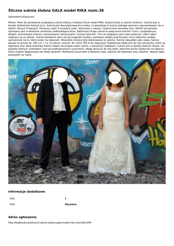 Śliczna suknia ślubna GALA model RIKA rozm.38 [Sprzedam] Klasyczna Witam, Mam do sprzedania przepiękną suknię ślubną z kolekcji GALA model RIKA. Kupiona była w salonie ślubnym. Suknia jest w bardzo delikatnym kolorze ecru. Suknia jest dwuczęściowa plus halka, co powoduję iż można jednego wieczoru zaprezentować się w dwóch różnych kreacjach. Pierwsza część w kształcie rybki, wykonana z satyny i wykończona warstwą tiulu. Dekolt tej warstwy wykrojony jest w delikatne serduszko podkreślające biust. Natomiast druga suknia to połączenie koronki i tiulu z przepięknym, długim, koronkowym trenem, koronkowymi ramiączkami i krytymi plecami. Tren po podpięciu jest mało widoczny. Obie części zapinane są na zamek. Suknia delikatnie różni się od oryginału modelu, ponieważ ozdoby pod biustem (trzy kółeczka) zostały wymienione na te, które widać na zdjęciach. Wszystkie zmiany były dokonywane w salonie. Suknię zakupiłam jako nową. Suknia pasuje na wzrost ok. 165 cm + 11 cm obcas, rozmiar 38. Cena 750 zł do negocjacji! Dodatkowo dołączam do niej ramiączka, które są dopinane oraz złotą tasiemkę (którą miałam do drugiej części sukni), z doszytymi ozdobami. Suknia jest w bardzo dobrym stanie, nie posiada żadnych uszkodzeń i jest po profesjonalnym czyszczeniu. Mogę dorzucić do niej złote, skórzane buciki (widoczne na zdjęciu), które miałam dopasowane do złotej tasiemki. Możliwość przymiarki w Bytomiu (woj. śląskie) lub Pątnowie (woj. łódzkie). Więcej zdjęć przesyłam na maila. Informacje dodatkowe Ilość 1 Stan Używany Adres ogłoszenia http://todoslubu.pl/sliczna-suknia-slubna-gala-model-rika-rozm38,o299 Kontakt Mail: [email protected] Telefon: Lokalizacja , Bytom Śląskie (Polska) Ogłoszenie dodano: 2016-11-04 09:17:20 Ogłoszenie wygasa: 2020-12-04 09:17:20 Powered by TCPDF (www.tcpdf.org)