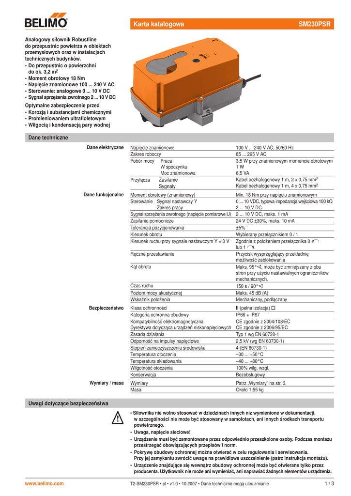 Karta katalogowa SM230PSR Analogowy siłownik Robustline do przepustnic powietrza w obiektach przemysłowych oraz w instalacjach technicznych budynków. •Do przepustnic o powierzchni do ok. 3,2 m2 •Moment obrotowy 18 Nm •Napięcie znamionowe 100 ... 240 V AC •Sterowanie: analogowe 0 ... 10 V DC • Sygnał sprzężenia zwrotnego 2 ... 10 V DC Optymalne zabezpieczenie przed •Korozją i substancjami chemicznymi •Promieniowaniem ultrafioletowym •Wilgocią i kondensacją pary wodnej Dane techniczne Dane elektryczne Napięcie znamionowe Zakres roboczy Pobór mocy Praca W spoczynku Moc znamionowa Przyłącza Zasilanie 100 V ... 240 V AC, 50/60 Hz 85 ... 265 V AC 3,5 W przy znamionowym momencie obrotowym 1W 6,5 VA Kabel bezhalogenowy 1 m, 2 x 0,75 mm2 Kabel bezhalogenowy 1 m, 4 x 0,75 mm2 Moment obrotowy (znamionowy) Sterowanie Sygnał nastawczy Y Zakres pracy Sygnał sprzężenia zwrotnego (napięcie pomiarowe U) Zasilanie pomocnicze Tolerancja pozycjonowania Kierunek obrotu Kierunek ruchu przy sygnale nastawczym Y = 0 V Czas ruchu Poziom mocy akustycznej Wskaźnik położenia Min. 18 Nm przy napięciu znamionowym 0 ... 10 VDC, typowa impedancja wejściowa 100 kΩ 2 ... 10 V DC 2 ... 10 V DC, maks. 1 mA 24 V DC ±30%, maks. 10 mA ±5% Wybierany przełącznikiem 0 / 1 Zgodnie z położeniem przełącznika 0 lub 1 Przycisk wysprzęglający przekładnię możliwość zablokowania Maks. 95° , może być zmniejszany z obu stron przy użyciu nastawialnych ograniczników mechanicznych. 150 s / 90° Maks. 45 dB (A) Mechaniczny, podłączany Bezpieczeństwo Klasa ochronności Kategoria ochronna obudowy Kompatybilność elektromagnetyczna Dyrektywa dotycząca urządzeń niskonapięciowych Zasada działania Odporność na impulsy napięciowe Stopień zanieczyszczenia środowiska Temperatura otoczenia Temperatura składowania Wilgotność otoczenia Konserwacja II (pełna izolacja) IP66 + IP67 CE zgodnie z 2004/108/EC CE zgodnie z 2006/95/EC Typ 1 wg EN 60730-1 2,5 kV (wg EN 60730-1) 4 (EN 60730-1) –30 ... +50°C –40 ... +80°C 100% wilg. wzgl. Bezobsługowy Wymiary / masa Wymiary Masa Patrz „Wymiary” na str. 3. Około 1,55 kg Sygnały Dane funkcjonalne Ręczne przestawianie Kąt obrotu Uwagi dotyczące bezpieczeństwa ! www.belimo.com • Siłownika nie wolno stosować w dziedzinach innych niż wymienione w dokumentacji, w szczególności nie może być stosowany w samolotach, ani innych środkach transportu powietrznego. • Uwaga, napięcie sieciowe! • Urządzenie musi być zamontowane przez odpowiednio przeszkolone osoby. Podczas montażu przestrzegać obowiązujących przepisów i norm. • Pokrywę obudowy ochronnej można otwierać w celu regulowania i serwisowania. Przy jej zamykaniu zwrócić uwagę na prawidłowe uszczelnienie (patrz instrukcja montażu). • Urządzenie znajdujące się wewnątrz obudowy ochronnej może być otwierane tylko przez producenta. Użytkownik nie może ani wymieniać, ani naprawiać żadnych elementów urządzenia. T2-SM230PSR • pl • v1.0 • 10.2007 • Dane techniczne mogą ulec zmianie 1/3 SM230PSR Analogowy siłownik Robustline do przepustnic, 100 ... 240 V AC, 18 Nm Uwagi dotyczące bezpieczeństwa (ciąg dalszy) • Nie wolno odłączać kabla od urządzenia. • Przy obliczaniu wymaganego momentu obrotowego trzeba uwzględnić dane dostarczone przez producentów przepustnic (przekrój, konstrukcja, miejsce montażu), jak również warunki przepływu powietrza. • Urządzenie zawiera elementy elektroniczne. Nie wolno go wyrzucać wraz z odpadami domowymi. Ze zużytym lub uszkodzonym urządzeniem trzeba postępować zgodnie z obowiązującymi przepisami dotyczącymi utylizacji odpadów. • Informacje o odporności na działanie substancji chemicznych odnoszą się do testów laboratoryjnych przeprowadzanych z surowcami oraz gotowymi produktami, jak również do prób we wskazanych obszarach zastosowań. • Zastosowane materiały mogą być narażone na działanie czynników zewnętrznych (temperatury, ciśnienia, naprężeń związanych z mocowaniem, substancji chemicznych, itp.), których nie można symulować w warunkach laboratoryjnych, ani podczas prób terenowych. • Z tego powodu informacje dotyczące obszarów zastosowań oraz odporności można traktować tylko jako wytyczne. W przypadku wątpliwości zalecamy wykonanie odpowiednich testów. Zamieszczone tu informacje nie uprawniają do dochodzenia roszczeń na drodze prawnej. W tym zakresie firma Belimo nie może być pociągana do odpowiedzialności i nie udziela żadnych gwarancji. Odporność chemiczna lub mechaniczna zastosowanych materiałów nie jest wystarczającym kryterium przy ocenie przydatności produktu. Trzeba uwzględnić przepisy dotyczące łatwopalnych cieczy, takich jak np. rozpuszczalniki, ze szczególnym uwzględnieniem ochrony przeciwwybuchowej. Cechy charakterystyczne wyrobu Zakres zastosowań Odporność Zastosowane materiały Zasada działania Łatwy montaż bezpośredni Test Norma Instytucja wykonująca test Działanie szkodliwych gazów Próba w mgle solnej Działanie amoniaku Próba klimatyczna Środki odkażające (zwierzęta) Promieniowanie ultrafioletowe (prom. słoneczne na poziomie ziemi) EN 60068-2-60 EN 60068-2-52 DIN 50916-2 IEC 60068-2-30 Fraunhofer Institute ICT / Niemcy Fraunhofer Institute ICT / Niemcy Fraunhofer Institute ICT / Niemcy Trikon Solutions AG / Szwajcaria Trikon Solutions AG / Szwajcaria EN 60068-2-5 EN 60068-2-63 Elementy siłownika Materiał Obudowa siłownika Przepusty kablowe / oś wydrążona Kabel połączeniowy Zacisk / śruby (ogólnie) Uszczelki Wkładka kształtowa Polipropylen (PP) Poliamid (PA) FRNC Stal 1,4404 EPDM Aluminium anodyzowane Quinel / Zug Szwajcaria Do sterowania siłownikiem jest używany standardowy sygnał nastawczy 0 ... 10 V DC. Siłownik ustawia się do pozycji zgodnej z sygnałem nastawczym. Napięcie pomiarowe U służy do elektrycznego sygnalizowania położenia przepustnicy 0 ... 100% o