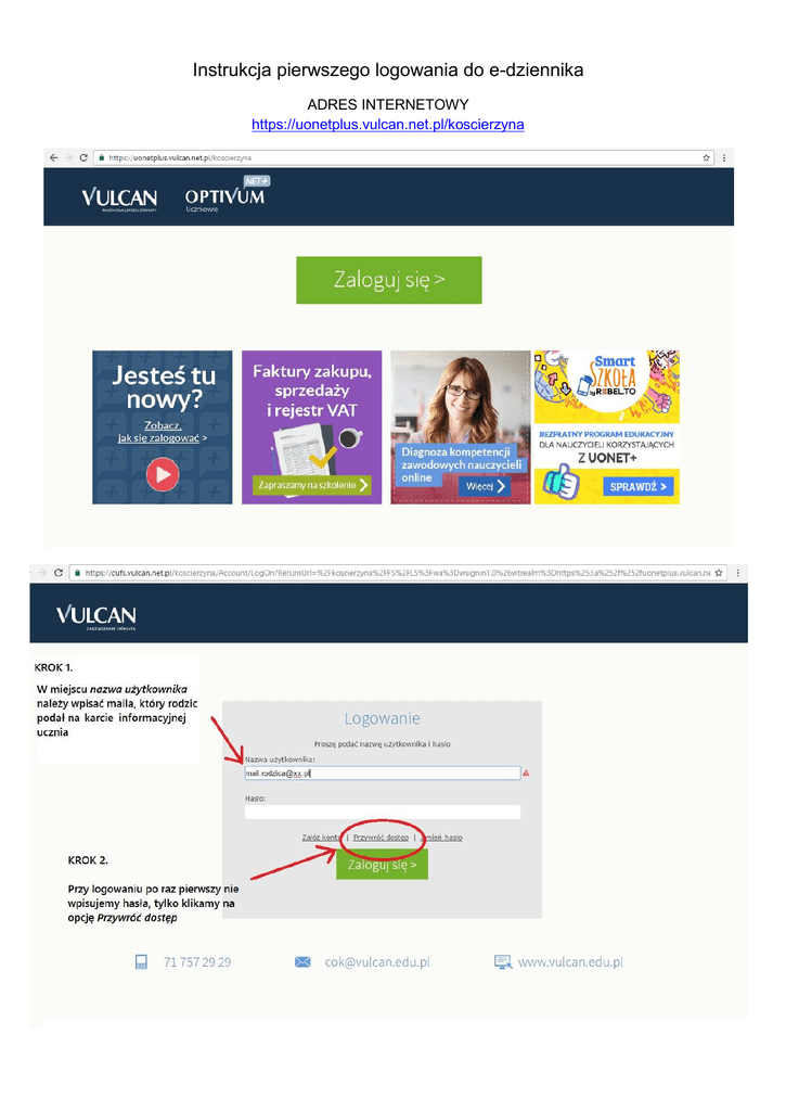 Instrukcja pierwszego logowania do e-dziennika ADRES INTERNETOWY https://uonetplus.vulcan.net.pl/koscierzyna Po zaznaczeniu ikonki Nie jestem robotem należy kliknąć na Wyślij wiadomość. W tym momencie powinien ukazać się poniższy komunikat: Na podanego maila wysłana zostanie wiadomość z Centralnego Rejestru Użytkownika. W treści znajdą Państwo link aktywacyjny (podświetlony na niebiesko). Kolejnym etapem będzie ustalenie indywidualnego hasła do logowania. Hasło to musi spełniać kilka reguł: - musi zawierać najmniej 8 znaków, - duże i małe litery, - cyfry oraz znaki specjalne (np. !@#$%^) Przejście przez powyższą procedurę umożliwi standardowe logowanie się na platformę Uczeń poprzez wpisanie nazwy użytkownika (maila) oraz wygenerowanego hasła. Dodatkowo należy pamiętać, że system wymaga, aby hasło zostało zmieniane co 30 dni. APLIKACJA MOBILNA Od tej pory również możliwe będzie logowanie się do e-dziennika za pośrednictwem aplikacji mobilnej*. Szczegóły oraz instrukcja rejestracji konta na urządzeniu mobilnym znajdziecie Państwo na stronie internetowej: https://www.vulcan.edu.pl/strona/aplikacja-mobilna-dzienniczek-293 *aby korzystać z aplikacji, należy wykonać logowanie na urządzeniu stacjonarnym w celu jej prawidłowego funkcjonowania.