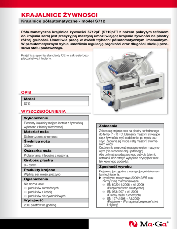 KRAJALNICE ŻYWNOŚCI Krajalnice półautomatyczne - model S712 Półautomatyczna krajalnica żywności S712pF (S712pFT z nożem pokrytym teflonem do krojenia sera) jest precyzyjną maszyną umożliwiającą krojenie żywności na plastry różnej grubości. Umożliwia pracę w dwóch trybach: półautomatycznym i manualnym. W półautomatycznym trybie umożliwia regulację prędkości oraz długości (skoku) przesuwu stołu podawczego. Krajalnica spełnia standardy CE w zakresie bezpieczeństwa i higieny. OPIS Model S712 WYSZCZEGÓLNIENIA Wykończenie Elementy krajalnicy mające kontakt z żywnością wykonano z blachy nierdzewnej Materiał noża Stal nierdzewna chromowa Średnica noża 300mm Ostrzarka noża Profesjonalna, integralna z maszyną. Grubość plastra 0 – 28mm Produkty krojone Wędlina, ser, mięso, pieczywo Ograniczenia Nie można kroić: A produktów zamrożonych A produktów z kością A produktów nie żywnościowych Wydajność 2300 plastrów na godzinę. Zalecenia Zaleca się krojenie sera na plastry schłodzonego do temp. 7 - 10 O C. Elementy maszyny stykające się z żywnością myć codziennie, po myciu osuszyć. Zabrania się mycia całej maszyny strumieniem wody. Codziennie smarować maszynę olejem maszynowym (nie stosować oleju jadalnego). Aby uniknąć przedwczesnego zużycia ściernic ostrzarki, nóż ostrzyć wyłącznie czysty (bez resztek krojonego produktu). Zgodność wyrobu Krajalnica jest zgodna z następującymi dokumentami odniesienia: w dyrektywa maszynowa 2006/42/WE oraz normy z nią zharmonizowane: A EN 60204-1:2006 + A1:2009 (Bezpieczeństwo elektryczne) A EN 953:1997 + A1:2009 (Osłony części ruchomych) A EN 1974:1998 + A1:2009 (Krajalnice – Wymagania bezpieczeństwa i higieny) KRAJALNICE ŻYWNOŚCI Krajalnice półautomatyczne - model S712 TABLICA WYMIAROWA WYMIARY Krajalnice: S712pF, S712pFT A B C 306mm 522mm 652mm D E F 627mm 290mm 520mm DANE TECHNICZNE (specyfikacja) Krajalnice: S712pF, S712pFT Wymiary gabarytowe 687 x 520 x 627(H)mm Rozstaw nóżek 520 x 290mm Grubość krojonego plastra 0 - 28mm (regulacja płynna) Max. wymiar krojenia 230mm (długość), wysokość jest uzależniona od długości, max. 190mm Średnica noża 300mm Poziom hałasu ≤ 54dB Zasilanie 230V 50Hz 1 faza Moc 250W (napęd noża), 180W (napęd stołu) Waga (ciężar netto) 50kG Opcje Zasilanie 115V 60Hz 1 faza Uwagi Krajalnica S712pFT jest przeznaczona głównie do krojenia sera, różni się od krajalnicy S712pF tym, iż nóż, pokrywa noża, płyta oporowa są pokryte teflonem oraz zastosowano wzmocniony napęd o większym momencie. SPECYFIKACJE WYSYŁKOWE Wymiary kartonu Krajalnice S712pF S712pFT Długość 650mm 650mm Szerokość 550mm 550mm Wysokość 760mm 760mm Ciężar brutto 75kG 75kG
