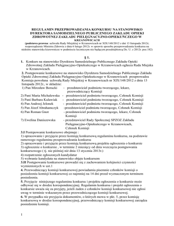 REGULAMIN PRZEPROWADZANIA KONKURSU NA STANOWISKO DYREKTORA SAMODZIELNEGO PUBLICZNEGO ZAKŁADU OPIEKI ZDROWOTNEJ ZAKŁADU PIELĘGNACYJNO-OPIEKUŃCZEGO W KRZANOWICACH (podstawa prawna: uchwała Rady Miejskiej w Krzanowicach nr XIX/148/2012 z dni 13 listopada 2012r; rozporządzenie Ministra Zdrowia z dnia 6 lutego 2012r. w sprawie sposobu przeprowadzania konkursu na niektóre stanowiska kierownicze w podmiocie leczniczym nie będącym przedsiębiorcą Dz. U. z 2012r. poz.182) § 1. 1. Konkurs na stanowisko Dyrektora Samodzielnego Publicznego Zakładu Opieki Zdrowotnej Zakładu Pielęgnacyjno-Opiekuńczego w Krzanowicach ogłasza Rada Miejska w Krzanowicach. 2. Postępowanie konkursowe na stanowisko Dyrektora Samodzielnego Publicznego Zakładu Opieki Zdrowotnej Zakładu Pielęgnacyjno-Opiekuńczego w Krzanowicach przeprowadza Komisja powołana uchwałą Rady Miejskiej w Krzanowicach nr XIX/148/2012 z dnia 13 listopada 2012r., w składzie: 1) Pan Mirosław Borucki - przedstawiciel podmiotu tworzącego, lekarz, przewodniczący Komisji 2) Pani Maria Michalewska - przedstawiciel podmiotu tworzącego, Członek Komisji 3) Pani Barbara Kulawiak - przedstawiciel podmiotu tworzącego, Członek Komisji 4) Pan Andrzej Jelonek - przedstawiciel podmiotu tworzącego, Członek Komisji 5) Pan Józef Abrahamczyk -przedstawiciel podmiotu tworzącego, Członek Komisji 6) Pan Roman Gnot - przedstawiciel podmiotu tworzącego, lekarz, Członek Komisji 7) Ewelina Daniszewska - przedstawiciel Rady Społecznej SPZOZ Zakładu Pielęgnacyjno-Opiekuńczego w Krzanowicach, Członek Komisji 3.I Postepowanie konkursowe obejmuje : 1) opracowanie i przyjęcie przez komisję konkursową regulaminu konkursu, na podstawie ramowego regulaminu przeprowadzania konkursu 2) opracowanie i przyjęcie przez komisję konkursową projektu ogłoszenia o konkursie 3) ogłoszenie o konkursie , w terminie 2 miesięcy od dnia wszczęcia postępowania konkursowego ( tj. nie później niż dnia 13 stycznia 2013r.) 4) rozpatrzenie zgłoszonych kandydatur 5) wybranie kandydata na stanowisko objęte konkursem 3.II Postępowanie konkursowe prowadzi się z zachowaniem kolejności czynności wymienionych w ust.1 4. Przewodniczący komisji konkursowej powiadamia pisemnie członków komisji o posiedzeniu komisji konkursowej co najmniej na 14 dni przed wyznaczonym terminem posiedzenia. 5. Przyjęcie niniejszego regulaminu konkursu i projektu ogłoszenia o konkursie może odbywać się w drodze korespondencyjnej. Regulamin konkursu i projekt ogłoszenia o konkursie uważa się za przyjęty, jeżeli żaden z członków komisji konkursowej nie zgłosi uwag w terminie wskazanym przez przewodniczącego komisji konkursowej. 6. W przypadku nie przyjęcia dokumentów, o których mowa w pkt. 5, przez komisję konkursową w drodze korespondencyjnej, przewodniczący komisji konkursowej zarządza posiedzenie komisji. 1 7.I Komisja konkursowa opracowuje i przyjmuje projekt ogłoszenia o konkursie, które powinno zawierać w szczególności: 1) nazwę i adres zakładu opieki zdrowotnej; 2) informację o zasadach udostępniania materiałów informacyjnych o stanie prawnym, organizacyjnym i ekonomicznym podmiotu leczniczego; 3) stanowisko objęte konkursem; 4) wymagane kwalifikacje kandydata; 5) miejsce i termin złożenia wymaganych od kandydatów dokumentów, nie krótszy niż 30 dni od dnia opublikowania ogłoszenia. 6) przewidywany termin rozpatrzenia zgłoszonych kandydatur; 7.II W ogłoszeniu można zamieścić informację o warunkach pracy i warunkach socjalnych które zapewnia podmiot leczniczy 7.III Ogłoszenie o konkursie należy: 1) zamieścić w prasie codziennej o zasięgu ogólnokrajowym 2) podać do wiadomości w sposób zwyczajowo przyjęty w siedzibie podmiotu leczniczego 8.I Komisja konkursowa może prowadzić prace, jeżeli jej posiedzeniu bierze udział co najmniej połowa liczby osób powołanych w skład komisji, w tym jej przewodniczący 8.II Komisja konkursowa podejmuje rozstrzygnięcia w głosowaniu jawnym, z wyłączeniem rozstrzygnięcia dotyczącego wybrania przez komisję konkursową kandydata, które jest dokonywane w głosowaniu tajnym, bezwzględną większością głosów. 9.I Postępowanie konkursowe jest nieważne gdy: 1) nie zachowano kolejności czynności opisanych w §1pkt 3.I 2) nie dokonano jednej lub więcej czynności opisanych w §1 pkt3.I 3) nie spełniono warunków §1 pkt7 4) rozpatrzono kandydaturę osoby która nie złożyła wymaganych dokumentów 5) w składzie komisji znajduje się osoba, która jest małżonkiem lub krewnym albo powinowatym do drugiego stopnia włącznie osoby, której dotyczy postępowanie 6) nie powiadomienie kandydata lub członka komisji konkursowej o terminie posiedzenia komisji 9.II Wniosek o stwierdzenie nieważności postępowania konkursowego zgłasza się do Rady Miejskiej w Krzanowicach w terminie 14 dni od dnia wybrania przez komisję konkursową kandydata na stanowisko objęte konkursem 9.III W przypadku stwierdzenia nieważności postępowania konkursowego Rada Miejska w Krzanowicach ogłosi konkurs ponownie. Ponowne wszczęcie postępowania następuje w terminie 2 miesięcy od dnia stwierdzenia nieważności postępowania konkursowego § 2. 1. Komisja konkursowa na posiedzeniu otwiera koperty z dokumentami kandydatów, zapoznaje się z dokumentami złożonymi przez kandydatów i po stwierdzeniu ich kompletności uznaje, czy w postępowaniu konkursowym uczestniczy wymagana liczba kandydatów (co najmniej dwóch). 2. W przypadku stwierdzenia braku chociażby jednego z wymaganych dokumentów, bądź nie posiadania wymaganych kwalifikacji, określonych w ogłoszeniu o konkursie, przewodniczący Komisji konkursowej informuje kandydata o odrzuceniu jego oferty podając uzasadnienie. 3. Komisja konkursowa przeprowadza indywidualnie rozmowy z kandydatami, polegające w pierwszej kolejności na zadawaniu jednakowych pytań niezbędnych do ustalenia 2 4. 1. 2. 3. 4. 5. 6. przydatności na stano