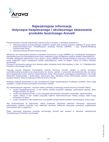 Najważniejsze informacje dotyczące bezpiecznego i skutecznego stosowania produktu leczniczego Arava® Produkt leczniczy Arava® (leflunomid) wskazany jest w leczeniu u dorosłych pacjentów z: aktywną postacią reumatoidalnego zapalenia stawów jako produkt leczniczy należący do grupy leków przeciwreumatycznych, modyfikujących przebieg choroby (DMARD – ang. Disease-Modifying Antirheumatic Drug), aktywną postacią artropatii łuszczycowej. Niedawne lub równoczesne leczenie produktami leczniczymi z grupy DMARD (np. metotreksat) działającymi hepatotoksycznie lub hematotoksycznie może zwiększać ryzyko wystąpienia ciężkich działań niepożądanych. Ponadto zastąpienie leflunomidu innym lekiem z grupy DMARD bez przeprowadzenia procedury wymywania może zwiększać ryzyko wystąpienia działań niepożądanych nawet po długim czasie od zmiany produktu leczniczego. Procedury wymywania opisane są w dalszej części niniejszej Karty Informacyjnej i w pkt. 4.4. Charakterystyki Produktu Leczniczego Arava®. Decyzją Komisji Wspólnot Europejskich produkt leczniczy Arava® uzyskał w wyniku procedury scentralizowanej pozwolenie na dopuszczenie do obrotu. Jednym z warunków wprowadzenia leku do obrotu jest przygotowanie przez podmiot odpowiedzialny Karty Informacyjnej zawierającej najważniejsze informacje dotyczące bezpiecznego i skutecznego stosowania leku. Niniejszą Kartę Informacyjną powinni otrzymać wszyscy lekarze, którzy przepisują produkt leczniczy Arava®. Niniejszy materiał opracowano w celu zmniejszenia ryzyka najważniejszych możliwych powikłań, które mogą wystąpić w czasie leczenia produktem leczniczym Arava®. Do najważniejszych zagrożeń, o których należy pamiętać, przepisując produkt leczniczy Arava® należą: ryzyko hepatotoksyczności, w tym bardzo rzadkie przypadki ciężkiego uszkodzenia wątroby, które mogą prowadzić do zgonu ryzyko hematotoksyczności, w tym przypadki pancytopenii, leukopenii, eozynofilii i agranulocytozy ryzyko infekcji, w tym rzadkie przypadki ciężkich niekontrolowanych infekcji (sepsa), które mogą prowadzić do zgonu ryzyko poważnych wad wrodzonych w przypadku przyjmowania produktu leczniczego w czasie ciąży PL.EDU.LEF.15.03.01 Aby zminimalizować te zagrożenia, należy przekazać pacjentom właściwe informacje, wykonywać odpowiednie badania kontrolne oraz właściwie stosować zalecenia dotyczące procedury wypłukiwania (wymywania) leku z organizmu. AB TETS Pełna informacja dotycząca produktu leczniczego Arava® jest zawarta w aktualnie zatwierdzonej Charakterystyce Produktu Leczniczego. 1/6 EDUKACJA PACJENTÓW Przed rozpoczęciem leczenia produktem leczniczym Arava® należy upewnić się, że pacjent został powiadomiony o ważnych zagrożeniach związanych z terapią produktem leczniczym Arava® oraz o środkach zapobiegawczych, które mogą zminimalizować ryzyko. W tym celu podmiot odpowiedzialny za wprowadzenie do obrotu opracował oprócz niniejszej broszury dotyczącej bezpieczeństwa Ulotkę specjalną dla pacjenta. RUTYNOWE MONITOROWANIE KRWI W związku z ryzykiem hepato- i hematoksyczności, które w rzadkich przypadkach mogą być ciężkie lub nawet prowadzić do zgonu (patrz poniższe tabele), bardzo istotne jest dokładne monitorowanie parametrów wątrobowych i liczby krwinek przed oraz w czasie leczenia produktem leczniczym Arava®. Więcej informacji na temat występowania powyższych działań niepożądanych znajduje się w Charakterystyce Produktu Leczniczego. Nie polecamy jednoczesnego stosowania produktu leczniczego Arava® i hepatotoksycznych lub hematotoksycznych leków z grupy DMARD (np. metotreksat). Monitorowanie enzymów wątrobowych CZĘSTOTLIWOŚĆ BADANIA LABORATORYJNE Należy kontrolować przynajmniej aktywność AlAT (SGPT) Przed rozpoczęciem leczenia i co 2 tygodnie w czasie pierwszych 6 miesięcy leczenia Następnie, jeśli stan będzie stabilny, należy badać co 8 tygodni Potwierdzona zwiększona aktywność AlAT Dostosowanie dawki/ Przerwanie leczenia Między 2- i 3-krotną górną granicą normy Zmniejszenie dawki z 20 mg/dziennie do 10 mg/dziennie może pozwolić na kontynuowanie podawania produktu leczniczego Arava® z zachowaniem cotygodniowego monitoringu 2- do 3-krotna górna granica normy utrzymuje się pomimo zmniejszenia dawki lub występuje >3-krotność górnej granicy normy Przerwać leczenie lekiem Arava® Rozpocząć procedurę wypłukiwania (patrz paragraf „Procedura wypłukiwania”) oraz monitorować poziom enzymów wątrobowych aż do uzyskania normalizacji Monitoring hematologiczny CZĘSTOTLIWOŚĆ BADANIA LABORATORYJNE Pełna morfologia krwi, w tym określenie poszczególnych frakcji leukocytów i płytek Przed rozpoczęciem leczenia i co 2 tygodnie w czasie pierwszych 6 miesięcy leczenia Następnie co 8 tygodni Przerwanie leczenia hematologiczne, w tym Przerwać leczenie produktem leczniczym Arava® oraz leczenie mielosupresyjne, jeśli jest ono podawane Rozpocząć procedurę wypłukiwania (patrz paragraf „Procedura wypłukiwania”) PL.EDU.LEF.15.03.01 Ciężkie reakcje pancytopenia 2/6 ZAKAŻENIA Właściwości immunosupresyjne produktu leczniczego Arava® mogą sprawiać, że pacjenci staną się bardziej podatni na infekcje, w tym infekcje oportunistyczne. Rzadko mogą u nich również występować ciężkie niekontrolowane infekcje (np. sepsa) oraz infekcje o ciężkim przebiegu, takie jak postępująca wieloogniskowa leukoencefalopatia (PML – ang. Progressive Multifocal Leukoencephalopathy). Przed rozpoczęciem leczenia leflunomidem należy wykonać odpowiednie badania w celu wykluczenia czynnego lub utajonego zakażenia prątkami gruźlicy (np. Interferon Gamma Release Test - IGRA). W przypadku stwierdzenia zakażenia prątkiem gruźlicy należy zastosować odpowiednie leczenie przeciwprątkowe. W przypadku wystąpienia ciężkich, niekontrolowanych infekcji, konieczne może być przerwanie leczenia leflunomidem i rozpocz