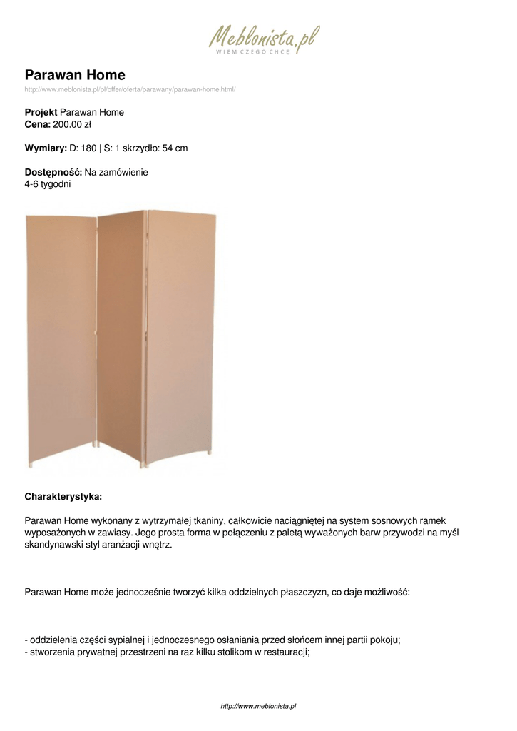 Parawan Home http://www.meblonista.pl/pl/offer/oferta/parawany/parawan-home.html/ Projekt Parawan Home Cena: 200.00 zł Wymiary: D: 180 | S: 1 skrzydło: 54 cm Dostępność: Na zamówienie 4-6 tygodni Charakterystyka: Parawan Home wykonany z wytrzymałej tkaniny, całkowicie naciągniętej na system sosnowych ramek wyposażonych w zawiasy. Jego prosta forma w połączeniu z paletą wyważonych barw przywodzi na myśl skandynawski styl aranżacji wnętrz. Parawan Home może jednocześnie tworzyć kilka oddzielnych płaszczyzn, co daje możliwość: - oddzielenia części sypialnej i jednoczesnego osłaniania przed słońcem innej partii pokoju; - stworzenia prywatnej przestrzeni na raz kilku stolikom w restauracji; http://www.meblonista.pl - tworzenia oddzielnych przestrzeni do nauki oraz zabawy w pokoju dziecięcym; - uzyskania garderoby z przedziałami dla dwóch osób; - spełnienia innych nietuzinkowych pomysłów na aranżację wnętrz. Rama parawanów wykonana jest z polskiego drewna sosnowego. *Przy zamówieniu parawanu powyżej 6 skrzydeł, parawan jest pakowany w osobne paczki (do samodzielnego montażu, koszt transportu będzie liczony zależnie od ilości skrzydeł po weryfikacji zamówienia). http://www.meblonista.pl Dostępne wersje produktu: nazwa produktu Parawan Home warianty 2 skrzydła cena 200.00zł dostępne 4-6 tygodni Parawan Home 3 skrzydła 300zł 4-6 tygodni Parawan Home 4 skrzydła 400zł 4-6 tygodni Parawan Home 5 skrzydeł 500zł 4-6 tygodni Parawan Home 6 skrzydeł 600zł 4-6 tygodni Parawan Home 7 skrzydeł 700zł 4-6 tygodni Parawan Home 8 skrzydeł 800zł 4-6 tygodni Parawan Home dowolna ilość skrzydeł0.00zł 4-6 tygodni http://www.meblonista.pl Zdjęcia produktu: http://www.meblonista.pl Powered by TCPDF (www.tcpdf.org)