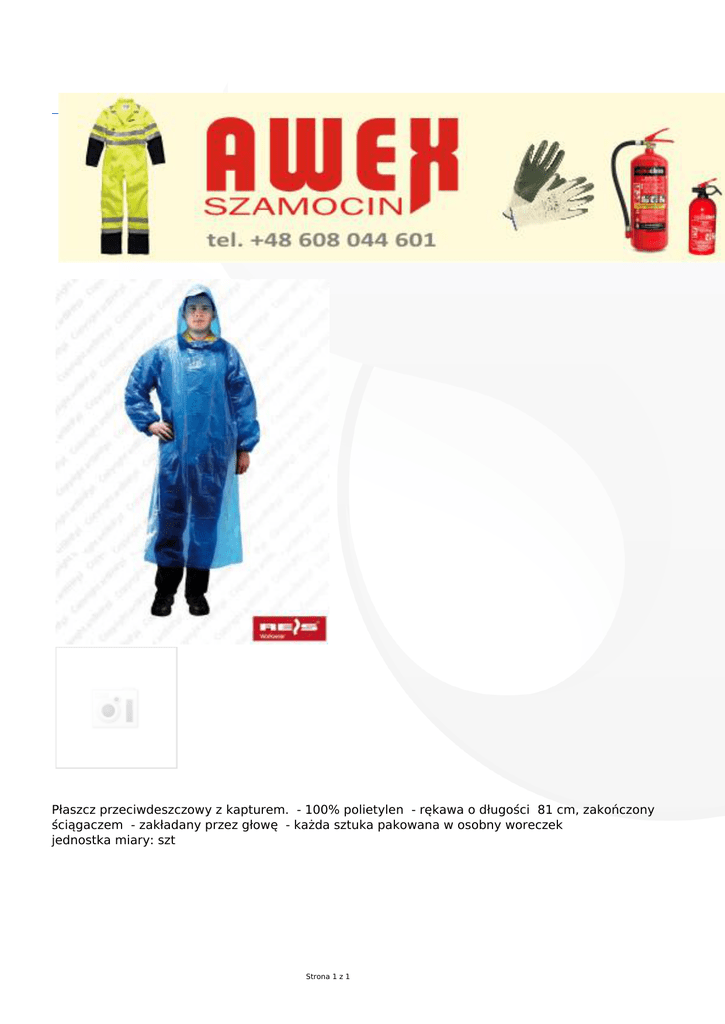 Płaszcz przeciwdeszczowy z kapturem. - 100% polietylen - rękawa o długości 81 cm, zakończony ściągaczem - zakładany przez głowę - każda sztuka pakowana w osobny woreczek jednostka miary: szt Strona 1 z 1