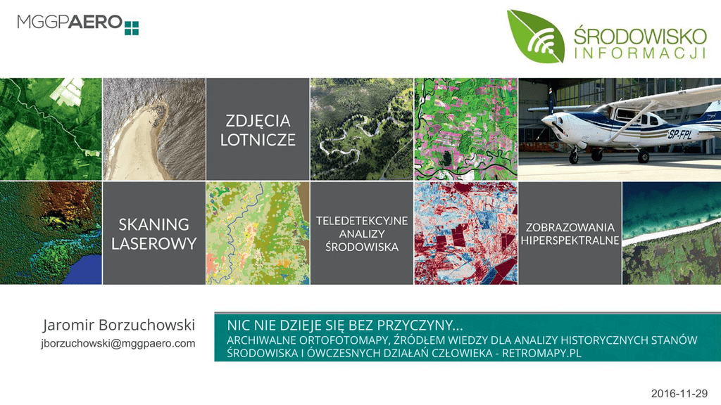 Jaromir Borzuchowski [email protected] NIC NIE DZIEJE SIĘ BEZ PRZYCZYNY... ARCHIWALNE ORTOFOTOMAPY, ŹRÓDŁEM WIEDZY DLA ANALIZY HISTORYCZNYCH STANÓW ŚRODOWISKA I ÓWCZESNYCH DZIAŁAŃ CZŁOWIEKA - RETROMAPY.PL 2016-11-29 Dane z przeszłości – ortofotomapy archiwalne W Polsce dane lotnicze wykonywane są od lat 50-tych (gromadzone w CODGiK) ➩ pokrycie całego kraju jest niejednolite (zarówno w sensie przestrzennym jak i czasowym), jednakże dla każdego obszaru ortofotomapy archiwalne są dostępne Archiwalne zdjęcia lotnicze i ortofotomapy z zasobu zostały wykonane różnymi technikami (metoda pozyskania, zakres spektralny, motoda zapisu) ➩ niemniej jednak odwzorowują one wizualnie stan środowiska na chwilę ich wykonania 2 Dane z przeszłości – ortofotomapy archiwalne 3 Dane lotnicze – czyli czym dysponujemy dziś Obecny poziom technologiczny w zakresie danych lotniczych Zakres spektralny RGB + NIR I. Zobrazowania lotnicze w paśmie widzialnym i bliskiej podczerwieni II. Zobrazowania hiperspektralne 4 Dane lotnicze – czyli czy m dysponujemy dzisiaj Obecny poziom technologiczny w zakresie danych lotniczych Zakres spektralny Rozdzielczość obrazu Poziom informacyjny rośnie wraz ze zmniejszaniem się powierzchni odwzorowanej na pojedynczym pikselu 5 Dane lotnicze – czyli czy m dysponujemy dzisiaj Obecny poziom technologiczny w zakresie danych lotniczych Zakres spektralny Rozdzielczość obrazu Dane 3D ze skaningu laserowego 6 Nic nie dzieje się bez przyczyny Dzisiaj pozyskane dane ➩ to chwilowy obraz środowiska Obecny stan środowiska ➩ to wynik działań/procesów historycznych Obecny stan Stany historyczne 1950 1980 2000 dziś 7 Analiza stanu zasobów przyrodniczych przykład projektu Słowiński Park Narodowy – diagnoza stanu zasobów przyrodniczych 8 Analiza stanu zasobów przyrodniczych Słowiński Park Narodowy – diagnoza stanu zasobów przyrodniczych 1.1. Działalność człowieka 1.2. Zbiorowiska roślinne 1.3. Parametry roślinności 1.4. Ocena stanu szaty roślinnej terenów otwartych, w tym głównych walorów przyrodniczych 1.5. Warunki wodne obszarów lądowych 1.6. Analiza ukształtowania geometrii koryt rzek, rowów i kanałów, charakterystyka sieci odwadniającej obszaru … 1.7. Analiza tendencji zmian torfowisk uwzględniająca zasięgi … 1.8. Analiza zmian wysokości, objętości i zasięgu przemieszczania się wydm … 2.1. Charakterystyka roślinnych zbiorowisk wodnych … 2.2. Badania jakościowe wód śródlądowych … 9 Analiza stanu zasobów przyrodniczych Słowiński Park Narodowy – zobrazowania wykonane w projekcie Dane wysokościowe Bliska podczerwień Ortofotomapa RGB Zobrazowania hiperspektralne 10 Dane z przeszłości Słowiński Park Narodowy – dane archiwalne Zakres spektralny Metoda rejestracji Rozdzielczość Źródło Ortofotomapa 2015 czerwiec R,G,B,NIR cyfrowa 15 cm MGGP Aero Ortofotomapa 2014 październik R,G,B,NIR cyfrowa 15 cm MGGP Aero Ortofotomapa 2014 lipiec R,G,B,NIR cyfrowa 10 cm MGGP Aero Ortofotomapa 2013 czerwiec-sierpień R,G,B,NIR cyfrowa 50 cm CODGiK Ortofotomapa 2011 listopad R,G,B,NIR cyfrowa 15 cm MGGP Aero Ortofotomapa 2010 lipiec R,G,B,NIR cyfrowa 50 cm CODGiK Ortofotomapa 2004 lipiec PAN analogowa 50 cm CODGiK Ortofotomapa 1995-1997 R,G,B analogowa 50 cm CODGiK Fotoszkic 1994 lipiec R,G,B analogowa 50 cm SPN Fotoszkic 1937 PAN analogowa ~1 m Hansa Luftbild GmbH Mapa topograficzna 1914 (1891) - - ~2 m SPN 11 Analizy ruchu wydm Wydmy ruchome – Słowiński Park Narodowy – ALS od listopada 2009 do czerwca 2015 (autor: Radosław Wróblewski) 12 Ekspansja roślinności Ekspansja Trzciny pospolitej – Słowiński Park Narodowy 1996 2004 2011 2015 Co dalej? 13 Ekspansja roślinności Ekspansja Trzciny pospolitej – Słowiński Park Narodowy 1996 2004 2011 2015 Co dalej? 14 Ekspansja roślinności Ekspansja Trzciny pospolitej – Słowiński Park Narodowy 1996 2004 2011 2015 Co dalej? 15 Ekspansja roślinności Ekspansja Trzciny pospolitej – Słowiński Park Narodowy 1996 2004 2011 2015 Co dalej? 16 Sukcesja roślinności Sukcesja drzew i zakrzaczeń 1966 1979 1996 2010 2015 Co dalej? 17 Sukcesja roślinności Sukcesja drzew i zakrzaczeń 1966 1979 1996 2010 2015 Co dalej? 18 Sukcesja roślinności Sukcesja drzew i zakrzaczeń 1966 1979 1996 2010 2015 Co dalej? 19 Sukcesja roślinności Sukcesja drzew i zakrzaczeń 1966 1979 1996 2010 2015 Co dalej? 20 Sukcesja roślinności Sukcesja drzew i zakrzaczeń 1966 1979 1996 2010 2015 Co dalej? 21 Zarastanie jezior Zarastanie jezioro Gardno – Słowiński Park Narodowy 22 Zarastanie jezior Zarastanie jezioro Zatoka Północna – Słowiński Park Narodowy 23 Zmiany zasięgu pła jeziornego Pło jeziora Dołgie Małe – Słowiński Park Narodowy 24 Zmiana krajobrazu rozwój zabudowy Zmiana sposobu zagospodarowania – Słowiński Park Narodowy 25 Zmiana krajobrazu rozwój zabudowy Zmiana sposobu zagospodarowania – Słowiński Park Narodowy 26 Zmiana krajobrazu rozwój zabudowy Zmiana sposobu zagospodarowania – Słowiński Park Narodowy 27 Zmiana krajobrazu rozwój zabudowy Zmiana sposobu zagospodarowania – Słowiński Park Narodowy 28 Dane z przeszłości – jak daleko możemy sięgnąć? Rozwój kanału portowego rzeki Łeba 2015 29 Dane z przeszłości – jak daleko możemy sięgnąć? Rozwój kanału portowego rzeki Łeba 2015 1996 2015 30 Dane z przeszłości – jak daleko możemy sięgnąć? Rozwój kanału portowego rzeki Łeba 1937 1996 2015 Źródło: Hansa Luft Bild GmbH 31 Dane z przeszłości – jak daleko możemy sięgnąć? Rozwój kanału portowego rzeki Łeba XIX/XX w. 1937 1996 2015 Źródło: SPN 32 Analiza w ciągu czasowym – podsumowanie zastosowania w Parku Narodowym Projekt SPN – 1937 - 2015 Analiza dynamiki procesu na powtarzalnych danych obrazowych Do czego służą wyniki wykonanych analiz historycznych? do analizy skuteczności ochrony i ich weryfikacji do analizy presji i identyfikacji zagrożeń do plano