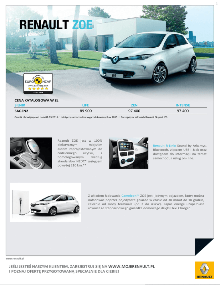 Cennik obowiązuje od dnia 01.03.2015 r. i dotyczy samochodów wyprodukowanych w 2015 r. Szczegóły w salonach Renault Ekspert ZE.