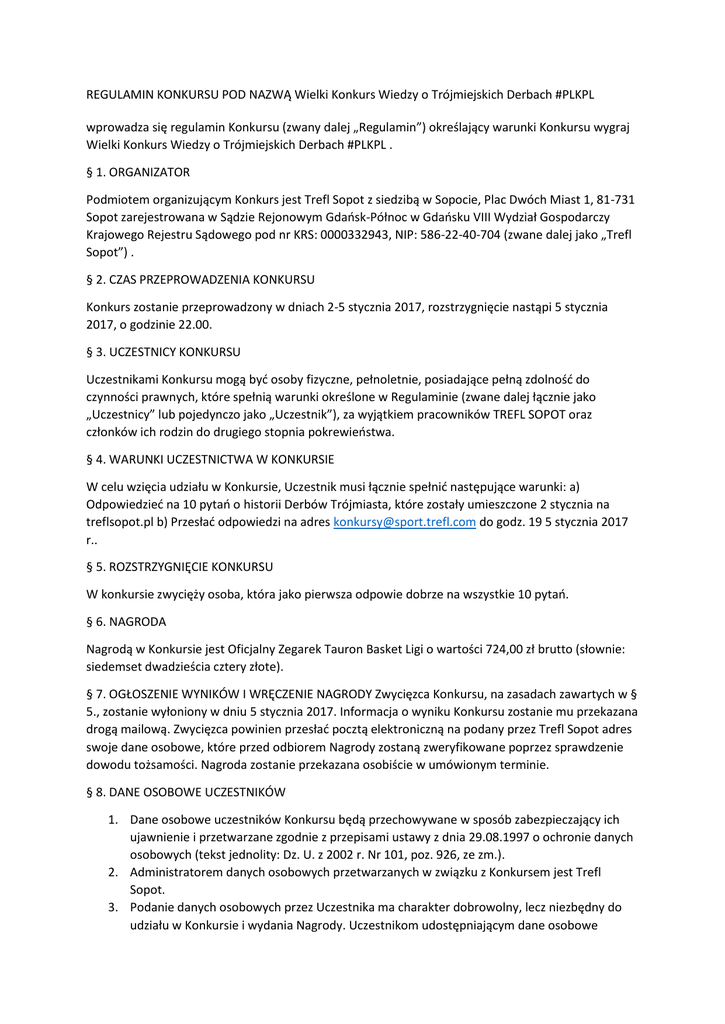 REGULAMIN KONKURSU POD NAZWĄ Wielki Konkurs Wiedzy o Trójmiejskich Derbach #PLKPL wprowadza się regulamin Konkursu (zwany dalej „Regulamin”) określający warunki Konkursu wygraj Wielki Konkurs Wiedzy o Trójmiejskich Derbach #PLKPL . § 1. ORGANIZATOR Podmiotem organizującym Konkurs jest Trefl Sopot z siedzibą w Sopocie, Plac Dwóch Miast 1, 81-731 Sopot zarejestrowana w Sądzie Rejonowym Gdańsk-Północ w Gdańsku VIII Wydział Gospodarczy Krajowego Rejestru Sądowego pod nr KRS: 0000332943, NIP: 586-22-40-704 (zwane dalej jako „Trefl Sopot”) . § 2. CZAS PRZEPROWADZENIA KONKURSU Konkurs zostanie przeprowadzony w dniach 2-5 stycznia 2017, rozstrzygnięcie nastąpi 5 stycznia 2017, o godzinie 22.00. § 3. UCZESTNICY KONKURSU Uczestnikami Konkursu mogą być osoby fizyczne, pełnoletnie, posiadające pełną zdolność do czynności prawnych, które spełnią warunki określone w Regulaminie (zwane dalej łącznie jako „Uczestnicy” lub pojedynczo jako „Uczestnik”), za wyjątkiem pracowników TREFL SOPOT oraz członków ich rodzin do drugiego stopnia pokrewieństwa. § 4. WARUNKI UCZESTNICTWA W KONKURSIE W celu wzięcia udziału w Konkursie, Uczestnik musi łącznie spełnić następujące warunki: a) Odpowiedzieć na 10 pytań o historii Derbów Trójmiasta, które zostały umieszczone 2 stycznia na treflsopot.pl b) Przesłać odpowiedzi na adres [email protected] do godz. 19 5 stycznia 2017 r.. § 5. ROZSTRZYGNIĘCIE KONKURSU W konkursie zwycięży osoba, która jako pierwsza odpowie dobrze na wszystkie 10 pytań. § 6. NAGRODA Nagrodą w Konkursie jest Oficjalny Zegarek Tauron Basket Ligi o wartości 724,00 zł brutto (słownie: siedemset dwadzieścia cztery złote). § 7. OGŁOSZENIE WYNIKÓW I WRĘCZENIE NAGRODY Zwycięzca Konkursu, na zasadach zawartych w § 5., zostanie wyłoniony w dniu 5 stycznia 2017. Informacja o wyniku Konkursu zostanie mu przekazana drogą mailową. Zwycięzca powinien przesłać pocztą elektroniczną na podany przez Trefl Sopot adres swoje dane osobowe, które przed odbiorem Nagrody zostaną zweryfikowane poprzez sprawdzenie dowodu tożsamości. Nagroda zostanie przekazana osobiście w umówionym terminie. § 8. DANE OSOBOWE UCZESTNIKÓW 1. Dane osobowe uczestników Konkursu będą przechowywane w sposób zabezpieczający ich ujawnienie i przetwarzane zgodnie z przepisami ustawy z dnia 29.08.1997 o ochronie danych osobowych (tekst jednolity: Dz. U. z 2002 r. Nr 101, poz. 926, ze zm.). 2. Administratorem danych osobowych przetwarzanych w związku z Konkursem jest Trefl Sopot. 3. Podanie danych osobowych przez Uczestnika ma charakter dobrowolny, lecz niezbędny do udziału w Konkursie i wydania Nagrody. Uczestnikom udostępniającym dane osobowe przysługuje prawo do: dostępu do tych danych, ich poprawiania, żądania zaprzestania ich przetwarzania lub zgłoszenia sprzeciwu wobec ich przetwarzania. § 9. POSTANOWIENIA KOŃCOWE 1. Trefl Sopot zastrzega sobie prawo weryfikacji, czy Uczestnicy spełniają warunki określone w Regulaminie. W tym celu Trefl Sopot może zwrócić się do Uczestnika o złożenie określonych oświadczeń, podanie określonych danych bądź przedłożenie określonych dokumentów. 2. Uczestnicy będą mogli zapoznać się z treścią niniejszego Regulaminu na stronie internetowej z informacją o konkursie. 3. W kwestiach nieuregulowanych niniejszym Regulaminem stosuje się przepisy Kodeksu cywilnego i innych powszechnie obowiązujących przepisów prawa.