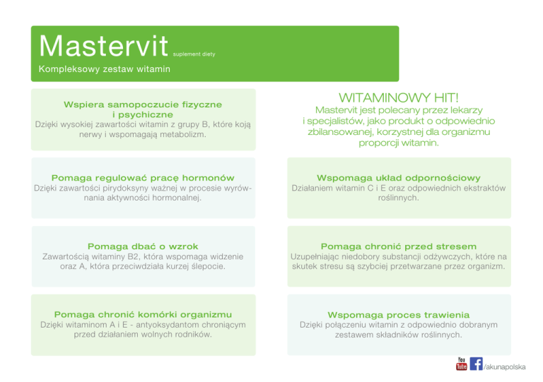 Mastervit suplement diety Kompleksowy zestaw witamin Wspiera samopoczucie fizyczne i psychiczne Dzięki wysokiej zawartości witamin z grupy B, które koją nerwy i wspomagają metabolizm. WITAMINOWY HIT! Mastervit jest polecany przez lekarzy i specjalistów, jako produkt o odpowiednio zbilansowanej, korzystnej dla organizmu proporcji witamin. Pomaga regulować pracę hormonów Dzięki zawartości pirydoksyny ważnej w procesie wyrównania aktywności hormonalnej. Wspomaga układ odpornościowy Działaniem witamin C i E oraz odpowiednich ekstraktów roślinnych. Pomaga dbać o wzrok Zawartością witaminy B2, która wspomaga widzenie oraz A, która przeciwdziała kurzej ślepocie. Pomaga chronić przed stresem Uzupełniając niedobory substancji odżywczych, które na skutek stresu są szybciej przetwarzane przez organizm. Pomaga chronić komórki organizmu Dzięki witaminom A i E - antyoksydantom chroniącym przed działaniem wolnych rodników. Wspomaga proces trawienia Dzięki połączeniu witamin z odpowiednio dobranym zestawem składników roślinnych. /akunapolska Zdaniem eksperta... Zioła zawarte w Mastervit są bogate w flawonoidy, które wydatnie podnoszą wartość witamin i posiadają działanie antyoksydacyjne i antybakteryjne. Dzięki temu, preparat doskonale chroni przed bakteriami i korzystnie wpływa na naszą odporność. lek. med. Michał Mularczyk Co o nim sądzicie? Zanim zaczęłam stosować Mastervit, cierpiałam na lekkie stany depresyjne. Regularne przyjmowanie witamin uodporniło mój organizm na zmienne nastroje. Halina Dudek, Myślenice Brytyjskie badania wykazały, że witamina B12 aż o 6 razy może zmniejszyć ryzyko pojawienia się problemów z pamięcią u ludzi starszych. Zespół badaczy szwedzkich wykazał natomiast, że witamina ta zmniejsza także ryzyko zachorowania na chorobę Alzheimera. Ich badania oparte były na zawartości we krwi homocysteiny, związanej z zachorowalnością na tę chorobę. poj. 480 ml DLACZEGO MASTERVIT? Zioła i składniki roślinne: ekstrakt z wiśni, jeżówka purpurowa, melasa, ostropest plamisty, traganek błoniasty, wyciąg z czarnej marchwi. Witaminy: witamina A (retinol), witamina B1 (tiamina), witamina B2 (ryboflawina), witamina B3 (niacyna), witamina B5 (kwas pantotenowy), witamina B6 (pirydoksyna), witamina B9 (kwas foliowy), witamina B12 (kobalamina), witamina C (kwas askorbinowy), witamina E (tokoferol), witamina H (biotyna).* *opis właściwości na końcu opracowania. Infolinia Akuna Dowiedz się więcej: Wszelkie pytania dotyczące korzystania z gamy produktów Alveo Family można kierować na infolinię Akuna. Dowiedz się więcej! + 48 606 476 076. Infolinia jest czynna: Poniedziałek 10:00 – 11:30 Czwartek 11:00 – 12:30 Fachowych porad udziela lek. med. Alicja Olma, posiadająca wieloletnią praktykę lekarską oraz doświadczenie w pracy z produktami firmy Akuna. Uwaga: maksymalny czas trwania rozmowy to 10 minut. Zobacz również katalog produktowy Akuna Start Poznasz dzięki niemu zalety naszych pozostałych produktów, stanowiących najlepsze wsparcie zdrowotnej profilaktyki. Akuna Polska Sp. z o.o., ul. 11 Listopada 11, 40-387 Katowice, tel./fax: +48 32 608 55 32, e-mail: [email protected], www.akuna.net. ver. 1.01.14