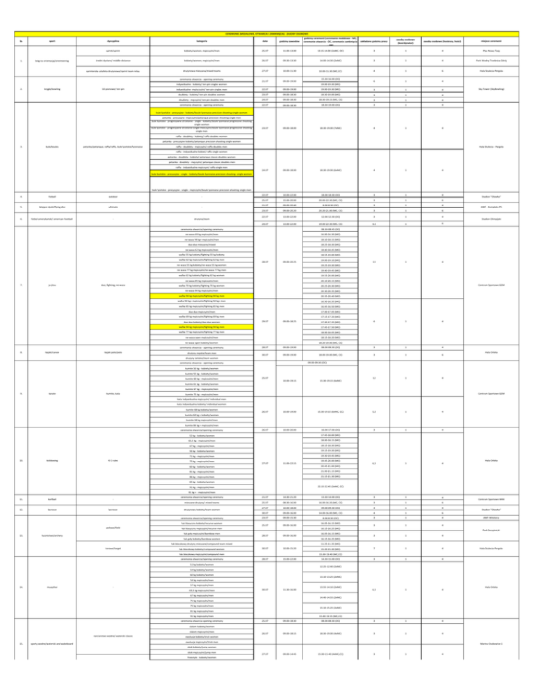 CEREMONIE (MEDALOWE, OTWARCIA I ZAMKNIĘCIA) - ZASOBY OSOBOWE lp. 1. sport bieg na orientację/orienteering dyscyplina kategoria data godziny zawodów godziny ceremonii (ceremonie medalowe - MC, ceremonie otwarcia - OC, ceremonie zamknięcia - CC) zakładane godziny pracy zasoby osobowe (koordynator) zasoby osobowe (hostessy, hości) miejsce ceremonii sprint/sprint kobiety/women, mężczyźni/men 25.07 11.00-13.00 13.15-14.00 (2xMC, OC) 3 1 4 Plac Nowy Targ średni dystans/ middle-distance kobiety/women, mężczyźni/men 26.07 09.30-13.30 14.00-14.30 (2xMC) 3 1 4 Park Wodny Trzebnica-Zdrój sprinterska sztafeta drużynowa/sprint team relay drużynowa mieszana/mixed teams 27.07 10.00-11.30 10.00-11.30 (MC,CC) 4 1 6 Hala Stulecia-Pergola 21.07 09.00-19.00 ceremonia otwarcia - opening ceremony 2. kręgle/bowling 10-pionowe/ ten-pin 15.30-16.00 (OC) 6 1 4 indywidualne -mężyczyźni/ ten-pin singles men 22.07 09.00-19.00 19.00-19.30 (MC) 3 1 4 doublety - kobiety/ ten-pin doubles women 23.07 09.00-18.30 18.30-19.00 (MC) 3 1 4 doublety - męczyźni/ ten-pin doubles men 24.07 09.00-18.30 18.30-19.15 (MC, CC) 3 1 4 ceremonia otwarcia - opening ceremony 22.07 09.00-18.30 18.30-19.00 (OC) 3 1 4 23.07 09.00-18.00 18.30-19.00 (7xMC) 4 1 4 19.00-19.30 (MC) indywidualne - kobiety/ ten-pin singles women Sky Tower (SkyBowling) bule lyońskie - precyzyjne - kobiety/boule lyonnaise precision shooting single women petanka - precyzyjne -mężczyźni/petanque precision shooting single men bule lyońskie - progresywne strzelanie - single - kobiety/boule lyonnaise progressive shooting single women bule lyońskie - progresywne strzelanie-single-meżczyźni/boule lyonnaise progressive shooting single men raffa - doublety - kobiety/ raffa doubles women petanka - precyzyjne kobiety/petanque precision shooting single women 3. bule/boules petanka/petanque, raffa/raffa, bule lyońskie/lyonnaise raffa - doublety - mężczyźni/ raffa doubles men Hala Stulecia - Pergola raffa - indywidualne kobiet/ raffa single women petanka - doublety - kobiety/ petanque classic doubles women petanka - doublety - męczyźni/ petanque classic doubles men raffa - indywidualne mężczyzn/ raffa single men 24.07 09.00-18.00 18.30-19.00 (6xMC) 4 1 4 22.07 25.07 10.00-22.00 18.00-18.30 (OC) 3 1 4 15.00-20.00 20.00-22.30 (MC, CC) 3 1 6 21.07 09.00-20.40 8.00-8.30 (OC) 3 1 4 23.07 09.00-20.20 20.20-21.00 (MC, CC) 3 1 6 22.07 13.00-22.00 12.00-12.30 (OC) 3 1 4 24.07 13.00-22.00 19.00-22.30 (MC, CC) 4,5 1 6 13 1 4 bule lyońskie - precyzyjne - single - kobiety/boule lyonnaise precision shooting- single women bule lyońskie - precyzyjne - single - mężczyźni/boule lyonnaise precision shooting single men 4. 5. 6. fistball latające dyski/flying disc futbol amerykański/ american football outdoor ultimate - - - drużyna/team ceremonia otwarcia/opening ceremony 08.30-08.45 (OC) ne-waza 69 kg mężczyźni/men 16.00-16.30 (MC) ne-waza 94 kg+ mężczyźni/men 18.10-18.15 (MC) duo duo mieszane/mixed 18.25-18.30 (MC) ne-waza 62 kg mężczyźni/men 18.40-18.45 (MC) walka 55 kg kobiety/fighting 55 kg kobiety walka 62 kg mężczyźni/fighting 62 kg men 7. ju-jitsu duo, fighting, ne-waza 09.00-20.25 19.25-19.30 (MC) 19.40-19.45 (MC) walka 62 kg kobiety/fighting 62 kg women 19.55-20.00 (MC) ne-waza 85 kg mężczyźni/men 20.10-20.15 (MC) walka 70 kg kobiety/fighting 70 kg women 20.25-20.30 (MC) ne-waza 94 kg mężczyźni/men 20.30-20.35 (MC) walka 94 kg mężczyźni/fighting 94 kg men 20.35-20.40 (MC) walka 94 kg+ mężczyźni/fighting 94 kg+ men 16.30-16.35 (MC) walka 85 kg mężczyźni/fighting 85 kg men 16.45-16.50 (MC) duo duo mężczyźni/men 17.00-17.05 (MC) kajaki polo/polo 09.00-18.25 17.30-17.35 (MC) 17.45-17.50 (MC) walka 77 kg mężczyźni/fighting 77 kg men 18.00-18.05 (MC) ne-waza open mężczyźni/men 18.15-18.20 (MC) ne-waza open kobiety/women 18.20-19.00 (MC, CC) drużyny męskie/team men Stadion Olimpijski Centrum Sportowe GEM 17.15-17.20 (MC) 29.07 walka 94 kg mężczyźni/fighting 94 kg men ceremonia otwarcia - opening ceremony kajaki/canoe 19.00-19.10 (MC) ne-waza 77 kg mężczyźni/ne-waza 77 kg men walka 69 kg mężczyźni/fighting 69 kg men 8. AWF - Kompleks P5 18.55-19.00 (MC) 28.07 ne-waza 55 kg kobiety/ne-waza 55 kg women duo duo kobiety/duo duo women Stadion "Oławka" 6 1 4 28.07 09.00-19.00 08.00-08.30 (OC) 3 1 4 30.07 09.00-19.00 18.00-19.00 (MC, CC) 3 1 6 12 1 4 Hala Orbita drużyny żeńskie/team women 09.00-09.30 (OC) ceremonia otwarcia - opening ceremony kumite 50 kg - kobiety/women kumite 55 kg - kobiety/women kumite 60 kg - mężczyźni/men 25.07 10.00-19.15 15.30-19.15 (6xMC) kumite 61 kg - kobiety/women kumite 67 kg - mężczyźni/men 9. karate kumite, kata Centrum Sportowe GEM kumite 75 kg - mężczyźni/men kata indywidualna mężczyźni/ individual men kata indywidualna kobiety/ individual women kumite 68 kg kobiety/women 26.07 10.00-19.00 26.07 10.00-20.00 15.30-19.15 (6xMC, CC) 5,5 1 4 16.00-17.00 (OC) 3 1 4 6,5 1 4 kumite 68 kg + kobiety/women kumite 84 kg mężczyźni/men kumite 84 kg + mężczyźni/men ceremonia otwarcia/opening ceremony 52 kg - kobiety/women 17.45-18.00 (MC) 63,5 kg - mężczyźni/men 18.00-18.15 (MC) 67 kg - mężczyźni/men 18.15-18.30 (MC) 56 kg - kobiety/women 19.15-19.30 (MC) 19.30-19.45 (MC) 71 kg - mężczyźni/men 10. kickboxing K-1 rules 75 kg - mężczyźni/men 27.07 11.00-22.15 19.45-20.00 (MC) 60 kg - kobiety/women 20.45-21.00 (MC) 81 kg - mężczyźni/men 21.00-21.15 (MC) 86 kg - mężczyźni/men 21.15-21.30 (MC) Hala Orbita 65 kg - kobiety/women 22.15-22.45 (3xMC, CC) 91 kg - mężczyźni/men 91 kg + - mężczyźni/men 11. 12. korfball lacrosse - lacrosse ceremonia otwarcia/opening ceremony 21.07 14.30-21.20 13.30-14.00 (OC) 3 1 4 mieszane drużyny/ mixed teams 25.07 08.30-16.00 16.00-16.20 (MC, CC) 3 1 6 27.07 10.00-18.00 09.00-09.30 (OC) 3 1 4 30.07 09.00-16.00 14.00-16.00 (MC, CC) 4 1 6 23.07 09.00-15.30 8.00-8.30 (OC) 3 1 4 25.07 09.00-16.00 3 1 4 28.07 09.00-16.00 3 1 4 7 1 4