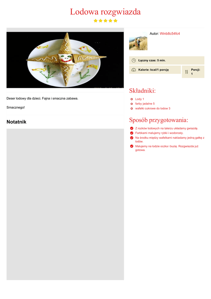 Lodowa rozgwiazda Autor: Winb8c54fc4 Łączny czas: 5 min. Kalorie: kcal/1 porcję Porcji: 1 Składniki: Deser lodowy dla dzieci. Fajna i smaczna zabawa. Lody 1 farby jadalne 5 Smacznego! Notatnik wafelki cukrowe do lodow 3 Sposób przygotowania: Z rozków lodowych na talerzu układamy gwiazdę. Farbkami malujemy rybki i wodorosty. Na środku między wafelkami nakladamy jedną gałkę z lodów. Malujemy na lodzie oczka i buzię. Rozgwiazda już gotowa.