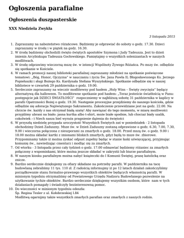 Ogłoszenia parafialne Ogłoszenia duszpasterskie XXX Niedziela Zwykła 3 listopada 2015 1. Zapraszamy na nabożeństwo różańcowe. Będziemy je odprawiać do soboty o godz. 17.30. Dzieci zapraszamy w środę i w piątek na godz. 16.30. 2. W środę będziemy obchodzili święto świętych apostołów Szymona i Judy Tadeusza. Jest to dzień imienin Arcybiskupa Tadeusza Gocłowskiego. Pamiętajmy o wszystkich solenizantach w naszych modlitwach. 3. W środę odprawimy wieczorną mszę św. w intencji Wspólnoty Żywego Różańca. Po mszy św. odbędzie się spotkanie w Kościele. 4. W ramach promocji naszej biblioteki parafialnej zapraszamy młodzież na spotkanie poświęcone tematowi: „Bóg, Honor, Ojczyzna” w nauczaniu i życiu Św. Jana Pawła II; Błogosławionego Ks. Jerzego Popiełuszki i sługi Bożego Ks. Kardynała Stefana Wyszyńskiego. Spotkanie odbędzie się w naszej bibliotece w czwartek 29 października o godz. 19.00. 5. Serdecznie zapraszamy na wieczór modlitewny pod hasłem „Holy Wins – Święty zwycięża” będący alternatywą dla halloween. To modlitewne spotkanie pod hasłem: „Teraz jesteście światłością w Panu: postępujcie jak DZIECI ŚWIATŁOŚCI” rozpoczniemy w najbliższą sobotę 31 października w kaplicy w parafii Opatrzności Bożej o godz. 19.30. Następnie procesyjne przejdziemy do naszego kościoła, gdzie odbędzie się adoracja Najświętszego Sakramentu. Zakończenie przewidziane jest na godz. 22.00. Na chrzcie św. każdy z nas otrzymał białą szatę! Aby nawiązać do tego momentu, w miarę możliwości przyjdźmy ubrani na biało: jasna kurtka albo t-shirt, może białe spodnie, lub chociaż biały szalik, cokolwiek :-) Niech nasza biel wyraża pragnienie dążenia do świętości 6. W przyszłą niedzielę przypada uroczystość Wszystkich Świętych zaś w poniedziałek - 2 listopada obchodzimy Dzień Zaduszny. Msze św. w Dzień Zaduszny zostaną odprawione o godz. 6.30, 7.00, 7.30, 9.00 i wieczorna połączona z nieszporami za zmarłych o godz. 18.00. Przed mszą św. o godz. 9.00 i 18.00 można składać kartki z imionami bliskich zmarłych, gdyż będą to msze św. zbiorowe. Przypominamy także iż można zyskać odpust zupełny będąc w stanie łaski uświęcającej, przyjmując komunię św., nawiedzając cmentarz i modląc się za zmarłych. 7. Od wtorku - 3 listopada przez cały tydzień o godz. 17.00 odmawiać będziemy różaniec za zmarłych połączony z wspominkami, które można jeszcze składać w zakrystii lub biurze parafialnym. 8. W naszym kiosku parafialnym można nabyć książeczki do I Komunii Świętej, prasę katolicką oraz znicze. 9. Bardzo serdecznie dziękujemy za ofiary składane na potrzeby parafii. W październiku na tacę budowlaną zebraliśmy 11 tys. 110 zł. Z radością informujmy iż po 12 latach działań zakończyliśmy porządkowanie stanu formalno-prawnego wszystkich obiektów będących własnością parafii. W minionym tygodniu otrzymaliśmy od Powiatowego Urzędu Nadzoru Budowlanego pozwolenie na użytkowanie tychże obiektów. Bardzo serdecznie dziękujemy wszystkim osobom, które nam w tych działaniach pomagały i świadczyły bezinteresowną pomoc. 10. Do wieczności w minionym tygodniu odeszła: Śp. Regina Tesler z ul. Kołobrzeskiej l.84 Modlitwą ogarnijmy także wszystkich zmarłych parafian oraz zmarłych z naszych rodzin.