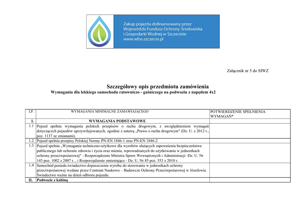 Załącznik nr 5 do SIWZ Szczegółowy opis przedmiotu zamówienia Wymagania dla lekkiego samochodu ratowniczo - gaśniczego na podwoziu z napędem 4x2 LP. WYMAGANIA MINIMALNE ZAMAWIAJĄCEGO I. WYMAGANIA PODSTAWOWE 1.1 Pojazd spełnia wymagania polskich przepisów o ruchu drogowym, z uwzględnieniem wymagań dotyczących pojazdów uprzywilejowanych, zgodnie z ustawą „Prawo o ruchu drogowym" (Dz. U. z 2012 r., poz. 1137 ze zmianami). 1.2 Pojazd spełnia przepisy Polskiej Normy PN-EN 1846-1 oraz PN-EN 1846-2 1.3 Pojazd spełnia „Wymagania techniczno-użytkowe dla wyrobów służących zapewnieniu bezpieczeństwa publicznego lub ochronie zdrowia i życia oraz mienia, wprowadzanych do użytkowania w jednostkach ochrony przeciwpożarowej" - Rozporządzenie Ministra Spraw Wewnętrznych i Administracji -Dz. U. Nr 143 poz. 1002 z 2007 r. , i Rozporządzenie zmieniające - Dz. U. Nr 85 poz. 553 z 2010 r. 1.4 Samochód posiada świadectwo dopuszczenia wyrobu do stosowania w jednostkach ochrony przeciwpożarowej wydane przez Centrum Naukowo – Badawcze Ochrony Przeciwpożarowej w Józefowie. Świadectwo ważne na dzień odbioru pojazdu. II. Podwozie z kabiną POTWIERDZENIE SPEŁNIENIA WYMAGAŃ* 2.1 Samochód - fabrycznie nowy, rok produkcji 2015. Podać producenta i model pojazdu. 2.2 Dopuszczalna masa całkowita pojazdu nie może przekraczać 3500 kg. Wymiary zewnętrzne pojazdu kompletnego: - maksymalna długość pojazdu wraz z wyciągarką 6600 mm - maksymalna wysokość 2600 mm Minimalna ładowność po wykonaniu zabudowy min 750 kg 2.3 Pojazd wyposażony w urządzenie sygnalizacyjno -ostrzegawcze akustyczne i świetlne - belka świetlna z napisem „ STRAŻ " montowana na dachu kabiny-dodatkowa lampa sygnalizacyjna niebieska błyskowa z tyłu pojazdu, lampy wykonane w technologii LED 2.4 Dodatkowe 2 lampy stroboskopowe sygnalizacyjne niebieskie z przodu pojazdu. 2.5 Podwozie pojazdu z silnikiem o zapłonie samoczynnym z turbo-doładowaniem. Silnik o mocy maksymalnej, minimum 122 KM i maksymalnym momencie obrotowym, minimum 320 Nm, spełniający normę emisji spalin EURO 5, pojemność skokowa minimum 2198 cm3 2.6 Napęd 4x2 na oś tylną z fabryczną blokadą mechanizmu różnicowego, wyposażoną w koła bliźniacze. 2.7 Układ hamulcowy wyposażony w ABS, układ elektroniczny stabilizujący tor jazdy ESP Skrzynia biegów 6 biegowa + wsteczny, hamulce tarczowe na obu osiach 2.8 Samochód przystosowany do przewozu min.6 osób, wyposażony w 4 drzwi: - drzwi przedziału załogi umieszczone po obu stronach pojazdu - układ foteli w kabinie 1+1+4 - podłoga przedziału załogi i ładunkowego wyłożona wykładziną przeciwpoślizgową, trwałą, łatwo zmywalną -oświetlenie przedziału pasażerskiego włączane z kabiny kierowcy i niezależnie z przedziału pasażerskiego - dodatkowe gniazdo zapaliczki w kabinie kierowcy - wskaźnik temperatury zewnętrznej - boczne lusterka regulowane elektrycznie i podgrzewane, składane ręcznie - światła przeciwmgielne - radio samochodowe z czytnikiem CD i pilotem sterującym umieszczonym w zasięgu kierowcy - poduszka powietrzna dla kierowcy - elektrycznie regulowane szyby przednie w kabinie kierowcy - szyby w tylnych drzwiach przesuwne - wszystkie szyby o wysokiej zdolności filtrowania - układ kierowniczy ze wspomaganiem - miejsce dowódcy wyposażone w półkę ułatwiającą czytanie mapy i lampkę oświetlającą - kabina wyposażona w ogrzewanie i w klimatyzację manualną - wszystkie drzwi kabiny wyposażone w centralny zamek sterowany z przycisku w kluczyku. 2.9 W kabinie zainstalowany radiotelefon o parametrach: częstotliwość VHF 136-174 MHz, moc 1÷25 W, 2.10 2.11 2.12 2.13 odstęp międzykanałowy 12,5 kHz dostosowany do użytkowania w sieci MSW,min 125 kanałów, wyświetlacz alfanumeryczny min 14 znaków. Obrotowy potencjometr siły głosu. Radiotelefon przystosowany do użytkowania z sygnałem analogowym i cyfrowym. Elektryczne urządzenia radiowe oraz akustyczno-sygnalizacyjne wykonane w sposób nie powodujący zakłóceń podczas ich jednoczesnej pracy. Kolorystyka - błotniki i zderzaki - białe; - kabina, zabudowa - RAL 3000 lub zbliżony; Pojazd oznakowany numerami operacyjnymi w kolorze białym wg wymagań zamawiającego. Pojazd wyposażony w hak typu kulowego z tyłu pojazdu do holowania przyczepy o dopuszczalnej masie całkowitej do 2,5 t oraz znormalizowane 7-biegunowe gniazdo elektryczne do przyczepy. Pojazd wyposażony w wyciągarkę elektryczną o sile uciągu minimum 3,5 tony z prowadnicą rolkową i zdalnym sterowaniem. Długość liny minimum 25 m, moc silnika wyciągarki min 5,5 KM napięcie znamionowe 12V. 2.14 Zbiornik paliwa minimum 60 litrów III. Zabudowa pożarnicza 3.1 Zabudowa samonośna wykonana z materiałów odpornych na korozję - stali nierdzewnej i/lub aluminium. Pokrycie zewnętrzne i wewnętrzne wykonane z blachy aluminiowej. Wymiary zewnętrzne zabudowy: - wysokość i szerokość równa wysokości i szerokości kabiny pasażerskiej - długość nie mniejsza niż 2300mm 3.2 Dach zabudowy w formie podestu roboczego w wykonaniu antypoślizgowym. 3.3 Na tylnej ścianie nadwozia umieszczona drabinka umożliwiająca wejście na dach pojazdu z powierzchniami stopni w wykonaniu antypoślizgowym. 3.4 Skrytki na sprzęt i wyposażenie zamykane żaluzjami wodno i pyłoszczelnymi. Układ skrytek 2+2+1 3.5 Skrytki na sprzęt muszą być wyposażone w oświetlenie LED włączane automatycznie po otwarciu żaluzji skrytki. 3.6 Pojazd musi posiadać oświetlenie pola pracy wokół nadwozia sprzętowego zapewniające oświetlenie min. 5 luksów w odległości 1 m w warunkach słabej widoczności, oraz oświetlenie powierzchni platformy dachowej. 3.7 Szuflady i wysuwane tace muszą się automatycznie blokować w pozycji zamkniętej, posiadać zabezpieczenie przed całkowitym wyciągnięciem 3.8 Szuflady i tace wystające w pozycji otwartej powyżej 250 mm poza obrys pojazdu muszą posiadać oznakowanie ostrzegawcz