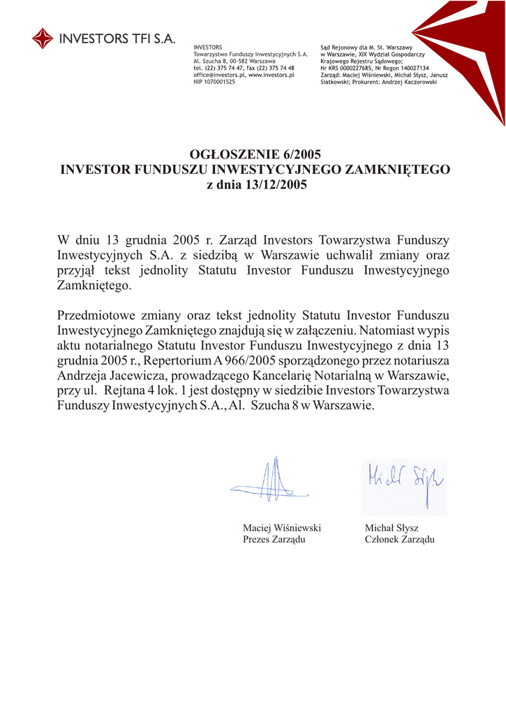 OG£OSZENIE 6/2005 INVESTOR FUNDUSZU INWESTYCYJNEGO ZAMKNIÊTEGO z dnia 13/12/2005 W dniu 13 grudnia 2005 r. Zarz¹d Investors Towarzystwa Funduszy Inwestycyjnych S.A. z siedzib¹ w Warszawie uchwali³ zmiany oraz przyj¹³ tekst jednolity Statutu Investor Funduszu Inwestycyjnego Zamkniêtego. Przedmiotowe zmiany oraz tekst jednolity Statutu Investor Funduszu Inwestycyjnego Zamkniêtego znajduj¹ siê w za³¹czeniu. Natomiast wypis aktu notarialnego Statutu Investor Funduszu Inwestycyjnego z dnia 13 grudnia 2005 r., Repertorium A 966/2005 sporz¹dzonego przez notariusza Andrzeja Jacewicza, prowadz¹cego Kancelariê Notarialn¹ w Warszawie, przy ul. Rejtana 4 lok. 1 jest dostêpny w siedzibie Investors Towarzystwa Funduszy Inwestycyjnych S.A., Al. Szucha 8 w Warszawie. Maciej Wiœniewski Prezes Zarz¹du Micha³ S³ysz Cz³onek Zarz¹du Zmiana Statutu Investor Funduszu Inwestycyjnego Zamkniętego z dnia 13 grudnia 2005 roku §1. W Statucie Investor Funduszu Inwestycyjnego Zamkniętego wprowadza się następujące zmiany: 1) w art. 21 w ust. 1 zdanie „Inwestycje Funduszu w wymienione rodzaje aktywów stanowią minimum 80% wartości Aktywów Netto Funduszu.” otrzymuje brzmienie „Inwestycje Funduszu w wymienione rodzaje aktywów wraz z należnościami z tytułu ich sprzedaży w sytuacji, gdy takie należności powstają, w tym w szczególności wraz z należnościami z tytułu sprzedaży papierów wartościowych, a także wraz z należnościami z tytułu transakcji przy zobowiązaniu się drugiej strony do odkupu (buy sell back), stanowią minimum 80% wartości Aktywów Netto Funduszu.”, 2) art. 21 w ust. 2 otrzymuje brzmienie: „2. Fundusz może lokować w portfel instrumentów pochodnych notowanych na rynku regulowanym na terytorium Rzeczypospolitej Polskiej lub na zagranicznym rynku regulowanym, opiewających na: indeksy giełdowe, akcje, waluty, bony, obligacje i stopy procentowe, metale i energię. W celu zwiększenia rentowności portfela inwestycyjnego Fundusz lokuje do 20% Aktywów Netto Funduszu, (rozumianych jako wartość depozytów zabezpieczających i premii opcji według cen nabycia), w portfel wystandaryzowanych instrumentów pochodnych notowanych na rynkach regulowanych – kontraktów terminowych (futures) i opcji.”, 3) art. 21 ust. 3 skreśla się, 4) w art. 21 w ust. 4 po zdaniu „W przypadku instrumentów pochodnych opiewających na indeks Fundusz będzie brał głównie pod uwagę tempo wzrostu gospodarczego, dynamikę wzrostu zysków spółek giełdowych, wskaźniki wyceny rynkowej spółek.” dodaje się zdanie „W przypadku instrumentów pochodnych opiewających na akcje Fundusz będzie brał głównie pod uwagę trendy rynkowe, sytuację fundamentalną spółki, dynamikę wzrostu zysków spółki, wskaźniki wyceny rynkowej spółki.”, 5) w art. 21 w ust. 4 przed słowem „obligacje” dodaje się słowo „bony,”, 6) w art. 22 w ust. 2 po słowach „tytuły uczestnictwa emitowane przez instytucje wspólnego inwestowania” dodaje się słowa „, wraz z należnościami z tytułu sprzedaży wszystkich powyższych instrumentów w sytuacji, gdy takie należności powstają, w tym w szczególności wraz z należnościami z tytułu sprzedaży papierów wartościowych, a także wraz z należnościami z tytułu transakcji przy zobowiązaniu się drugiej strony do odkupu (buy sell back),”, 7) w art. 22 w ust. 9 pkt 1 słowa „(sprzedaż kontraktów” zastępuje się słowami „(np. sprzedaż kontraktów”, 8) w art. 22 w ust. 9 w pkt 1 po zdaniu zaczynającym się od słów „W sytuacji, gdy” dodaje się zdania w następującym brzmieniu: „Za zabezpieczenie uznaje się zarówno zabezpieczenie ryzyka całkowitego, jak również zabezpieczenie wyłącznie ryzyka specyficznego lub wyłącznie ryzyka systematycznego danego instrumentu lub portfela instrumentów, w tym w szczególności za zabezpieczenie 1 ryzyka systematycznego (Beta) mierzonego w odniesieniu do określonego indeksu uznaje się sprzedaż odpowiedniej liczby kontraktów na ten indeks (np. zabezpieczenie portfela polskich akcji za pomocą kontraktów na indeks WIG20). Za zabezpieczenie ryzyka kursowego uznaje się także zabezpieczenie krzyżowe z wykorzystaniem waluty pośredniej (np. za zabezpieczenie ryzyka kursowego akcji denominowanych w dolarach kanadyjskich uznaje się zabezpieczenie krzyżowe dolary kanadyjskie/dolary amerykańskie oraz dolary amerykańskie/polski złoty). Ponadto, wszystkie zabezpieczenia mogą dotyczyć zarówno bieżących jak i przyszłych aktywów, pasywów lub przepływów pieniężnych Funduszu.”, 9) w art. 22 w ust. 9 w pkt 1 zdania „Instrumenty pochodne zawierane w celach zabezpieczenia Aktywów Funduszu mogą zabezpieczać do 100% Aktywów Netto Funduszu. Do nabywanych w tym celu instrumentów pochodnych nie stosuje się limitów inwestycyjnych wymienionych poniżej w pkt 2), w ust. 2 i 10 oraz wymienionych w Art. 21 ust.1-3 Statutu.” zastępuje się zdaniami w następującym brzmieniu: „Instrumenty pochodne zawierane w celach zabezpieczenia mogą zabezpieczać do 100% zabezpieczanych, zarówno bieżących jak i przyszłych, aktywów, pasywów lub przepływów pieniężnych Funduszu. Do nabywanych w tym celu instrumentów pochodnych nie stosuje się limitów inwestycyjnych wymienionych poniżej w pkt 2) oraz w art. 21 ust.1-2 Statutu.”, 10) w art. 22 w ust. 9 w pkt 2 w lit. c przed słowem „obligacje” dodaje się słowo „bony,”, 11) w art. 22 w ust. 9 w pkt 2 w lit. e kropkę na końcu słowa „energię” zastępuje się przecinkiem, 12) w art. 22 w ust. 9 w pkt 2 po lit. e dodaje się lit. f w brzmieniu: „f) akcje.”, 13) w art. 22 w ust. 9 na końcu ostatniego zdania skreśla się cudzysłów i następującą po nim kropkę, 14) art. 22 ust. 10 skreśla się, 15) w art. 22 w ust. 13 w pkt 2 ostatnie zdanie otrzymuje brzmienie: „Przy ocenie oferty Depozytariusza Towarzystwo zbiera i przechowuje oferty przynajmniej trzech b