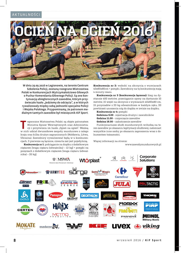A K T UA L N O Ś C I OGIEŃ NA OGIEŃ 2016 W dniu 29.09.2016 w Legionowie, na terenie Centrum Szkolenia Policji, zostaną rozegrane Mistrzostwa Polski w Konkurencjach Wytrzymałościowo-Siłowych o Puchar Komendanta Głównego Policji. Są one kontynuacją ubiegłorocznych zawodów, którym przyświecało hasło „Jedziemy do odcięcia”, a w których rywalizowały między sobą jednostki specjalne Policji i Wojska Polskiego. Przypominamy, że patronem medialnym tamtych zawodów był miesięcznik KiF Sport. T egoroczne Mistrzostwa Polski są objęte patronatem Ministra Spraw Wewnętrznych oraz Administracji i przyświeca im hasło „Ogień na ogień”. Wezmą w nich udział dwuosobowe zespoły mundurowe z całego kraju oraz kilka drużyn zagranicznych (Mołdawia, Litwa, Ukraina). Zawodnicy rywalizować będą w 4 konkurencjach, 3 pierwsze są łączone, czwarta zaś jest pojedyńczą. Konkurencja nr 1: podciąganie na drążku z dodatkowym ciężarem [waga ciężaru (odważnika) – 12 kg] + pompki na poręczach z dodatkowym ciężarem [waga ciężaru (odważnika) – 20 kg]. 8 Konkurencja nr 2: wskoki na skrzynię o wymiarach 40x60x80cm + pompki. Zawodnicy na tę konkurencję mają 4 minuty czasu. Konkurencja nr 3 (konkurencja łączona): bieg na dystansie 400 metrów, przeciąganie opony na dystansie 10 metrów, 15 wejść na skrzynie o wymiarach 40x60x80 cm, 15 przysiadów z 20 kg odważnikiem w każdym ręku, 20 powtórzeń unoszenia nóg do drążka w zwisie na drążku. Konkurencja nr 4: pompki Godzinna 9.00 - rejestracja drużyn i zawodników Godzina 11.00 – rozpoczęcie zawodów Godzina 16.00 – zakończenie zawodów Funkcjonariusze służb mundurowych wchodzą na teren zawodów po okazaniu legitymacji służbowej, natomiast wszystkie inne osoby po okazaniu zaproszenia wraz z dokumentem tożsamości. Więcej informacji na stronie: www.zawodymundurowych.pl wrzesień 2016 / KiF Sport