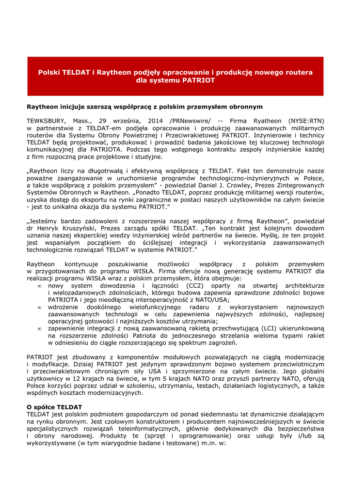 Polski TELDAT i Raytheon podjęły opracowanie i produkcję nowego routera dla systemu PATRIOT Raytheon inicjuje szerszą współpracę z polskim przemysłem obronnym TEWKSBURY, Mass., 29 września, 2014 /PRNewswire/ -- Firma Ryatheon (NYSE:RTN) w partnerstwie z TELDAT-em podjęła opracowanie i produkcję zaawansowanych militarnych routerów dla Systemu Obrony Powietrznej i Przeciwrakietowej PATRIOT. Inżynierowie i technicy TELDAT będą projektować, produkować i prowadzić badania jakościowe tej kluczowej technologii komunikacyjnej dla PATRIOTA. Podczas tego wstępnego kontraktu zespoły inżynierskie każdej z firm rozpoczną prace projektowe i studyjne. „Raytheon liczy na długotrwałą i efektywną współpracę z TELDAT. Fakt ten demonstruje nasze poważne zaangażowanie w uruchomienie programów technologiczno-inżynieryjnych w Polsce, a także współpracę z polskim przemysłem” - powiedział Daniel J. Crowley, Prezes Zintegrowanych Systemów Obronnych w Raytheon. „Ponadto TELDAT, poprzez produkcję militarnej wersji routerów, uzyska dostęp do eksportu na rynki zagraniczne w postaci naszych użytkowników na całym świecie - jest to unikalna okazja dla systemu PATRIOT.” „Jesteśmy bardzo zadowoleni z rozszerzenia naszej współpracy z firmą Raytheon”, powiedział dr Henryk Kruszyński, Prezes zarządu spółki TELDAT. „Ten kontrakt jest kolejnym dowodem uznania naszej eksperckiej wiedzy inżynierskiej wśród partnerów na świecie. Myślę, że ten projekt jest wspaniałym początkiem do ściślejszej integracji i wykorzystania zaawansowanych technologicznie rozwiązań TELDAT w systemie PATRIOT.” Raytheon kontynuuje poszukiwanie możliwości współpracy z polskim przemysłem w przygotowaniach do programu WISŁA. Firma oferuje nową generację systemu PATRIOT dla realizacji programu WISŁA wraz z polskim przemysłem, która obejmuje: • nowy system dowodzenia i łączności (CC2) oparty na otwartej architekturze i wielozadaniowych zdolnościach, którego budowa zapewnia sprawdzone zdolności bojowe PATRIOTA i jego nieodłączną interoperacyjność z NATO/USA; • wdrożenie dookólnego wielofunkcyjnego radaru z wykorzystaniem najnowszych zaawansowanych technologii w celu zapewnienia najwyższych zdolności, najlepszej operacyjnej gotowości i najniższych kosztów utrzymania; • zapewnienie integracji z nową zaawansowaną rakietą przechwytującą (LCI) ukierunkowaną na rozszerzenie zdolności Patriota do jednoczesnego strzelania wieloma typami rakiet w odniesieniu do ciągle rozszerzającego się spektrum zagrożeń. PATRIOT jest zbudowany z komponentów modułowych pozwalających na ciągłą modernizację i modyfikacje. Dzisiaj PATRIOT jest jedynym sprawdzonym bojowo systemem przeciwlotniczym i przeciwrakietowym chroniącym siły USA i sprzymierzone na całym świecie. Jego globalni użytkownicy w 12 krajach na świecie, w tym 5 krajach NATO oraz przyszli partnerzy NATO, oferują Polsce korzyści poprzez udział w szkoleniu, utrzymaniu, testach, działaniach logistycznych, a także wspólnych kosztach modernizacyjnych. O spółce TELDAT TELDAT jest polskim podmiotem gospodarczym od ponad siedemnastu lat dynamicznie działającym na rynku obronnym. Jest czołowym konstruktorem i producentem najnowocześniejszych w świecie specjalistycznych rozwiązań teleinformatycznych, głównie dedykowanych dla bezpieczeństwa i obrony narodowej. Produkty te (sprzęt i oprogramowanie) oraz usługi były i/lub są wykorzystywane (w tym wiarygodnie badane i testowane) m.in. w: • • • Kilkuset garnizonach, jednostkach i instytucjach wojskowych oraz na teatrach działań w: Afganistanie, Kongo, Czadzie, na Bałkanach i krajach nadbałtyckich; Wszystkich najważniejszych ćwiczeniach organizowanych (w Europie i USA) przez Siły Zbrojne RP, NATO i U.S. European Command (Dowództwo Wojsk Amerykańskich w Europie), np. w kolejnych edycjach Międzynarodowych Warsztatów Interoperacyjności pk.: Combined Endeavor, NATO CWID, NATO CWIX oraz Bold Quest; Laboratoriach badawczych, np. w: Agencji NCI (NATO Communications and Information Agency) / NATO C3 Agency w Hadze oraz CELAR we Francji. O firmie Raytheon Raytheon, ze sprzedażą w 2013 r. w wysokości 24 mld dolarów oraz zatrudnieniem 63 tyś pracowników na całym świecie, jest liderem w dziedzinie technologii i innowacji, specjalizującym się w obronności, bezpieczeństwie i dostarczającym rozwiązania na globalne rynki cywilne. Z historią innowacyjności sięgającą 92 lat, Raytheon zapewnia najwyższej jakości elektronikę, integrację systemów i inne możliwości w obszarach detekcji, systemów C4I, a także bezpieczeństwa cybernetycznego i szerokiego zakresu wspierania misji. Raytheon posiada siedzibę główną w Waltham, Massachusetts. Więcej informacji o Raytheon na stronie www.raytheon.com oraz na Twitterze @Raytheon. Kontakt medialny Bailey Sargent +1.978.858.1711 [email protected] Źródło: Raytheon Company http://raytheon.mediaroom.com/index.php?s=43&item=2647